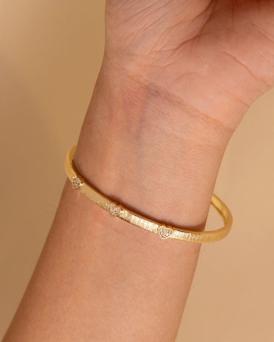 A slender band etched with delicate heart-shaped striations, accented by pavé-kissed details that catch the light with every movement. The Amour Bangle is subtle but full of sentiment - a quiet declaration of love, meant to be worn close every day or layered into a stack with meaning.