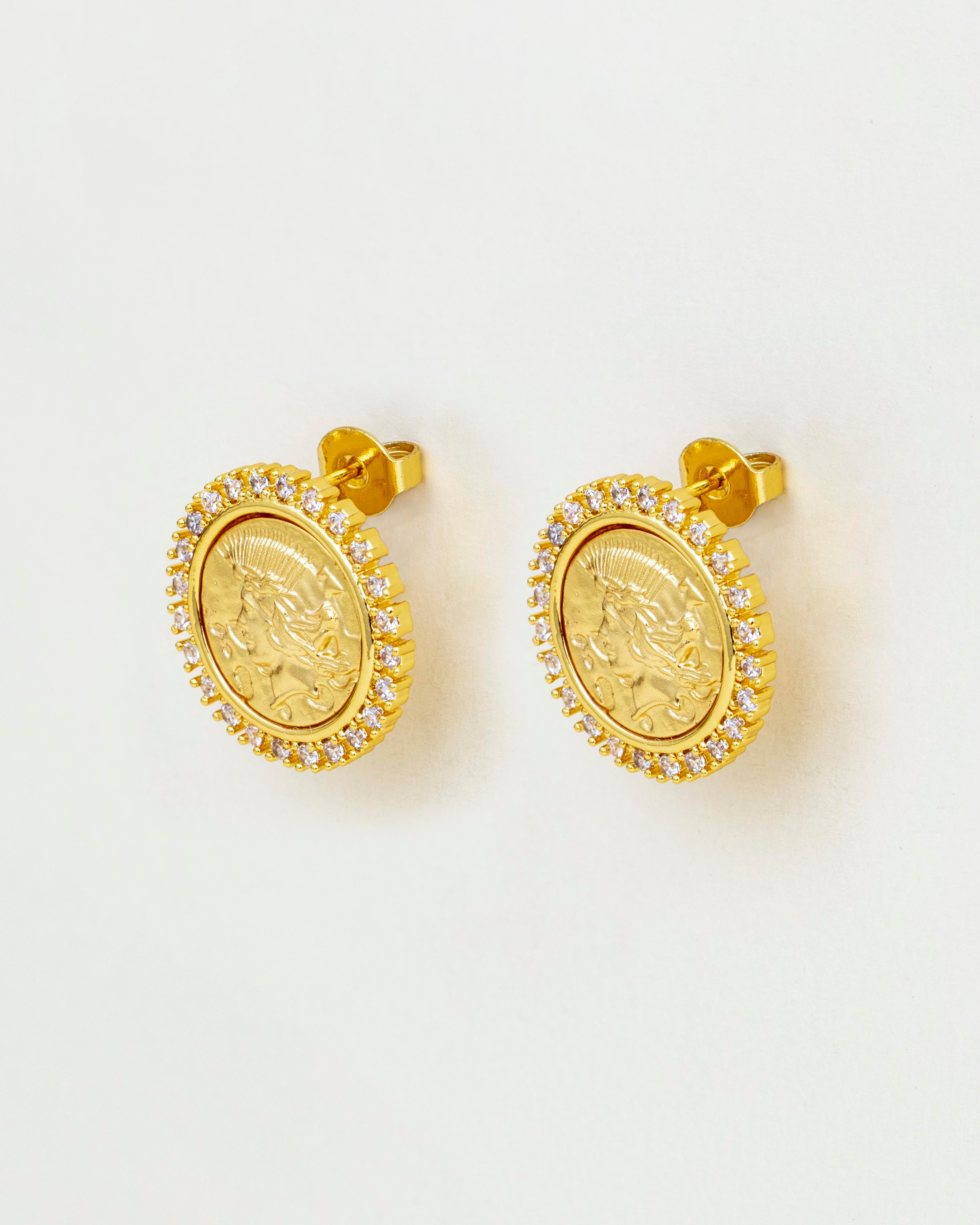 Channel the otherworldliness of ancient Greece with these gold-plated coin studs framed by a halo of shimmering stones. Featuring a detailed depiction of a classical Greek figure adorning a Corinthian helmet, these earrings evoke a sense of meaning and timeless sophistication, allowing you to tell a story through your jewels. Style with an oversized black blazer with hair your tucked in for that streetwear meets high-fashion appeal.