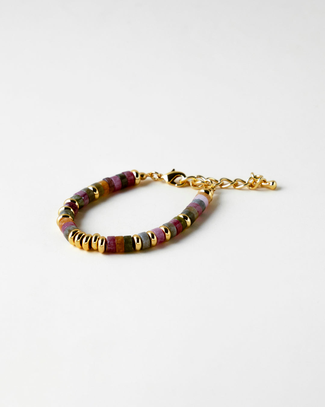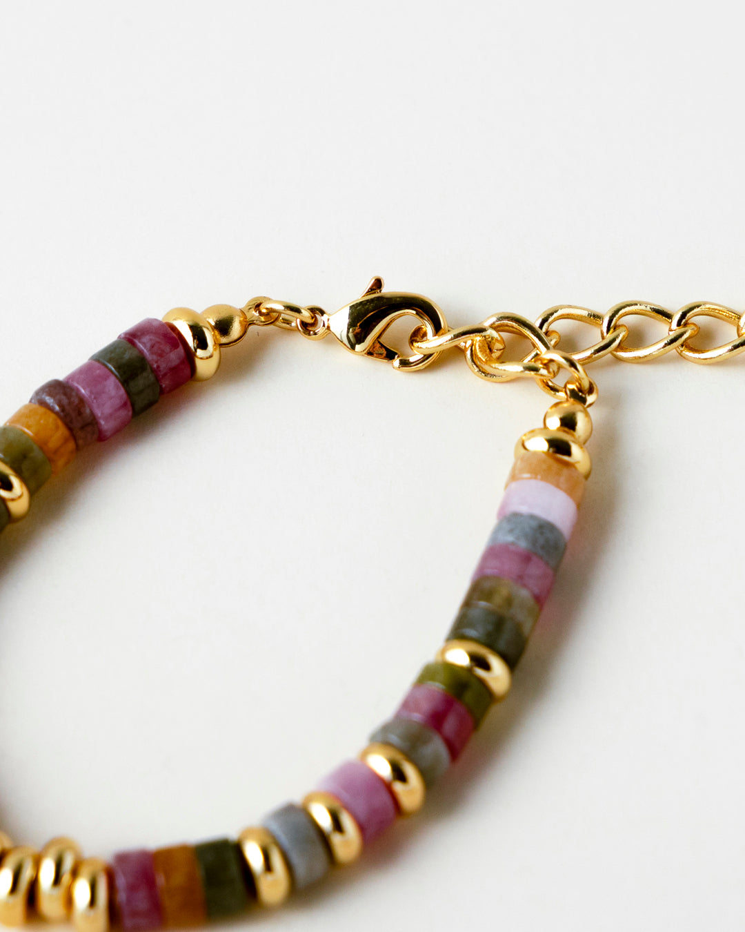 Like a sunrise painted across ancient stone, the Aurora Grounded Bracelet captures the quiet power of contrast - where soft sky-blushed hues meet earthy stillness. Cylindrical gemstone beads, reminiscent of tourmaline, form the body of this bracelet in a delicate symphony of moss greens, dusk purples, amber golds, and rose pinks. Between each shade sits a gold-plated spacer, catching the light like fragments of memory - bright, fleeting, unforgettable.
