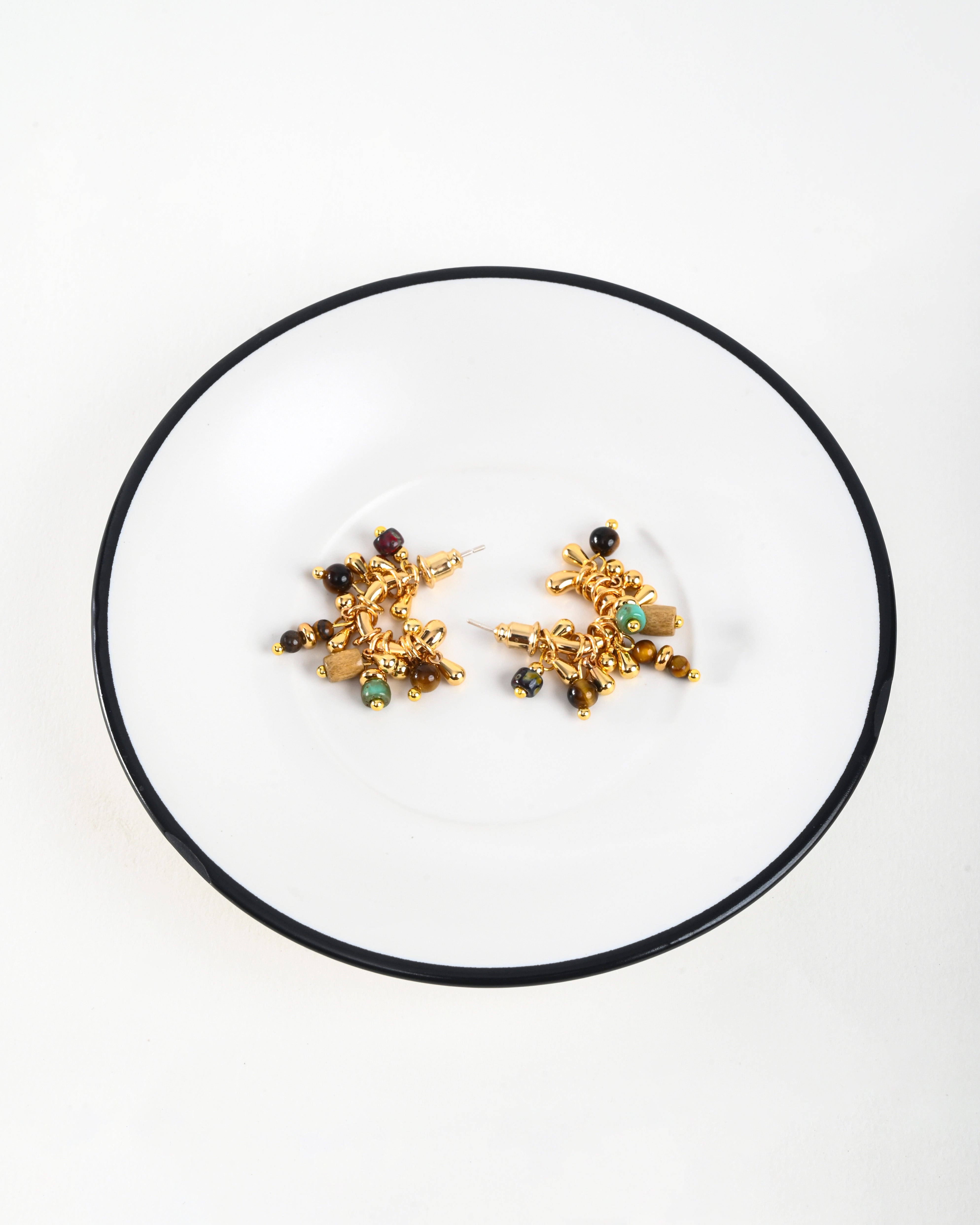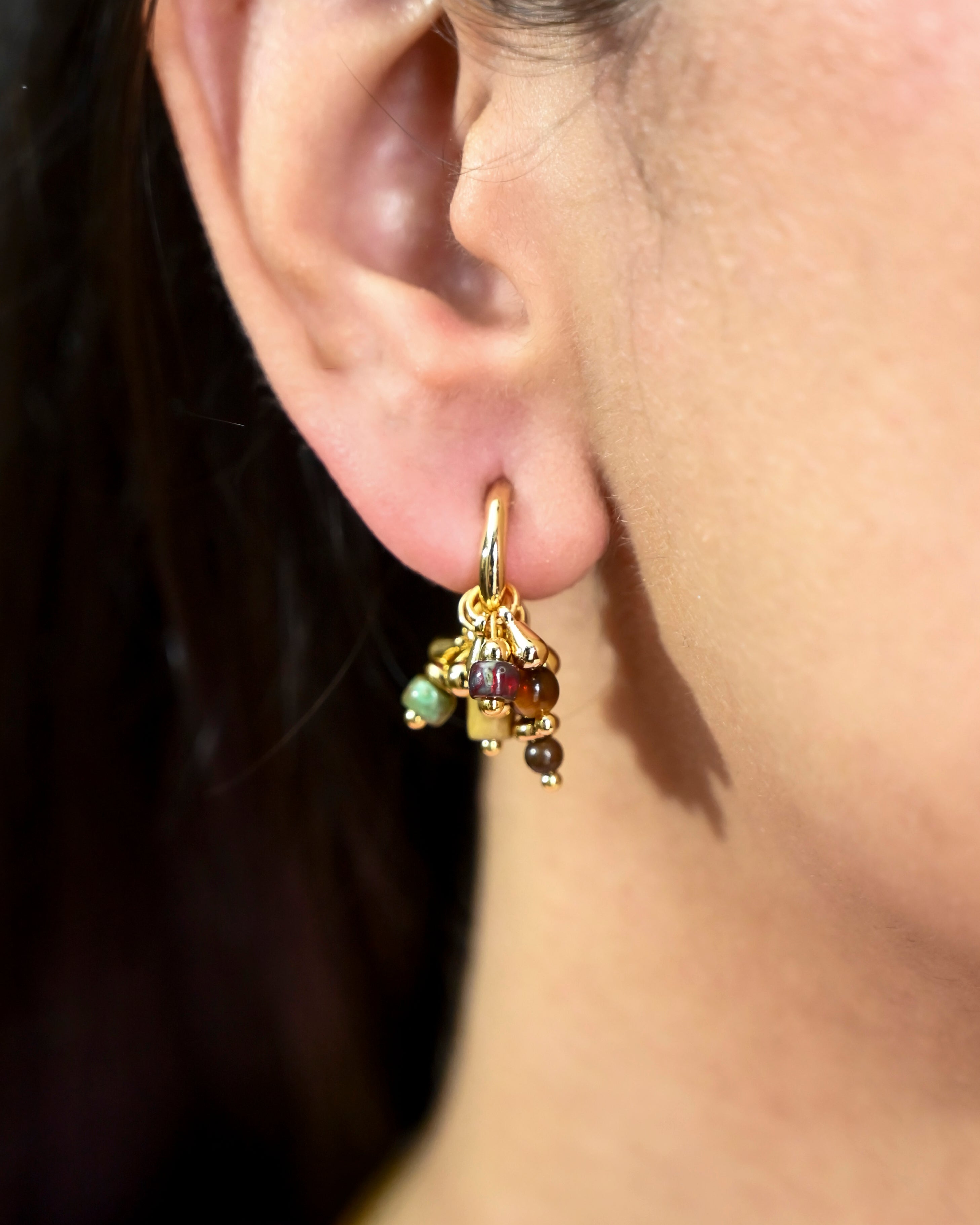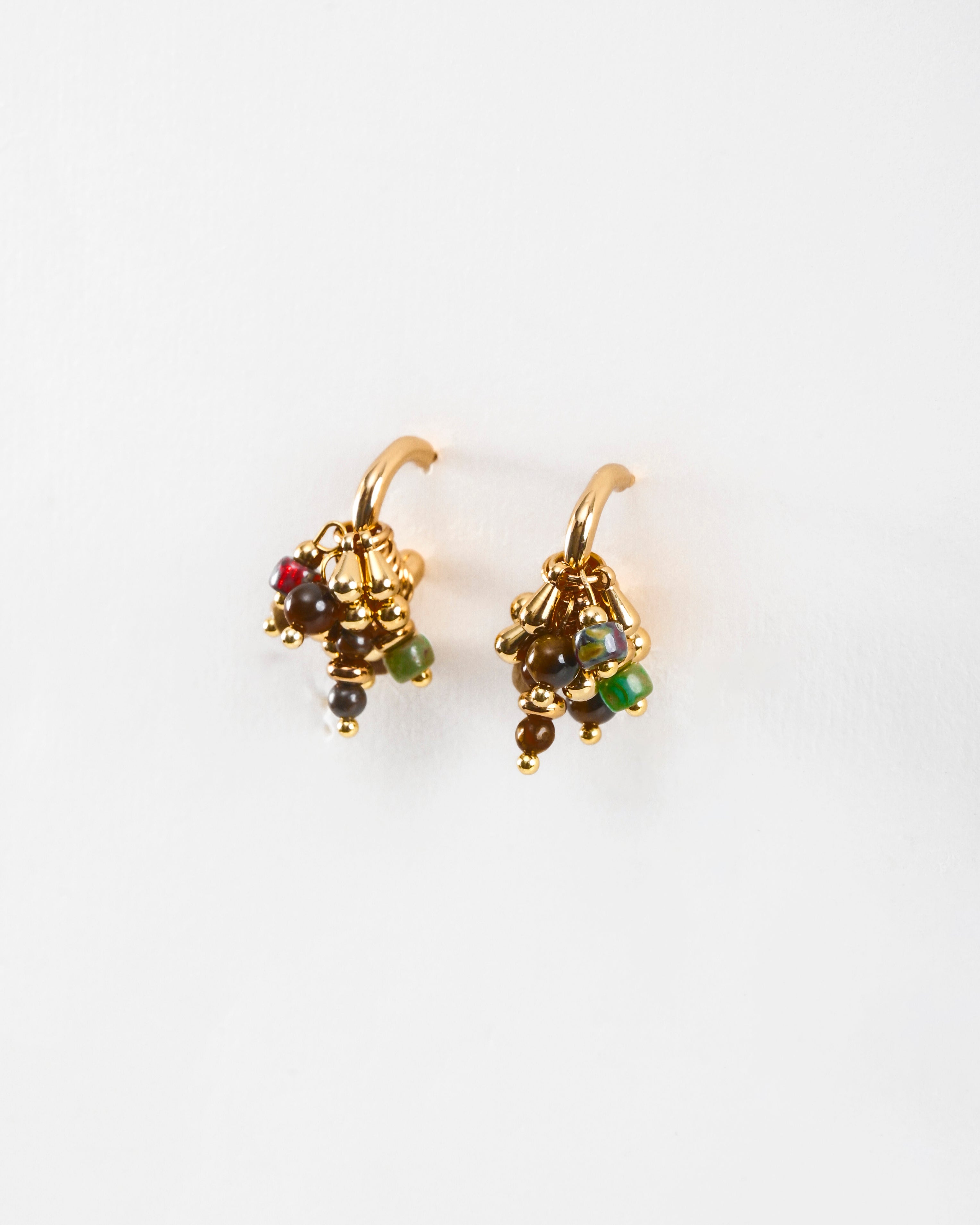 Tiny clusters of multicoloured beads and gold drops, knotted into chunky mini hoops. Lively, textured, and full of movement — like a little festival on your ear.