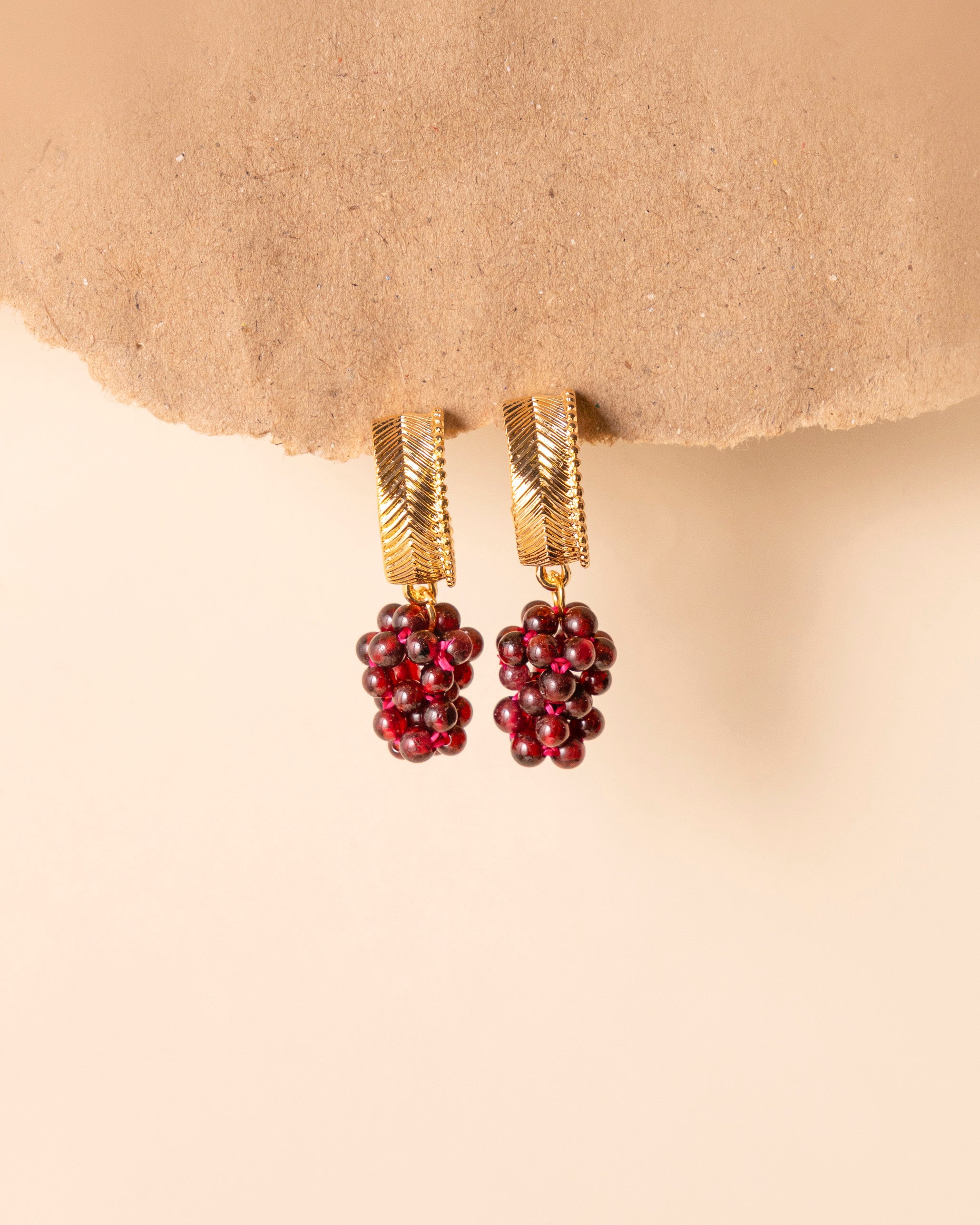 A nod to vintage indulgence, the Bordeaux Hoops blend rich, vine-clustered designs with sculpted gold bands. Their deep red hue catches light like wine in motion - bold, tactile, and irresistibly decadent.