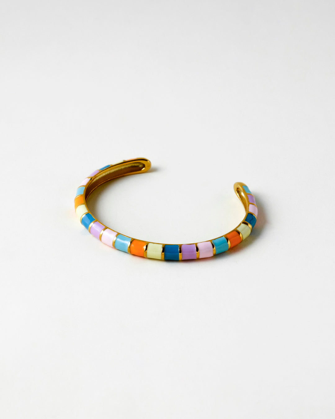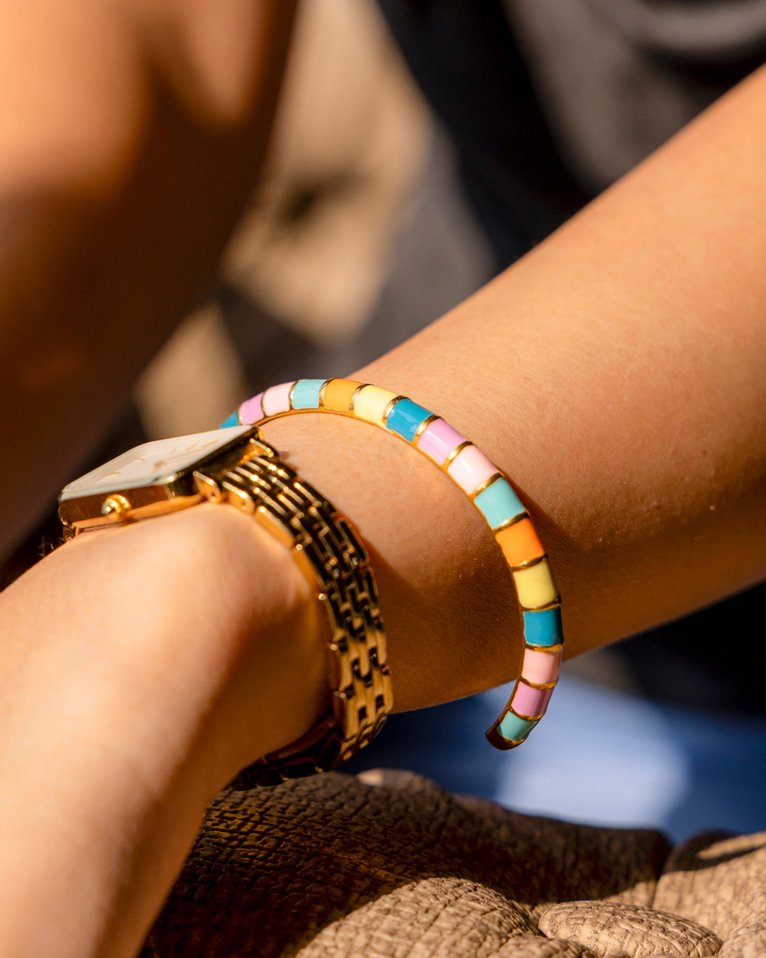 Bright, bite-sized, and bursting with dopamine - the Candy Strip Bangle is your wearable sugar rush. Featuring rainbow enamel tiles in sorbet pastels and punchy brights, this cuff feels like arcade lights, roller skates, and fizzy dreams all at once. Crafted in a classic open-cuff silhouette, this bracelet features a row of colourful enamel inlays set against a sleek gold-plated band. Lightweight yet bold, its flexible fit hugs your wrist with ease