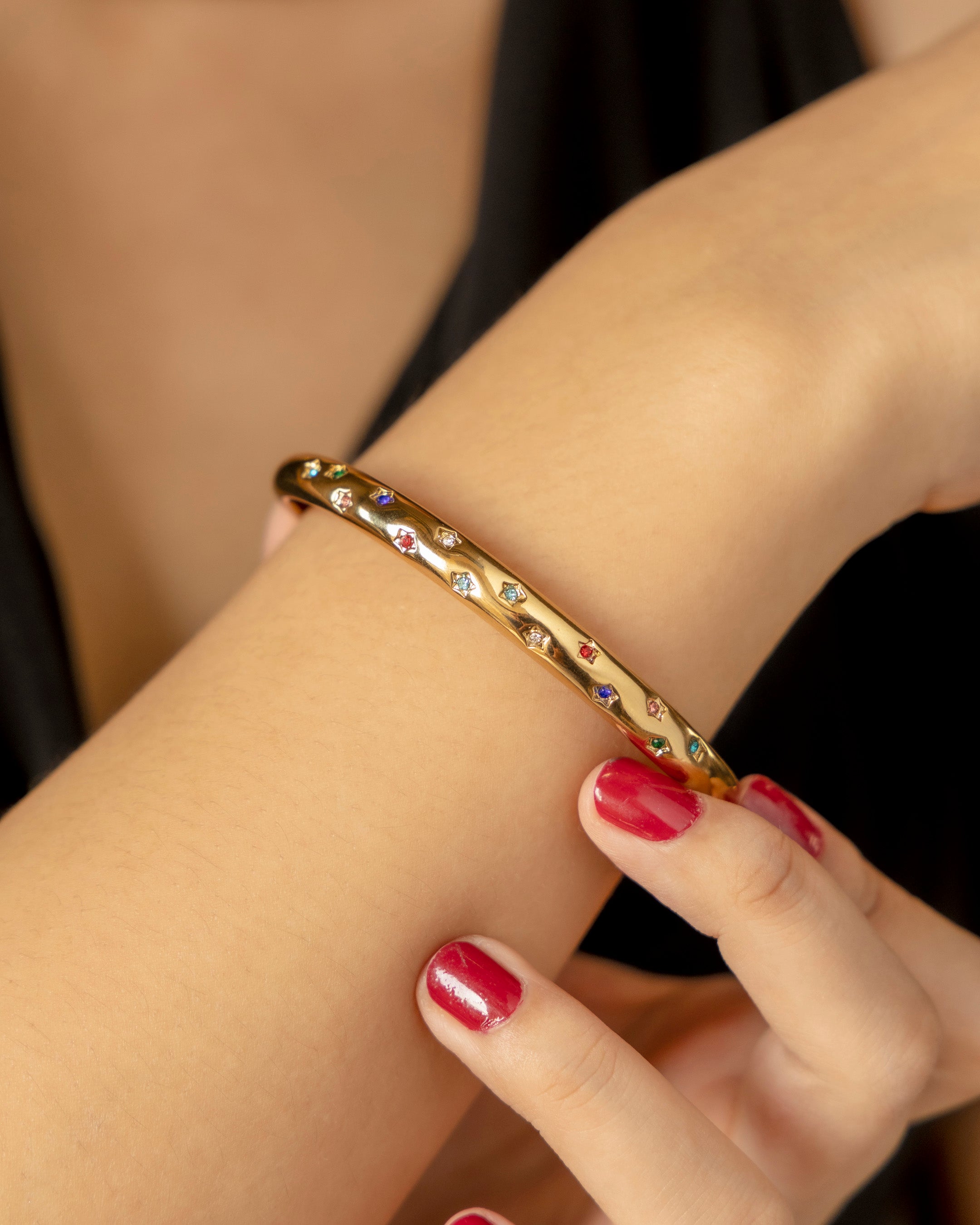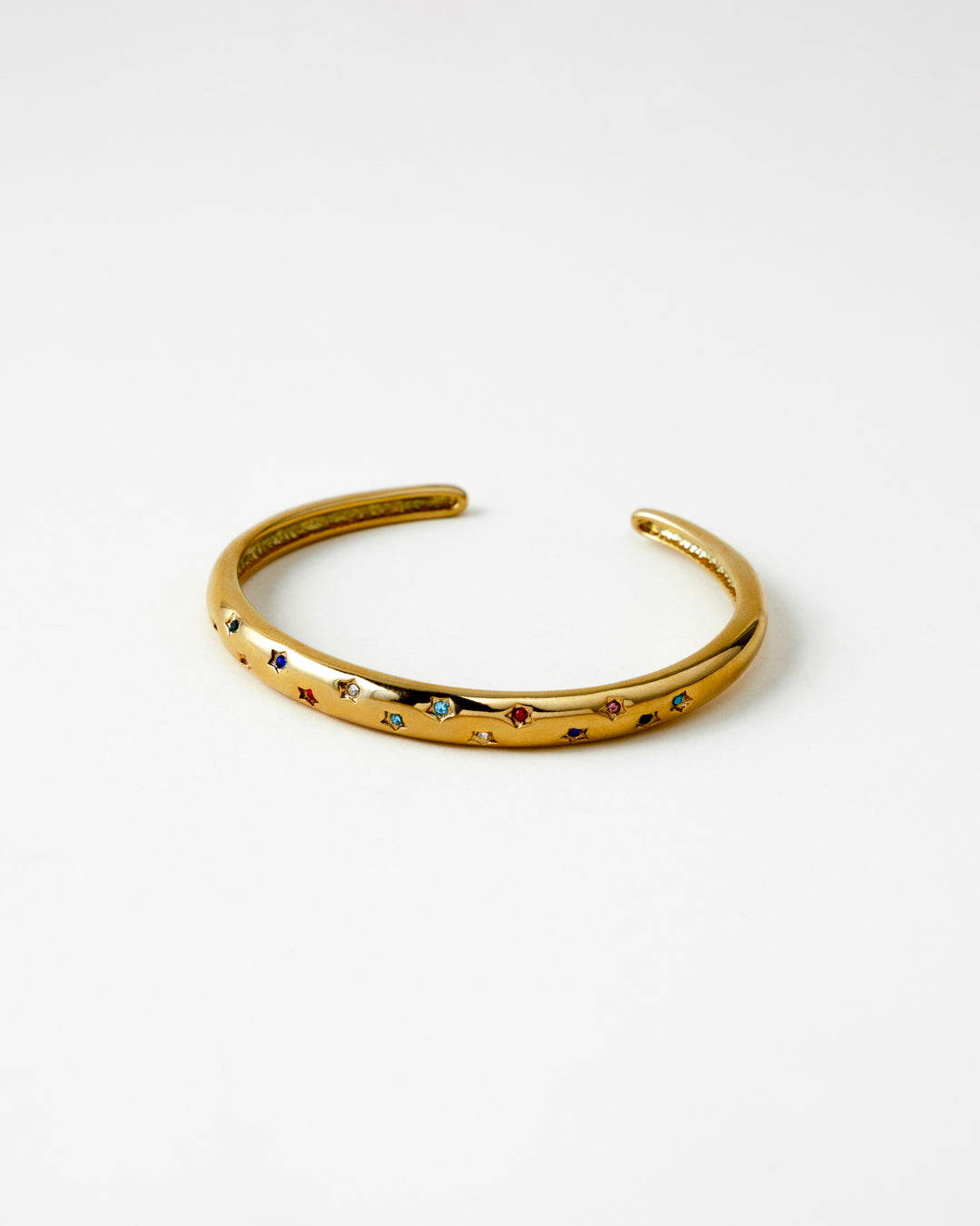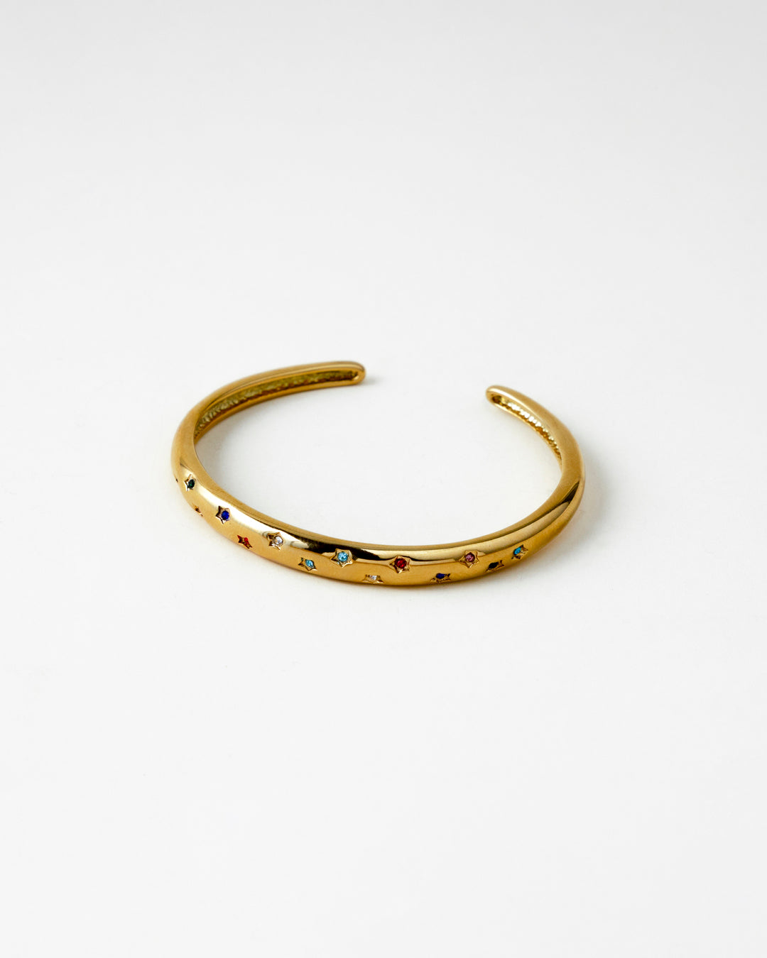 Sculpted from gold-toned metal, this open cuff is dotted with dainty, rainbow-hued crystals — subtle enough for minimalists, spirited enough for colour chasers. The gently tapered ends offer a sleek fit, while the slightly domed body gives it just the right heft.