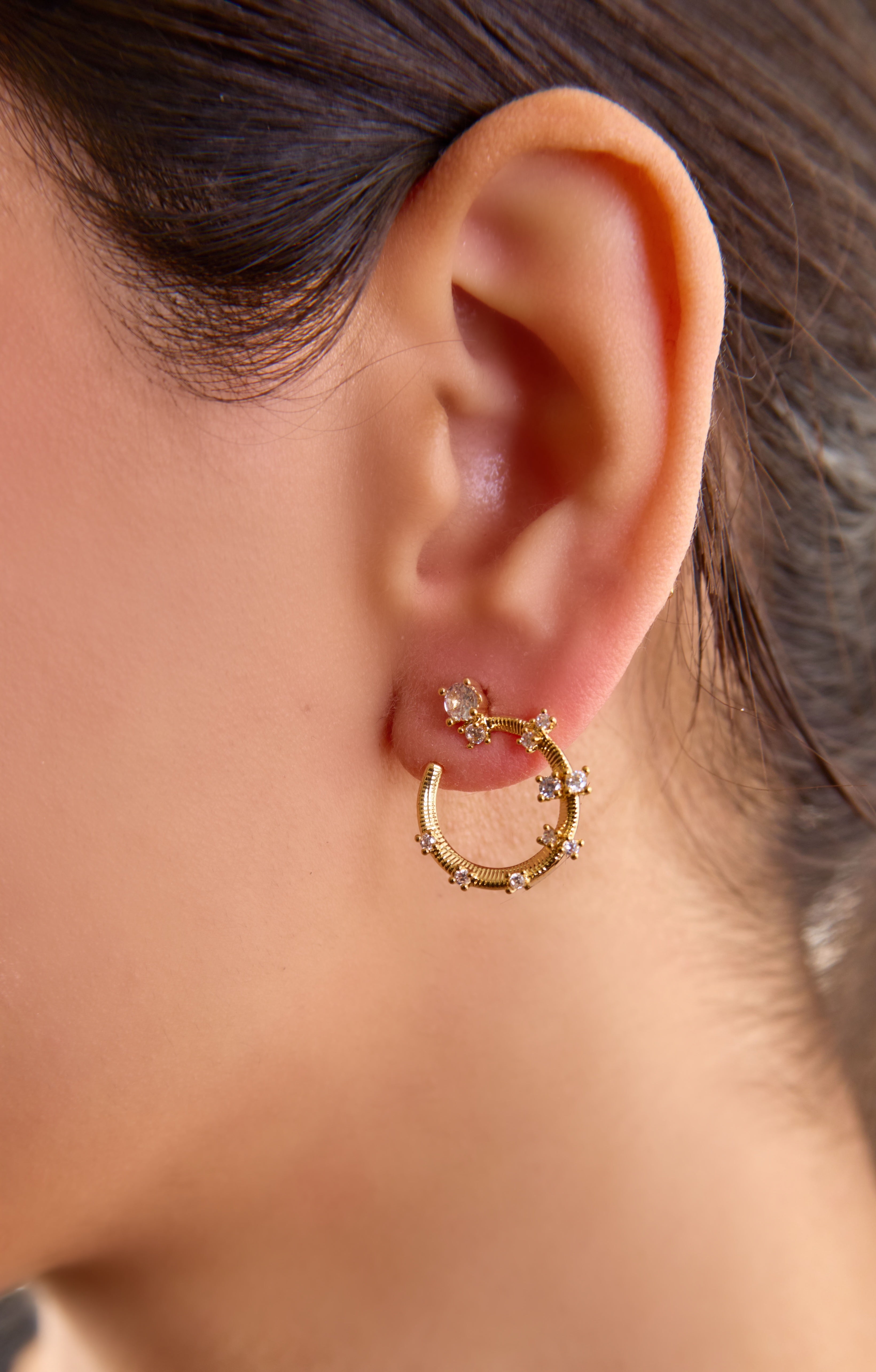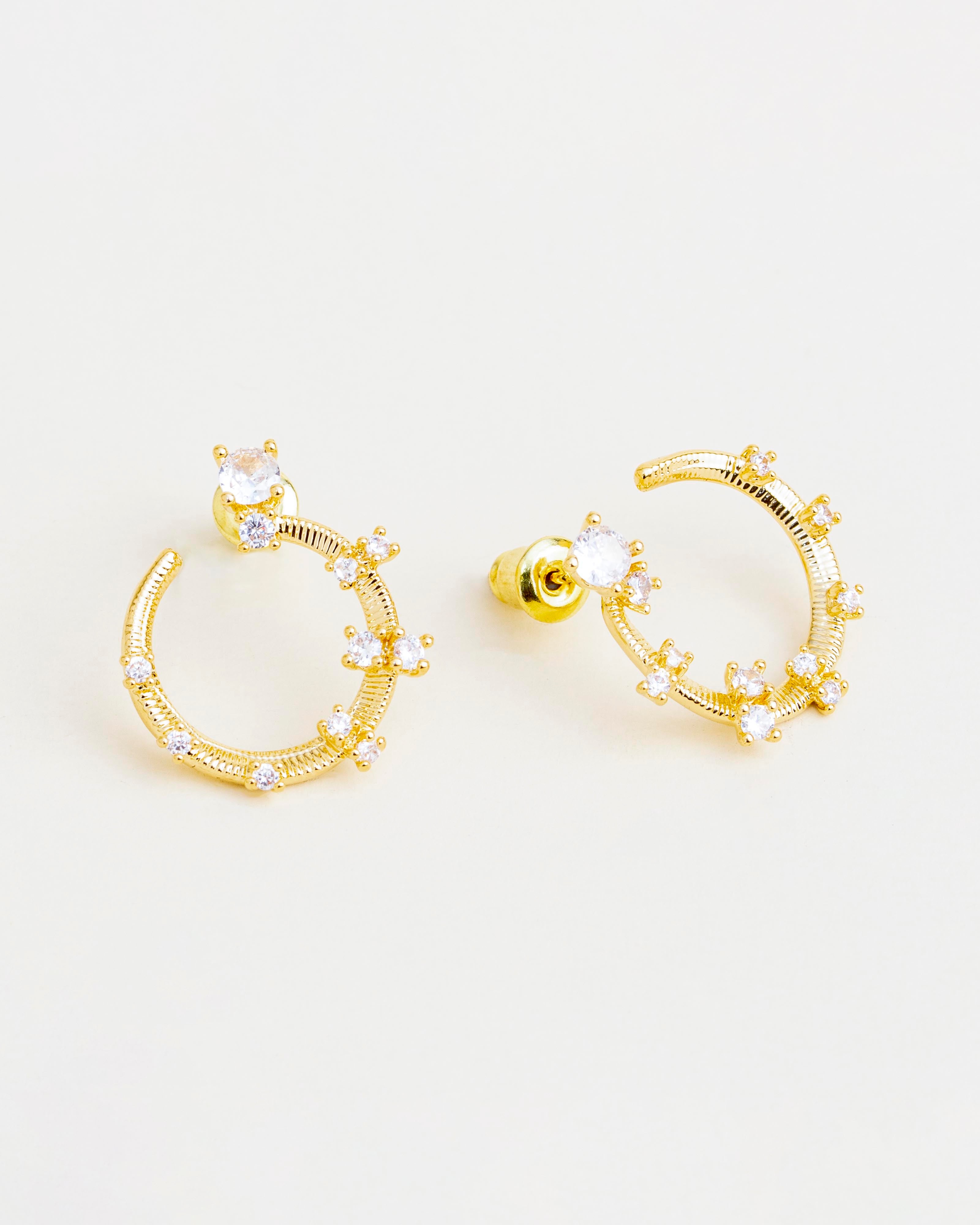 Inspired by the luminous phases of the moon, the celeste crescent studs capture celestial elegance in gold. Delicate arcs are adorned with twinkling crystals, resembling stars scattered across a night sky. Wear them as a reminder that even in transition, there’s always light.