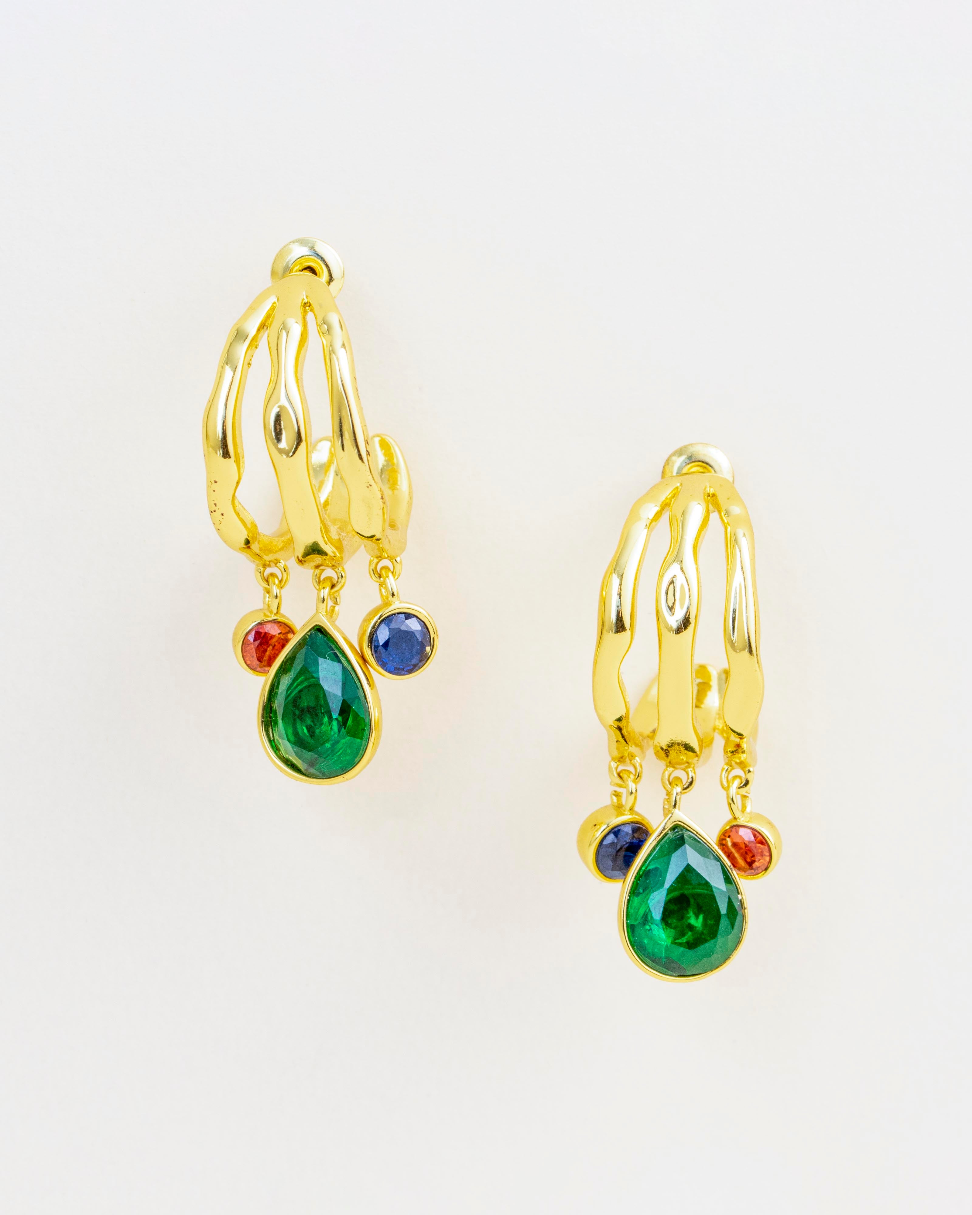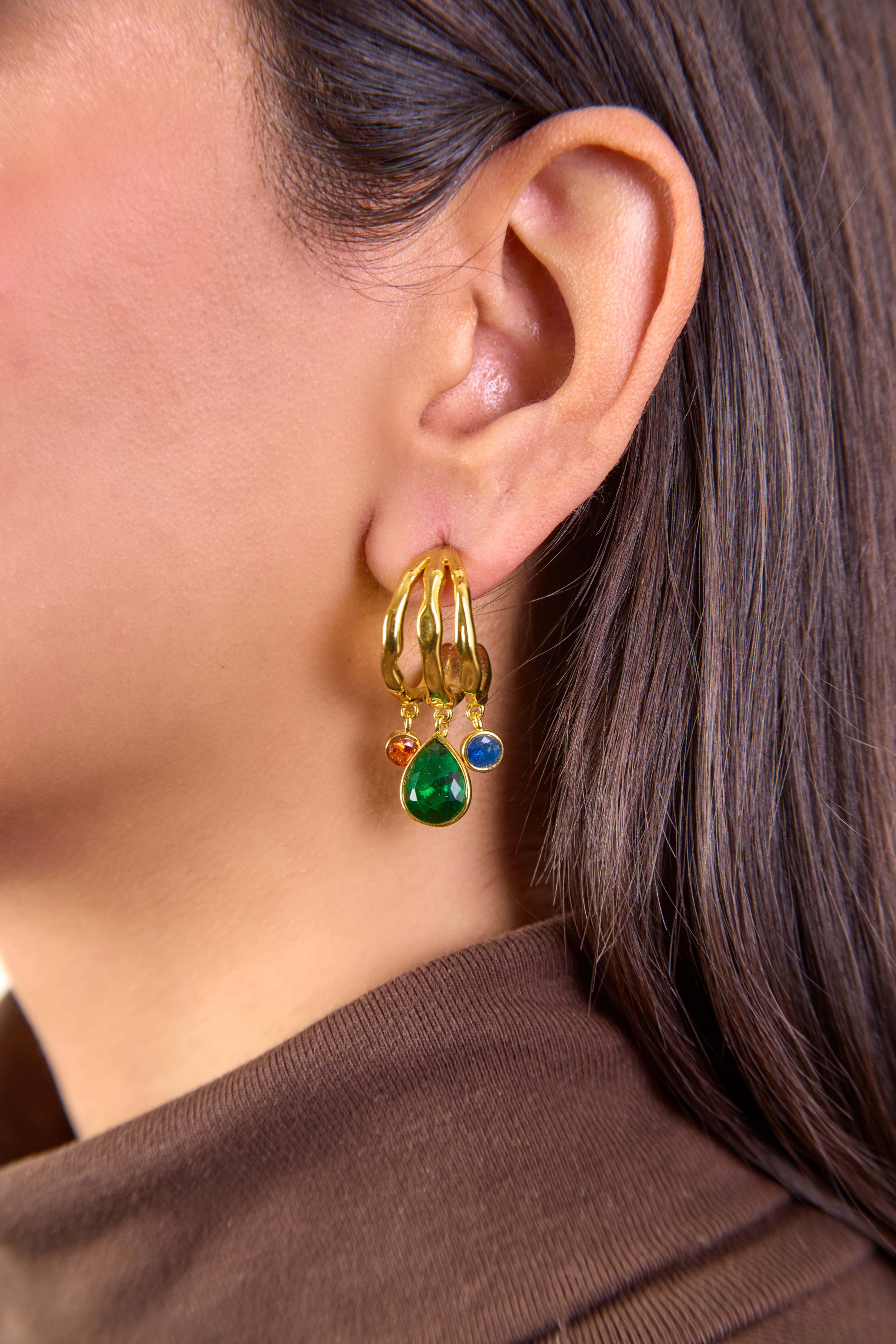 Ethereal meets edgy in these textured gold hoops, adorned with delicate dangling gemstones in rich jewel tones. The layered hoop design adds dimension, while the teardrop gem catches the light with every movement—perfect for making an effortlessly elegant statement. Pair them with a sleek updo and a flowy blouse for a bohemian-chic vibe, or let them elevate a classic black dress for a refined, regal touch.
