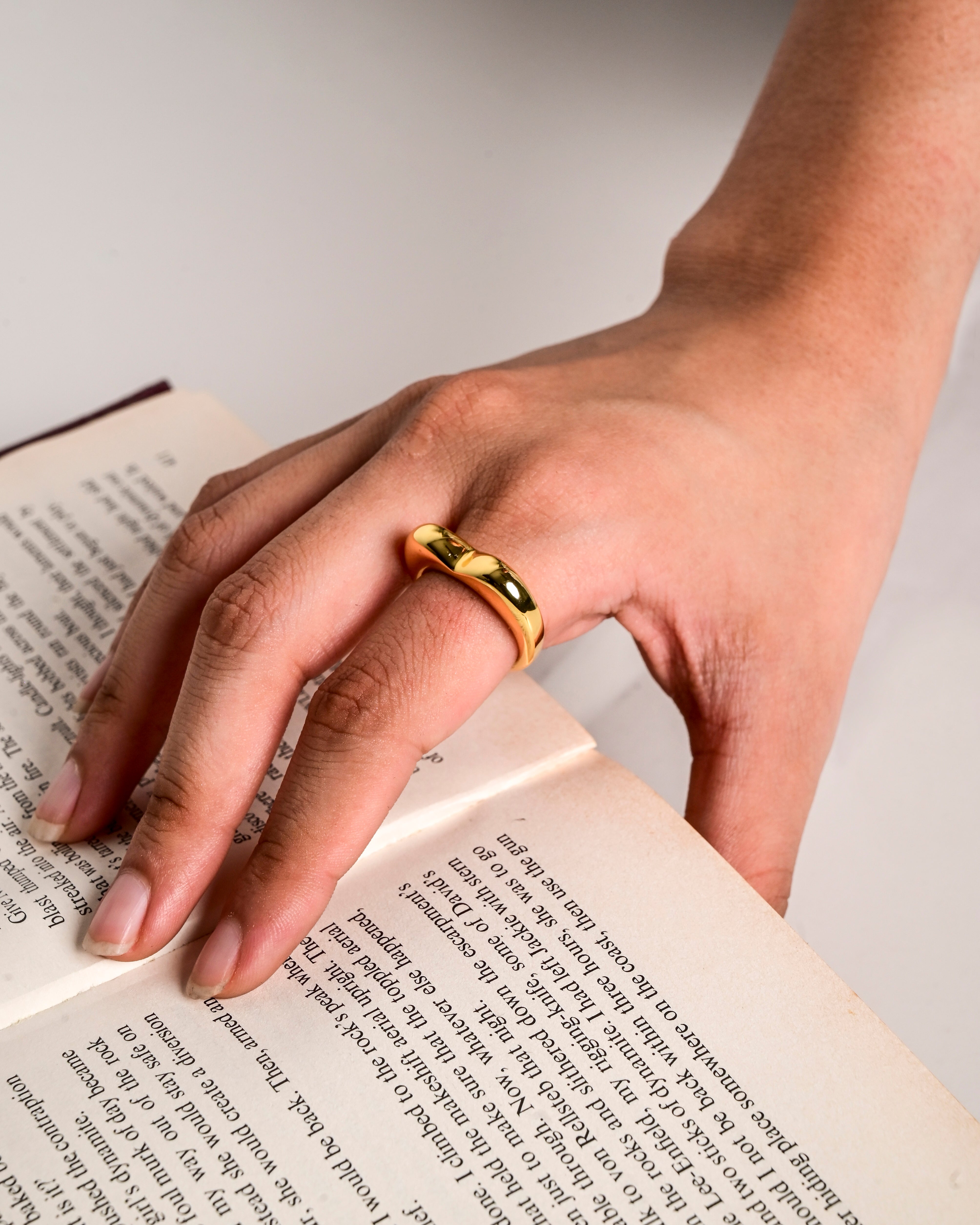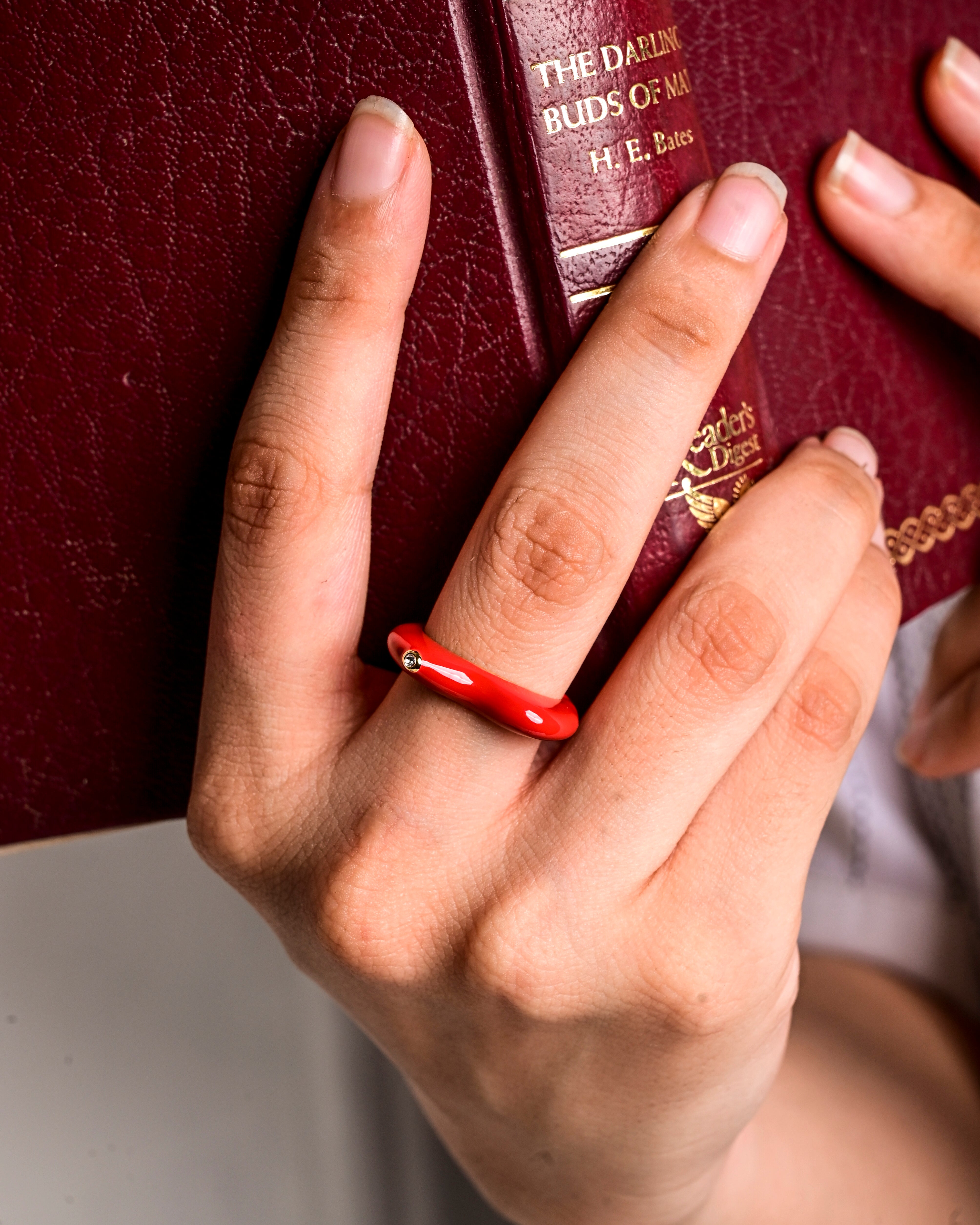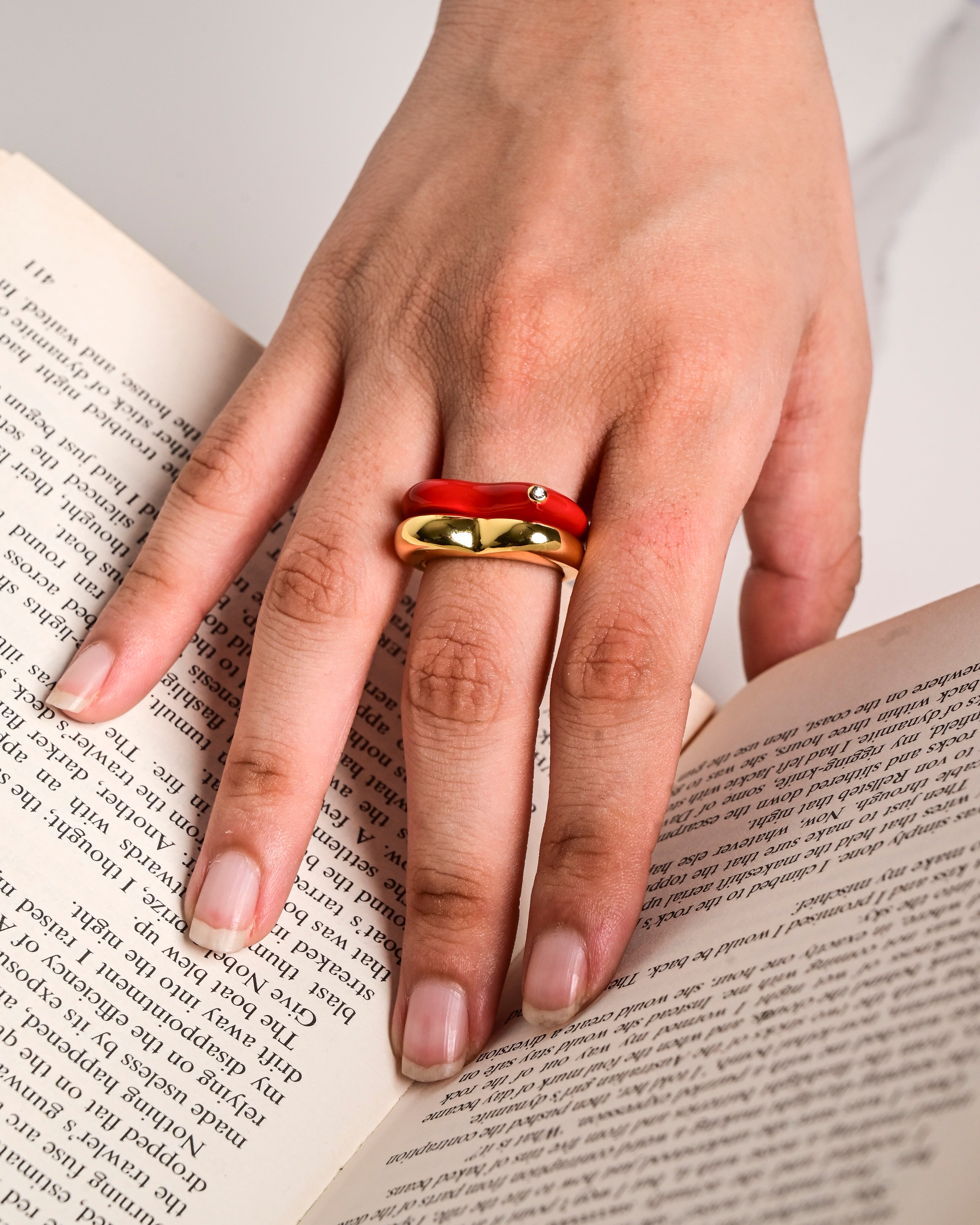 French for darling, the Chérie Ring is just that; a little love letter for your fingers. Designed with a soft heart-shaped peak, this sleek band adds a touch of whimsy to your everyday stack. Available in two radiant finishes: classic gold and cherry red enamel, Chérie is perfect whether you're feeling minimal or bold. Its smooth, domed surface catches the light effortlessly, making it ideal for wearing solo or layering with other playful silhouettes.