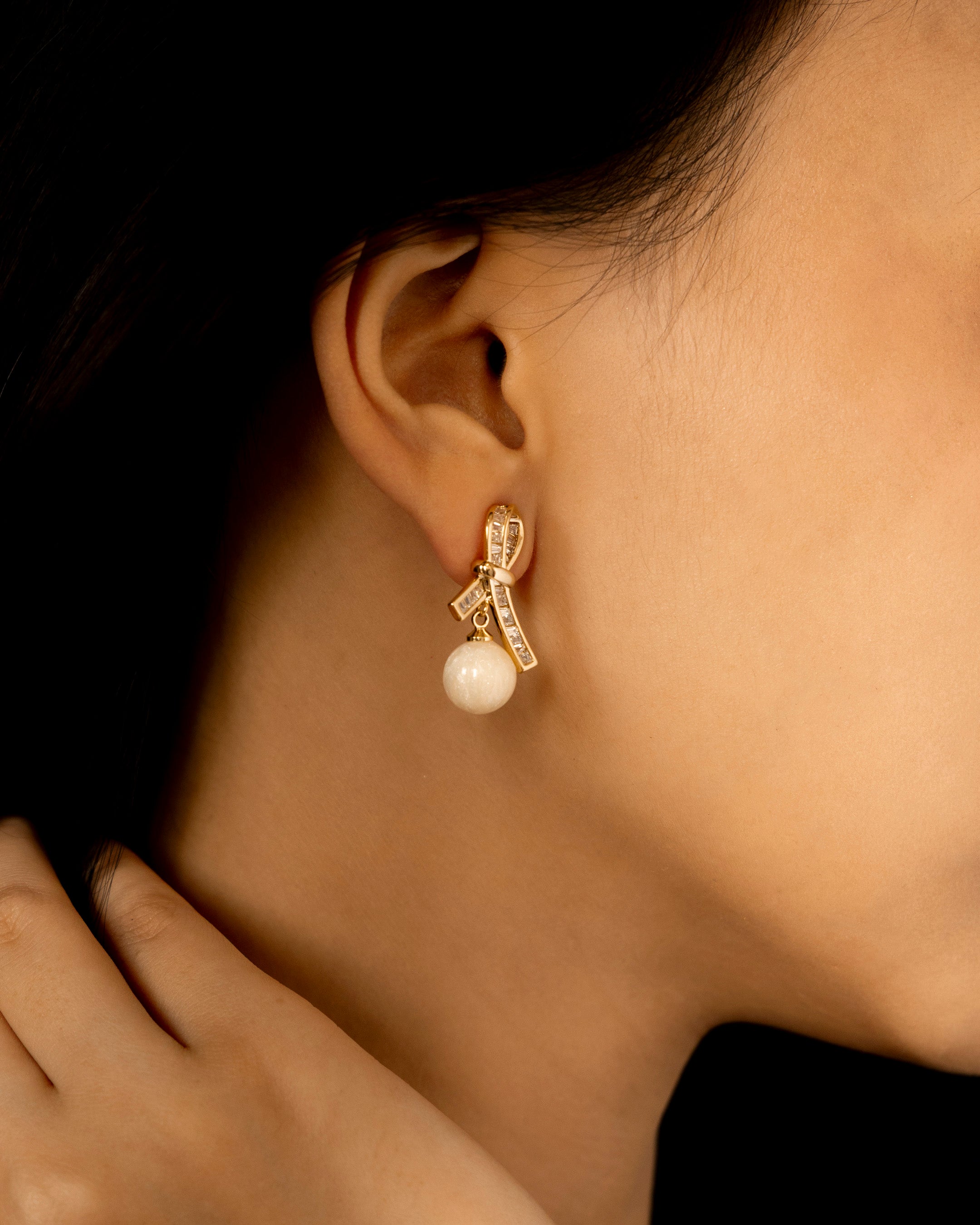 Refined yet playful, the Colette Drops pair sculptural baguette-studded bows with a soft marble-like orb. Their silhouette bridges poise and whimsy, like a ribbon frozen mid-twirl, grounded by quiet luminosity.
