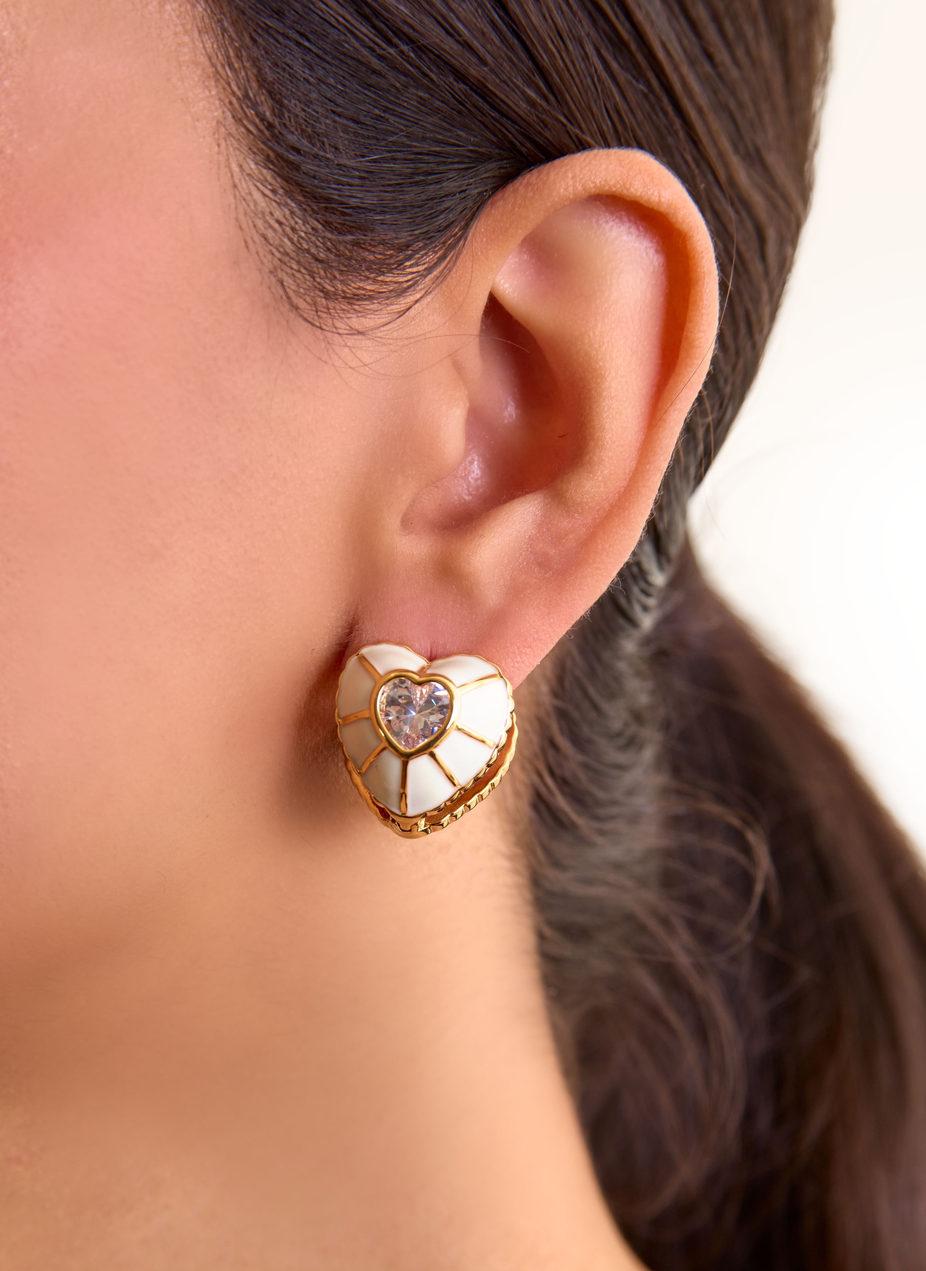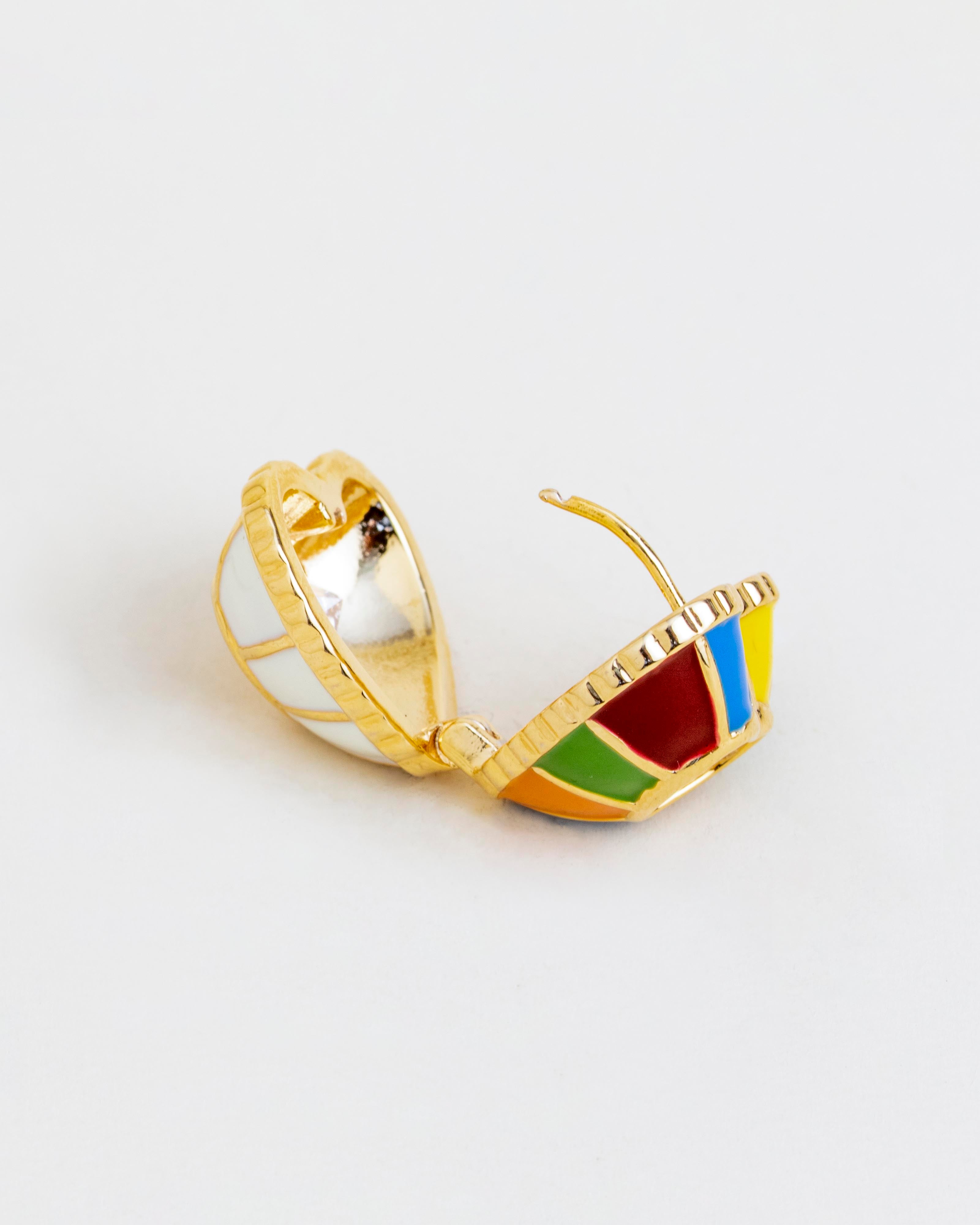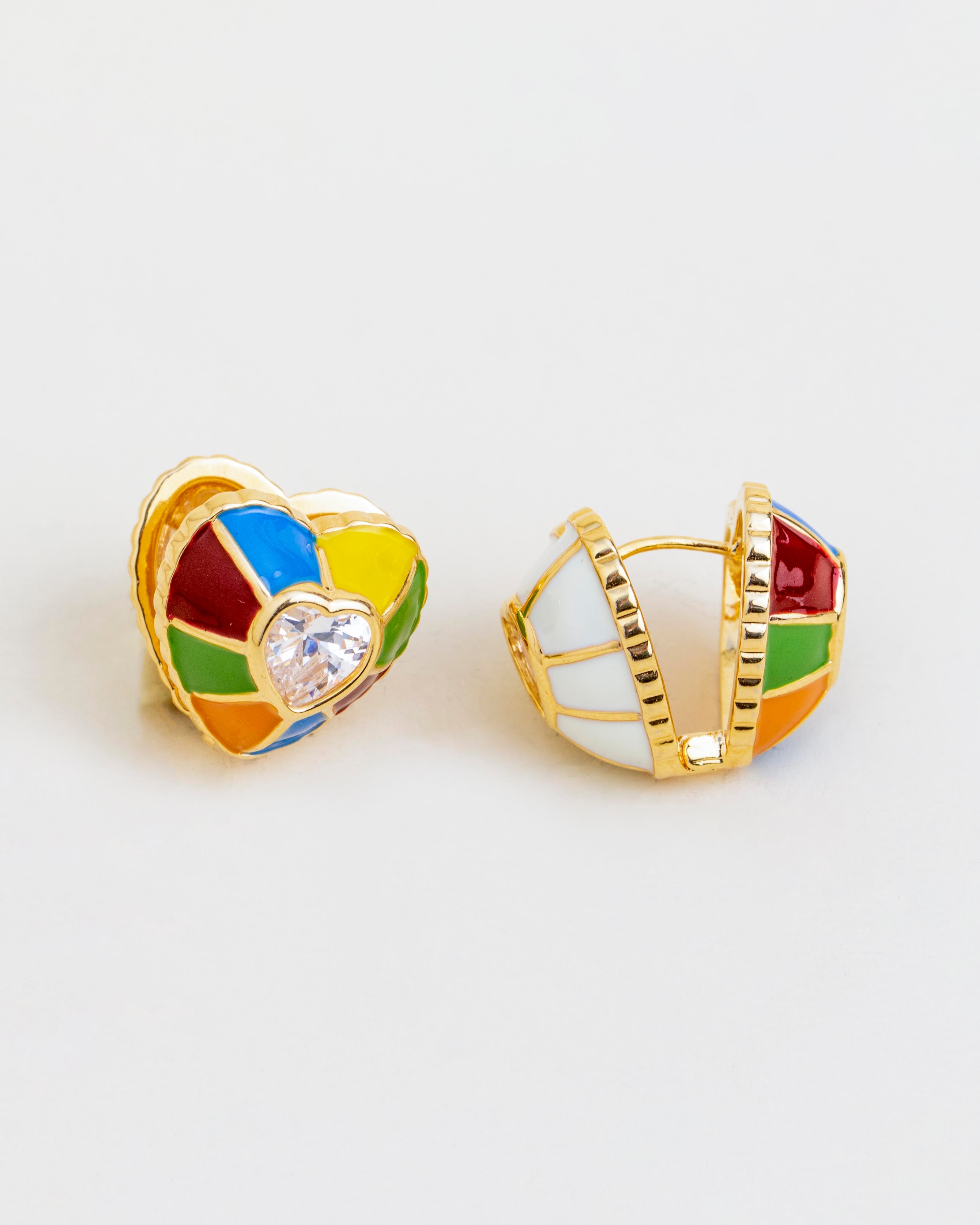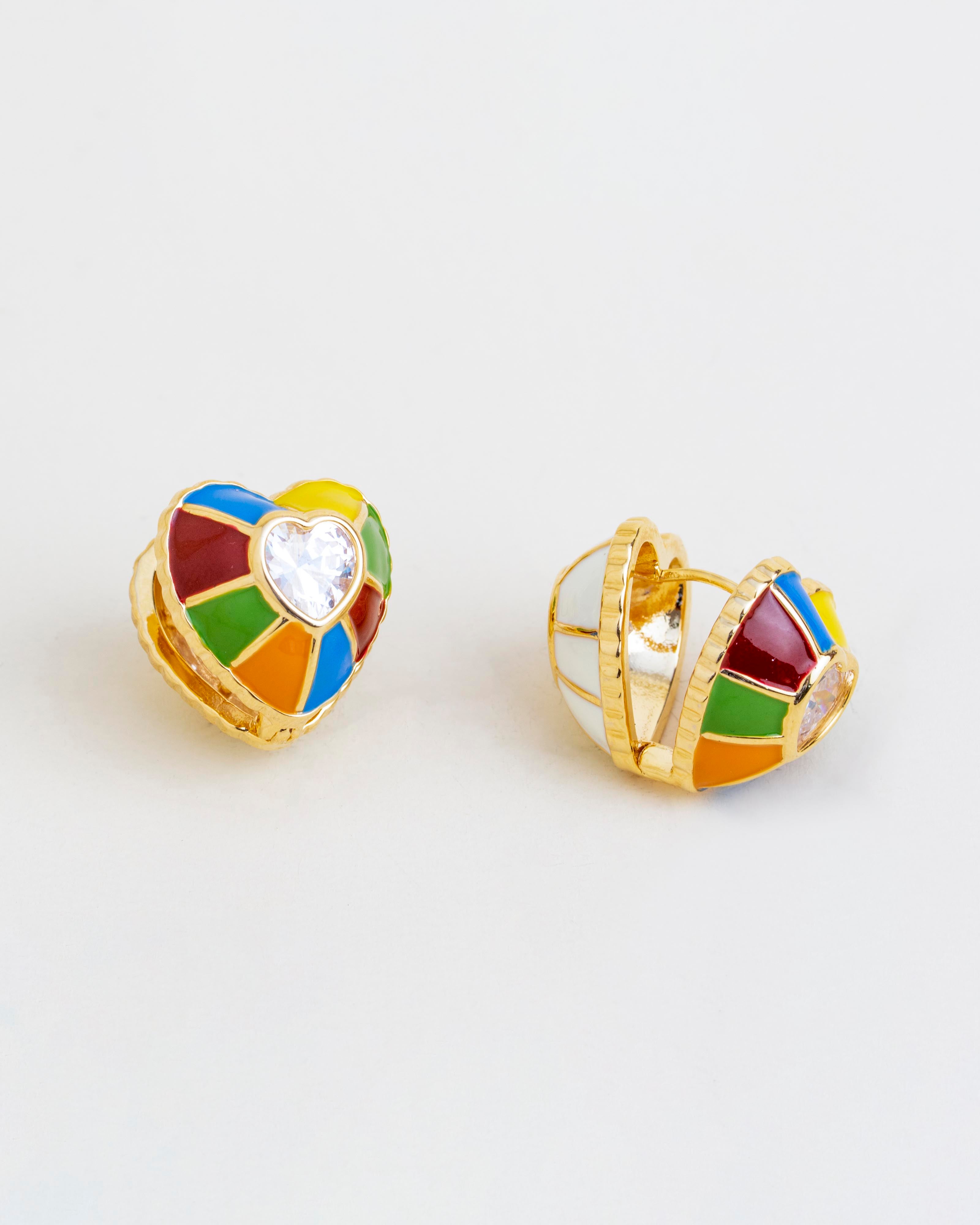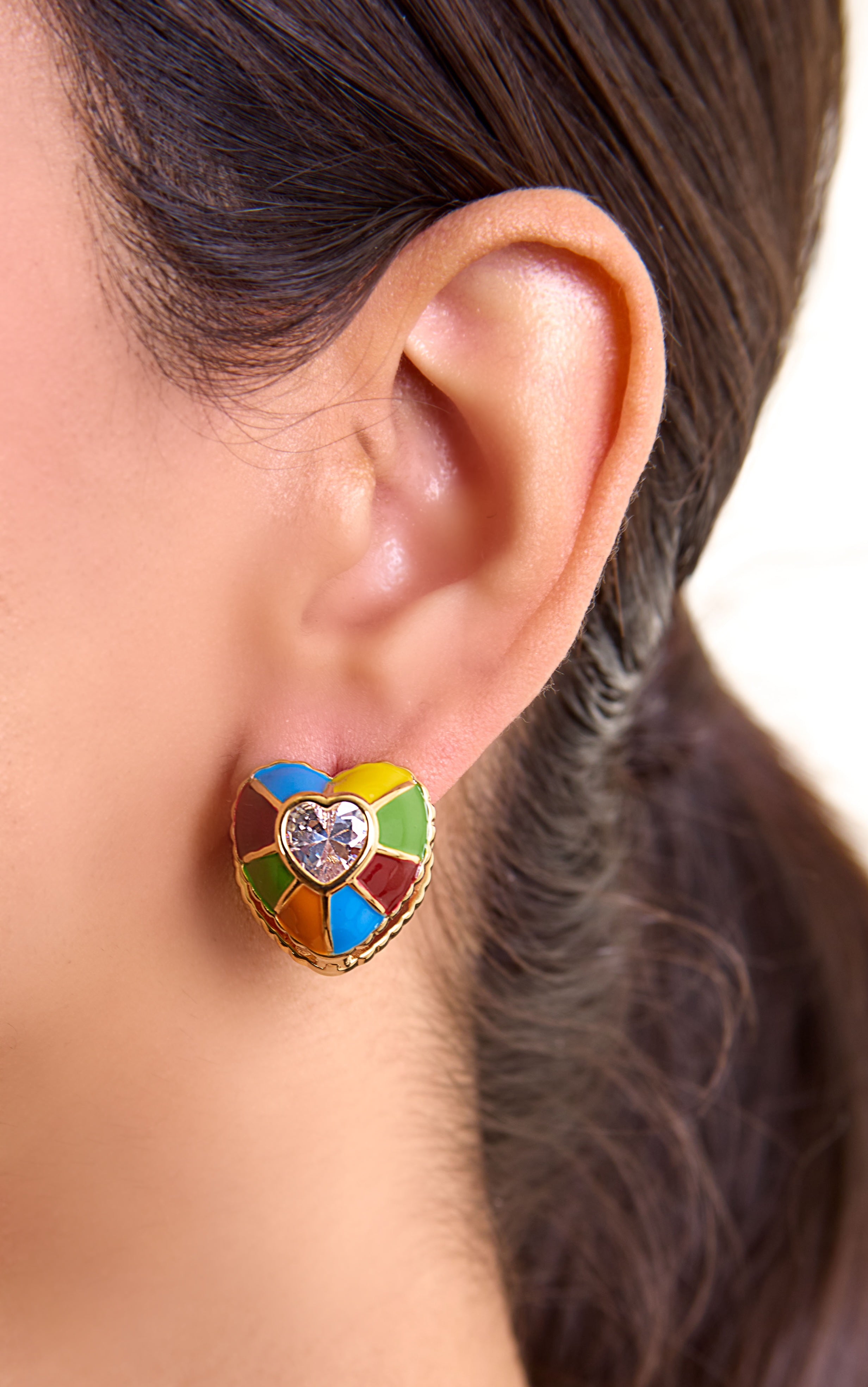 These dual-sided heart studs are a sweet surprise—one side bursting with a vibrant candy-hued mosaic, the other offering a soft, pearlescent elegance. At the center, a sparkling heart-shaped zirconia ties it all together, making them the perfect mix of fun and sophistication. Flip them to match your mood—colorful for a bold statement, neutral for an understated touch. Pair them with a dainty gold chain and a flowy blouse for a whimsical look, or mix them with other playful studs for an eclectic ear stack.
