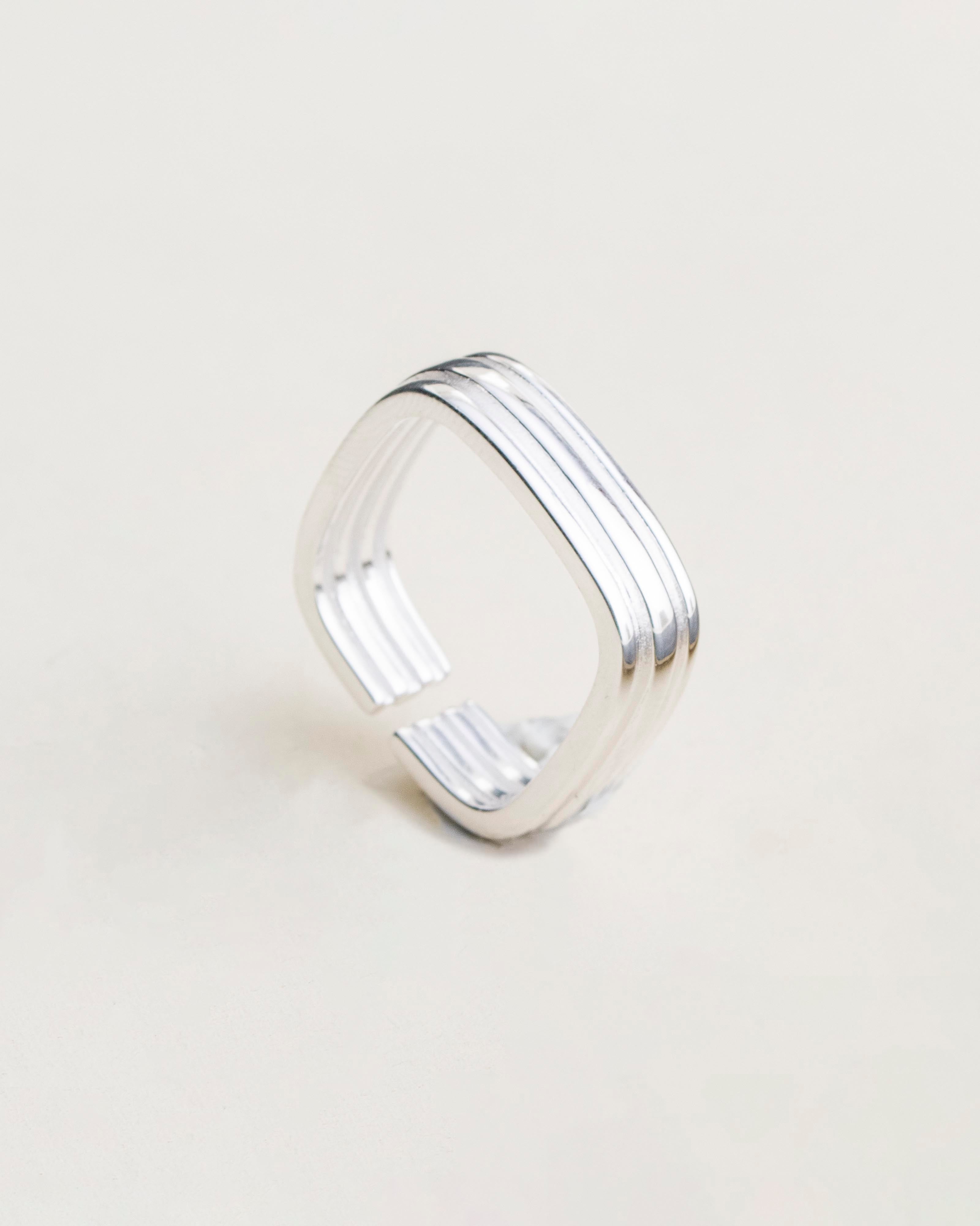 An industrial statement rooted in Bauhaus simplicity. The Forma Ring features a structured, squared silhouette with ridged detailing, evoking the raw elegance of modernist architecture. Crafted in sterling silver, its clean lines and bold form make it a versatile yet striking piece—where function meets artistry in perfect balance.