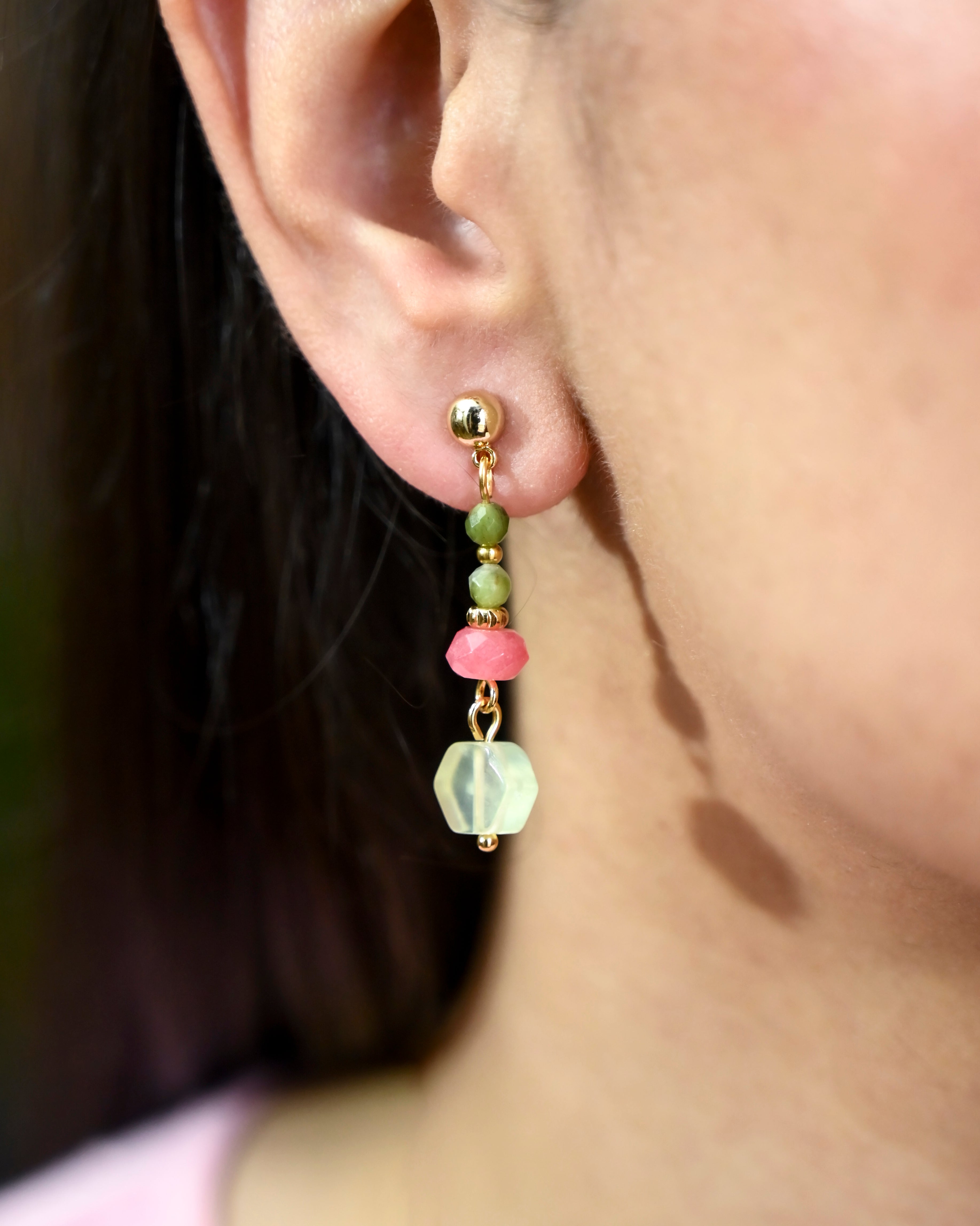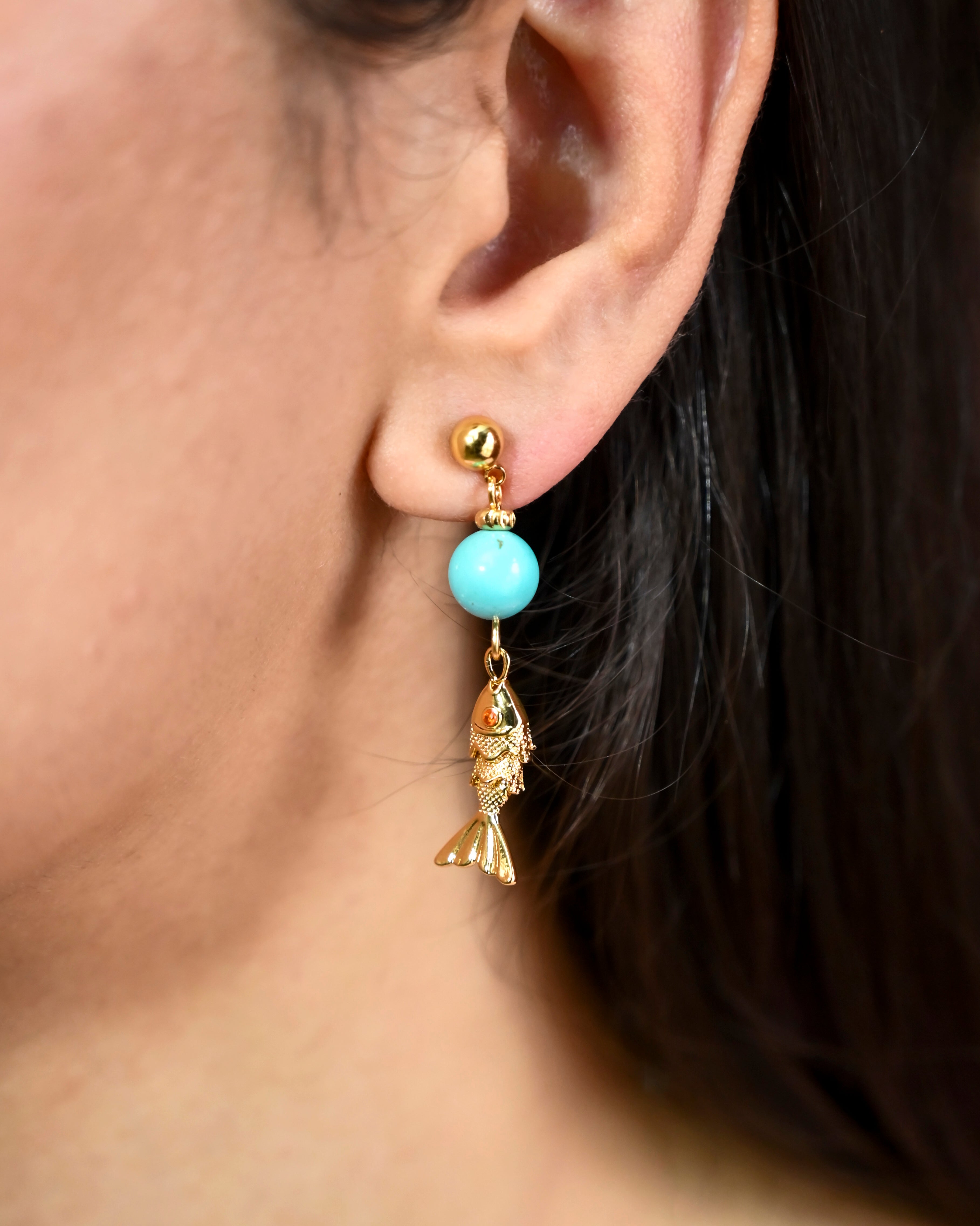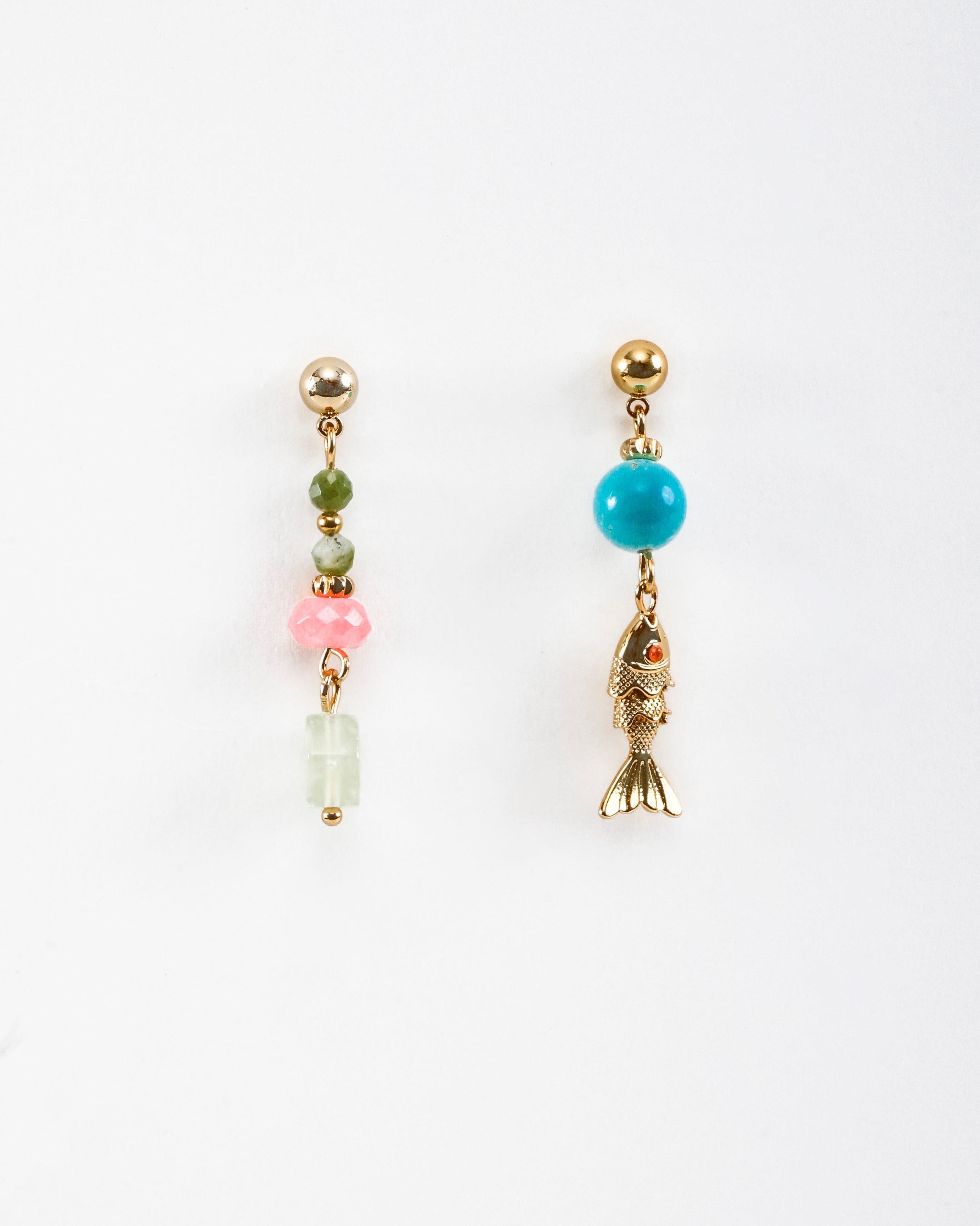 A playful mismatched pair — one side with candy-toned beads, the other anchored by a swinging gold fish charm. Light, quirky, and straight out of a street-side souvenir stall in a seaside town.