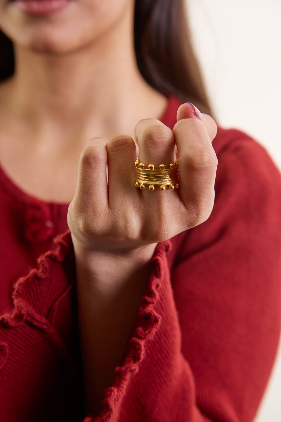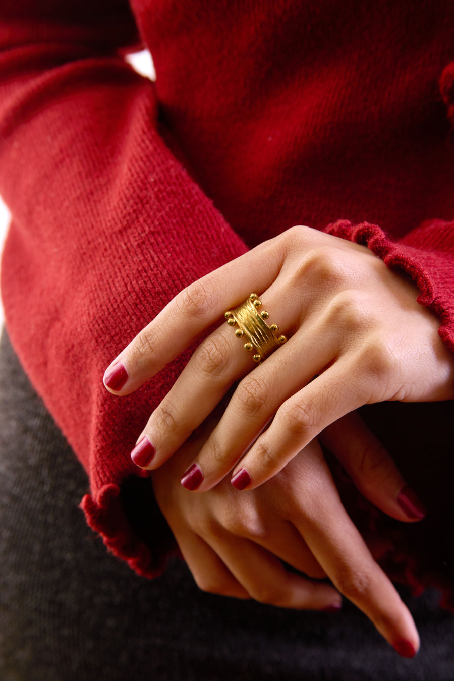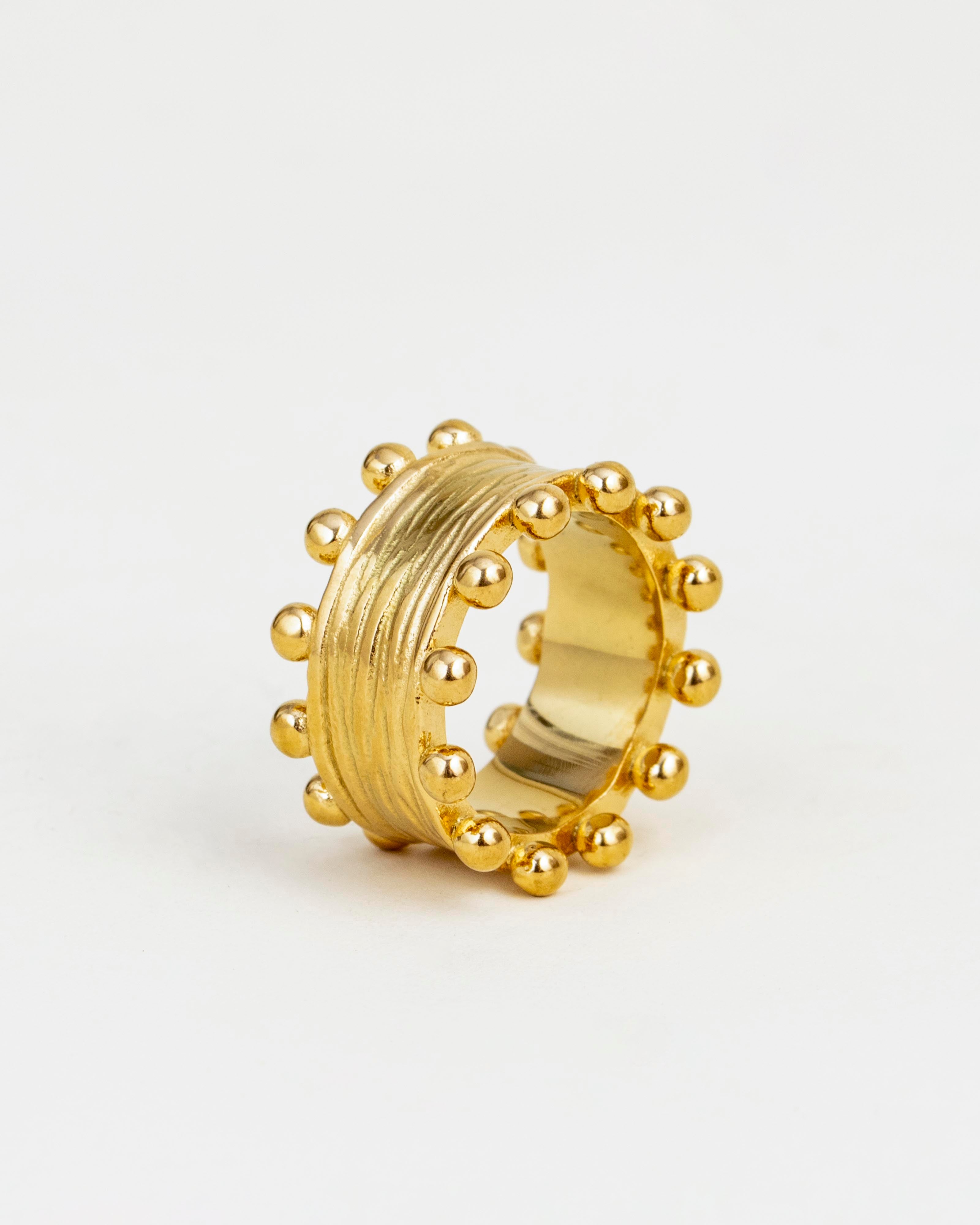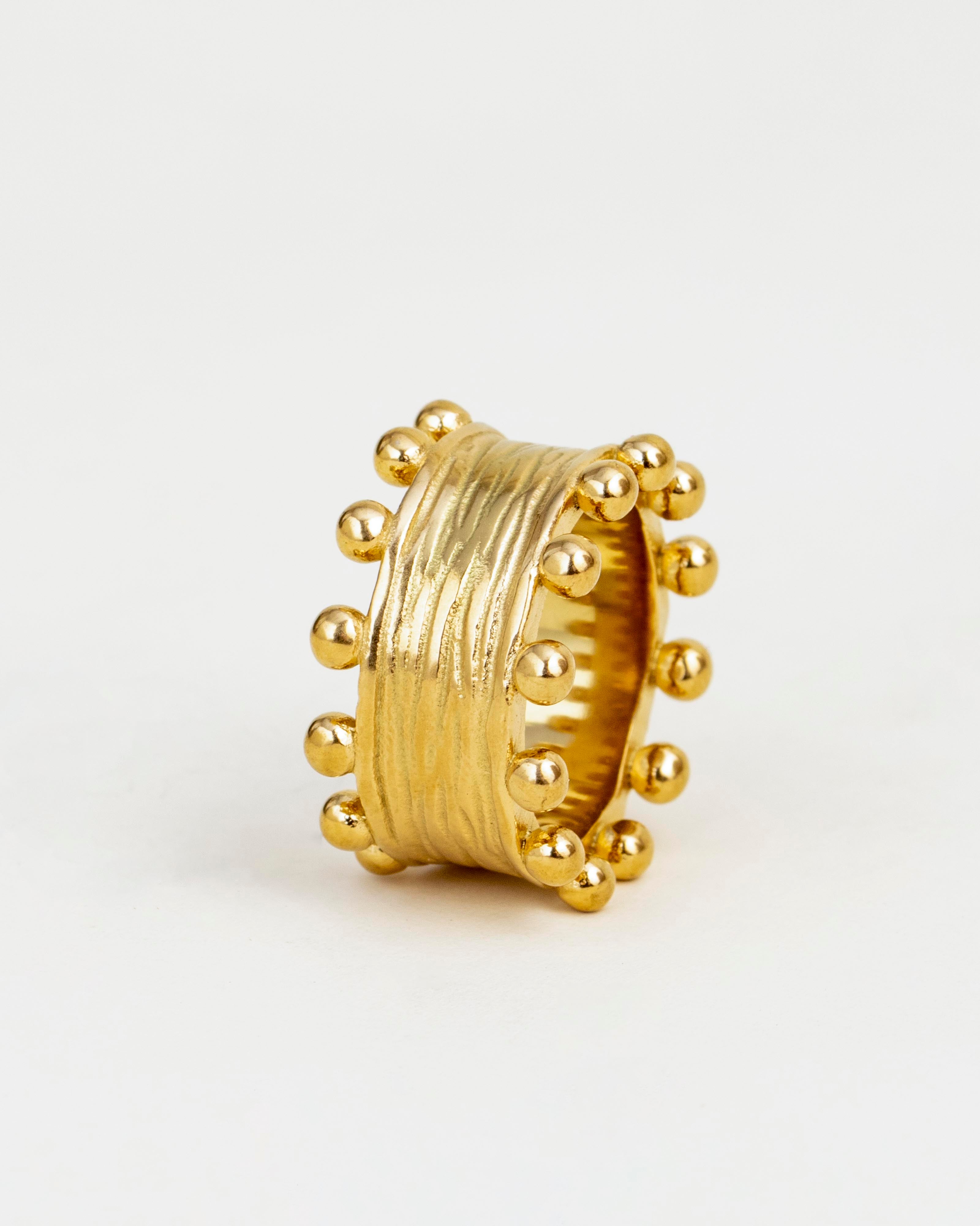 A regal relic with a rebellious twist. The Guinevere ring merges raw, weathered textures with polished golden spheres—equal parts medieval armor and modern heirloom.