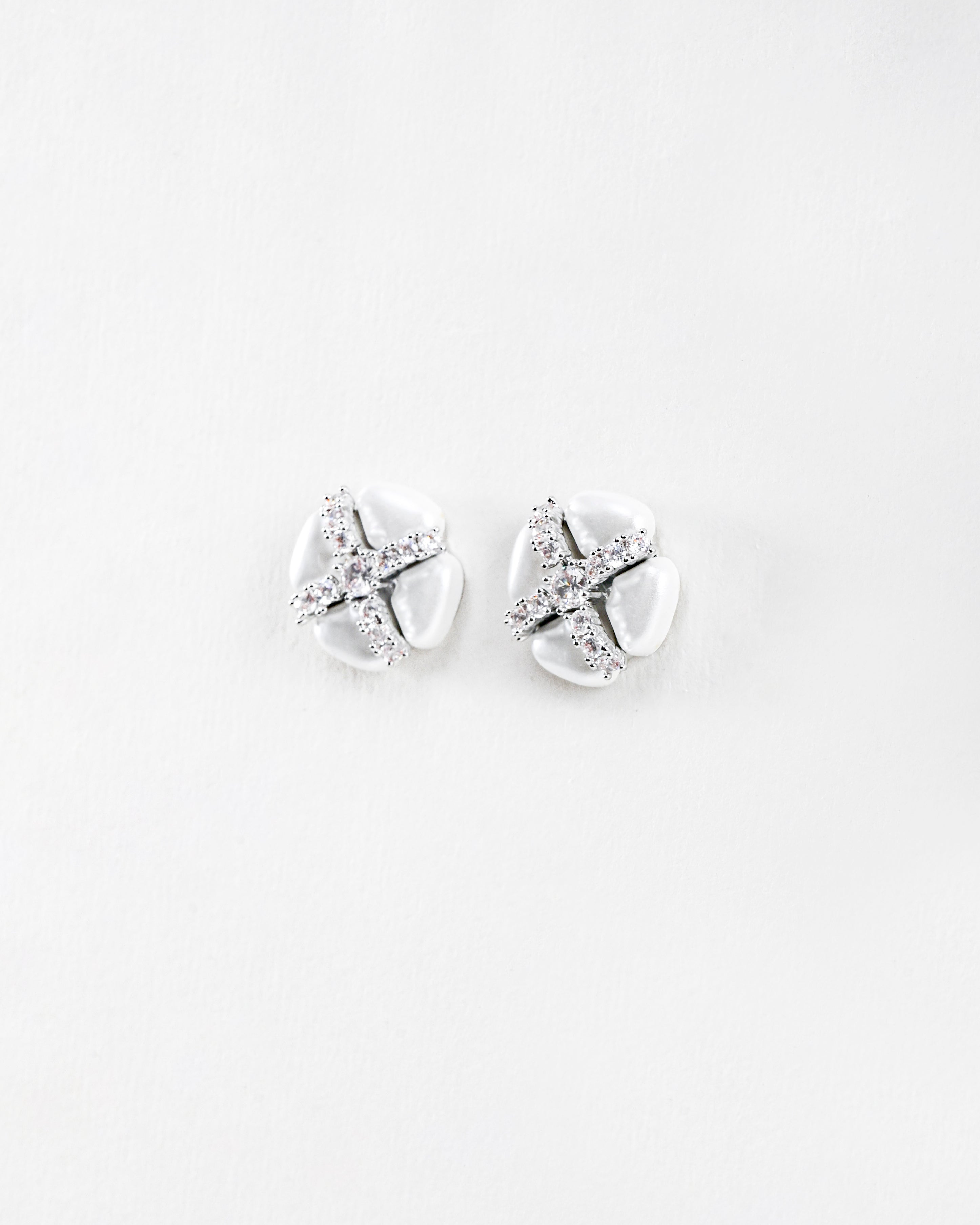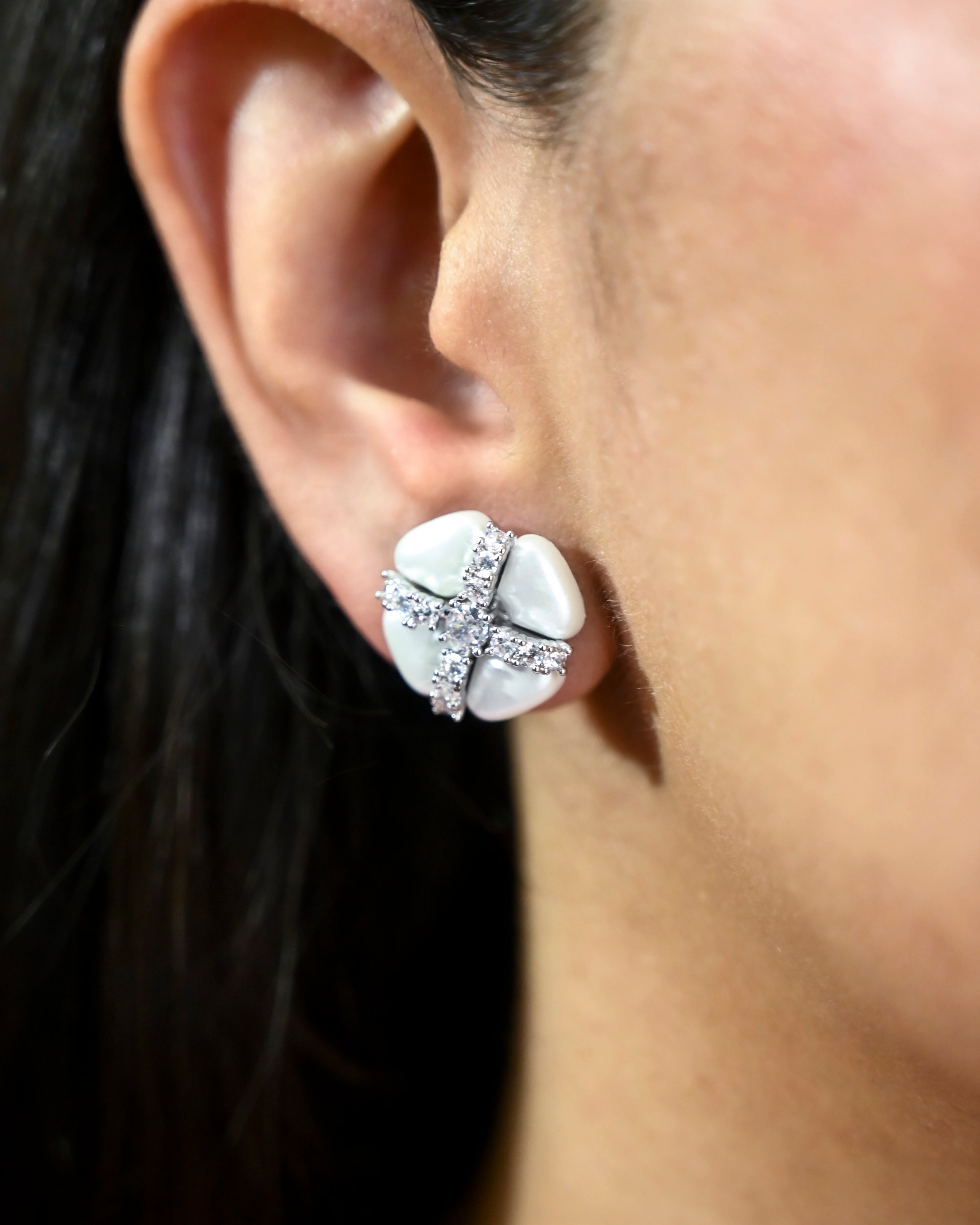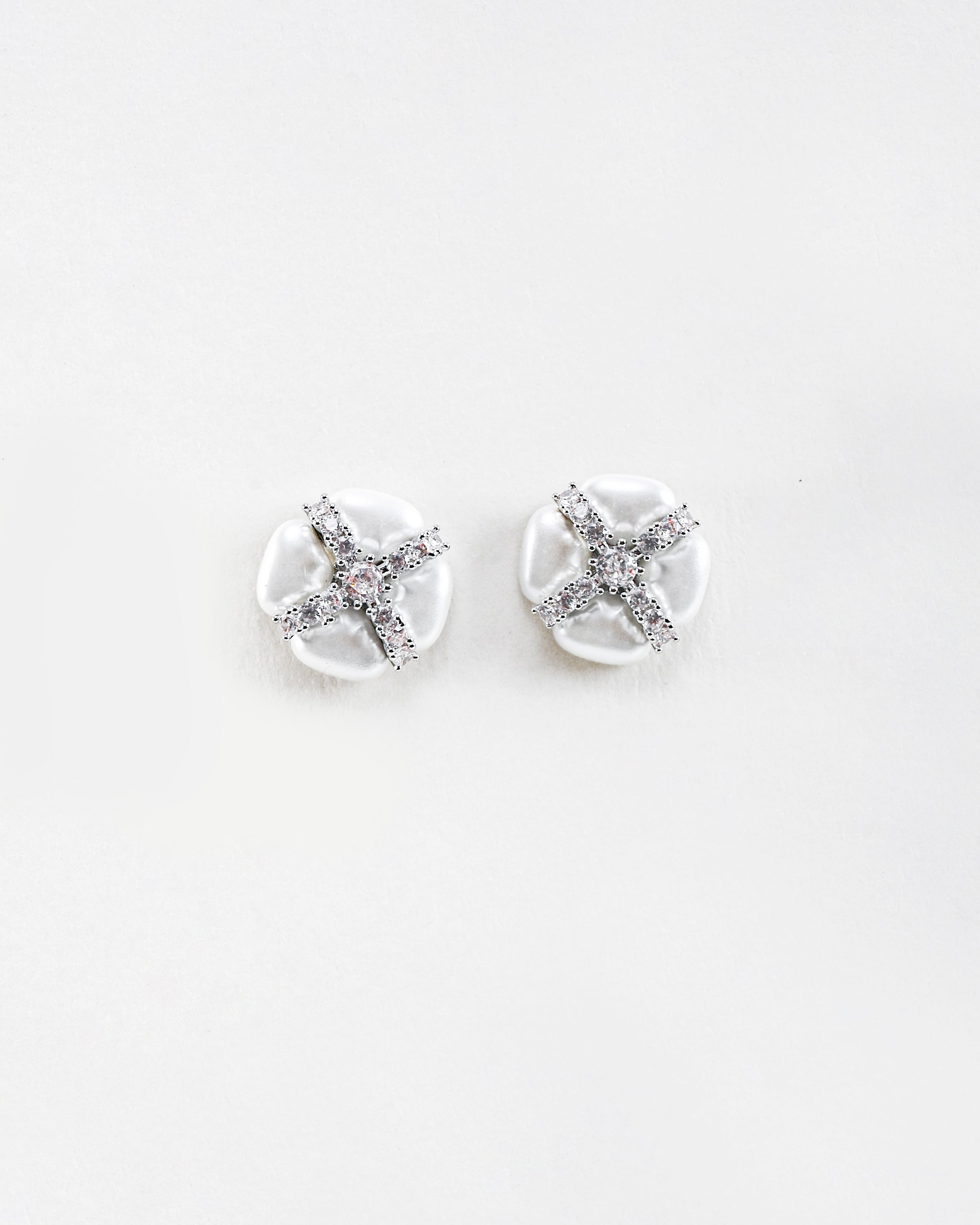 Iridescent pearl-like domes intersected by a glinting cross of zircons — the Iris Studs are delicate, dignified, and softly luminous.