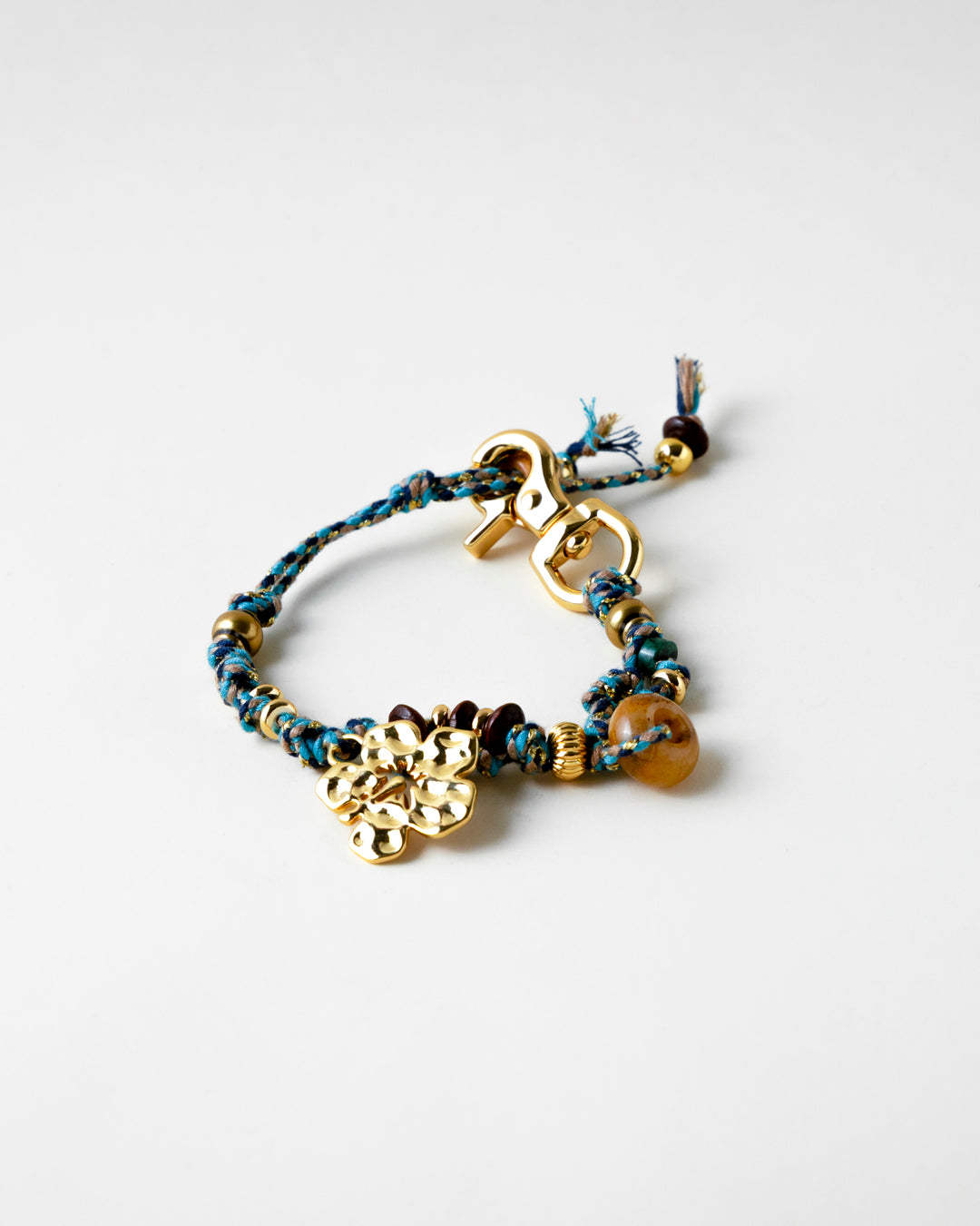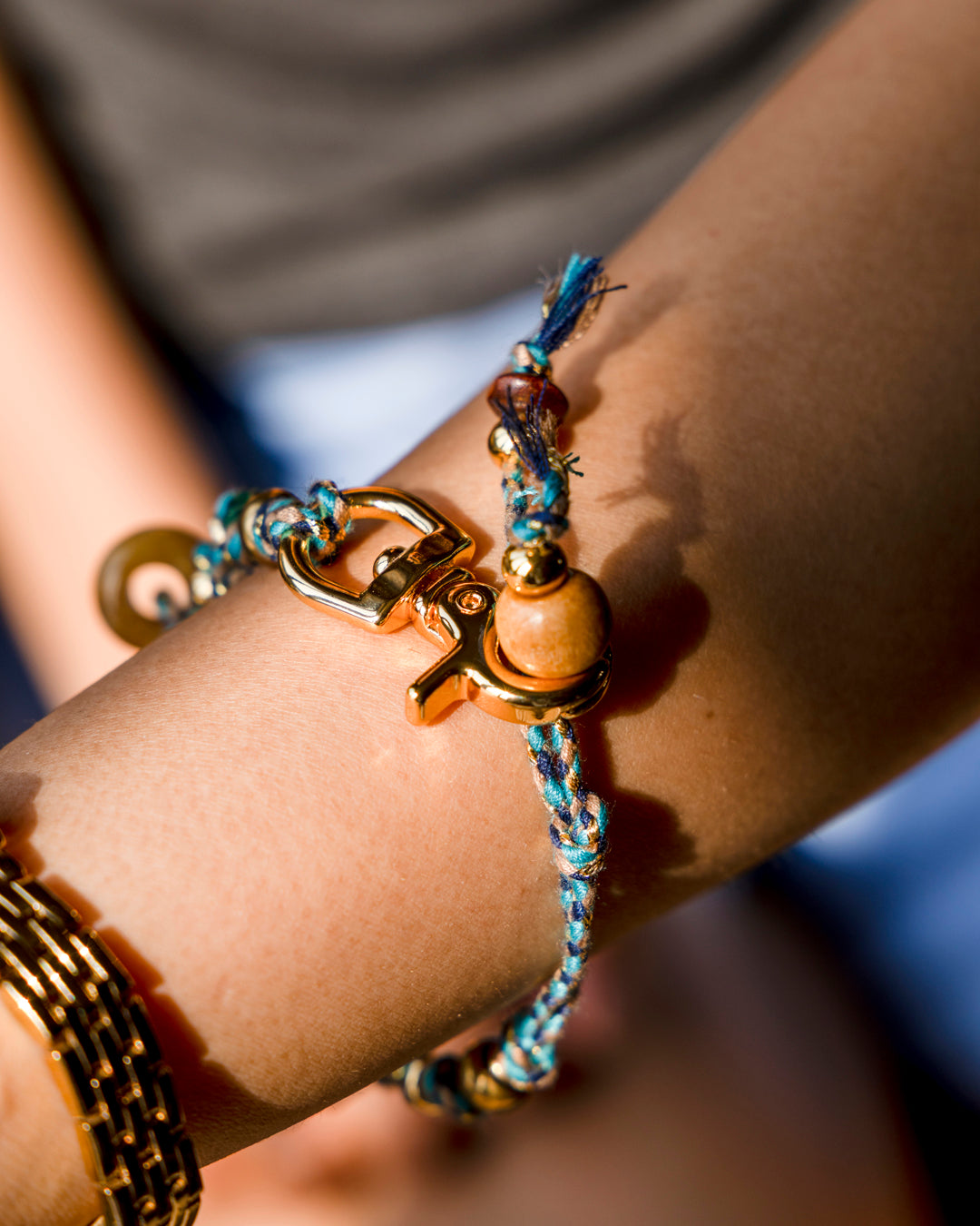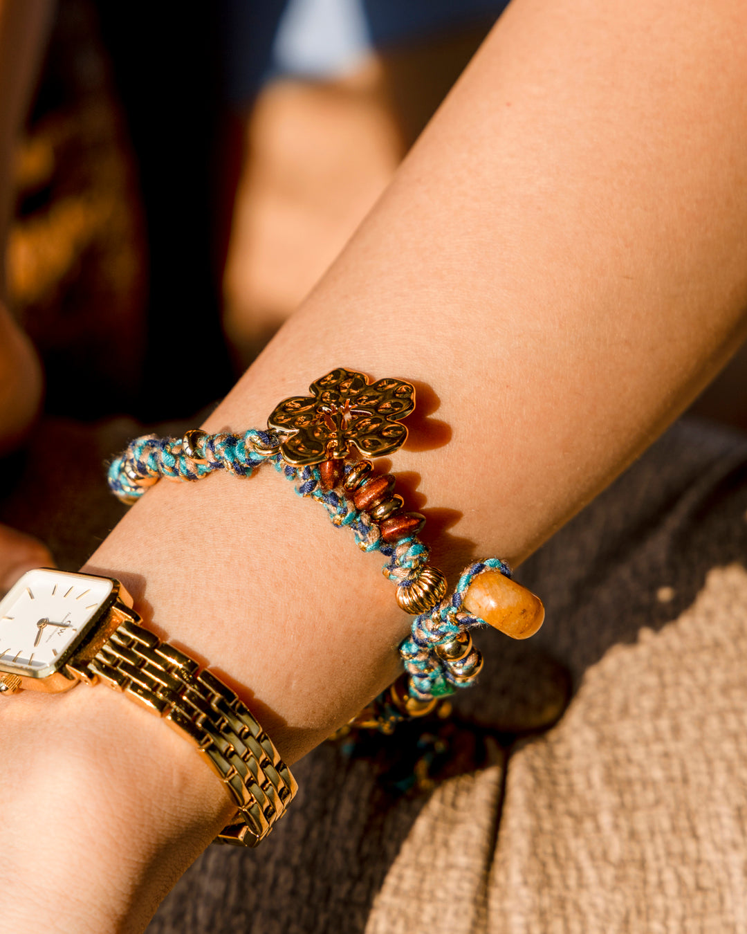 Part talisman, part travel souvenir, the Island Spell Bracelet is a story of sun-warmed skin, salty prayers, and hibiscus blooms in full swing. Woven in vibrant cerulean and cream cords, it features an eclectic mix of gold-toned beads, earthy wood, and semi-precious stone accents that feel handpicked from a coastal shrine.