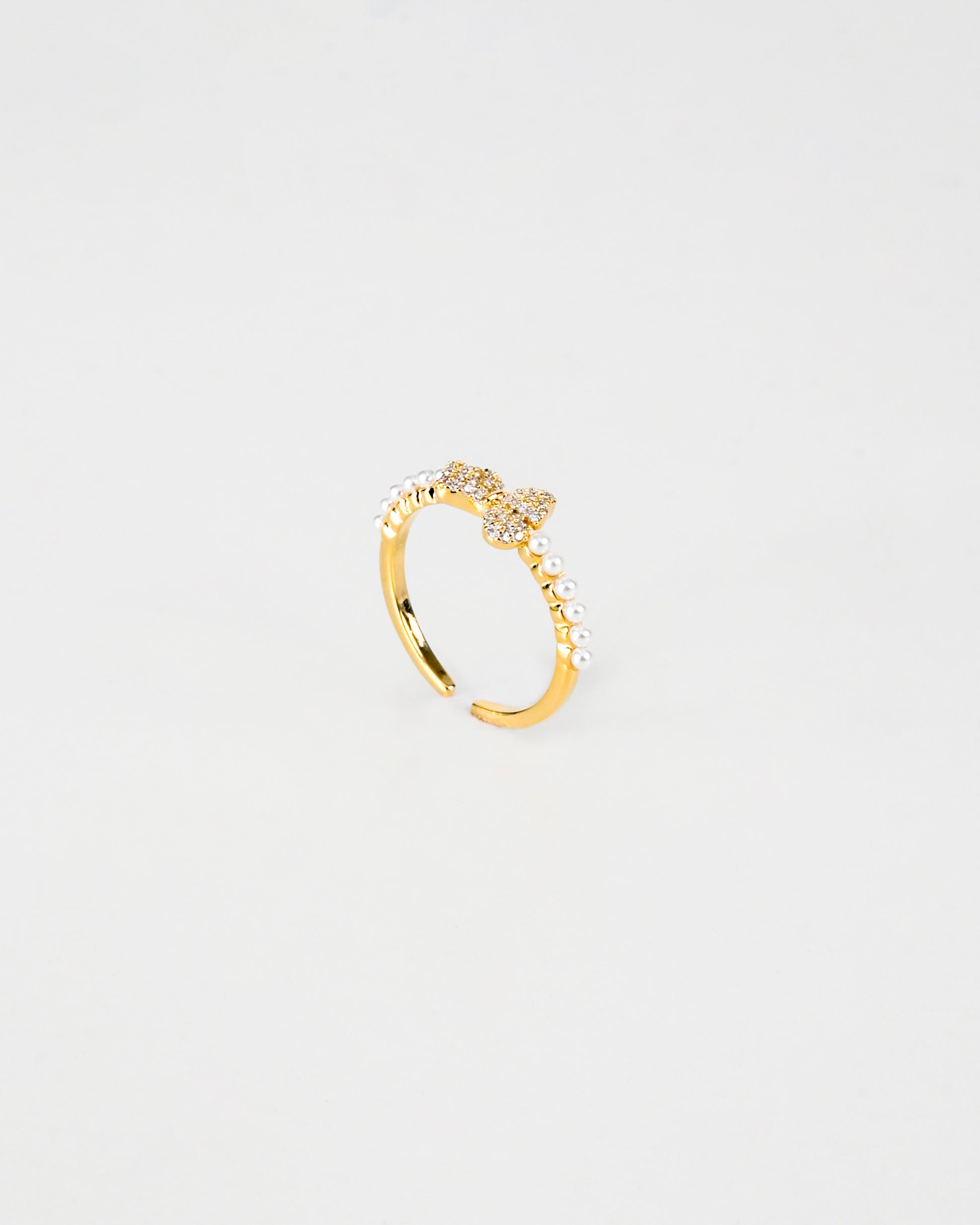 Charming and playful, the Lola ring is all about the little things. A crystal-studded bow sits sweetly above a row of delicate pearls, making her the perfect flirt between dainty and dressy. She’s adjustable for a snug fit and loves being paired with other gold bands or worn solo for a soft statement.