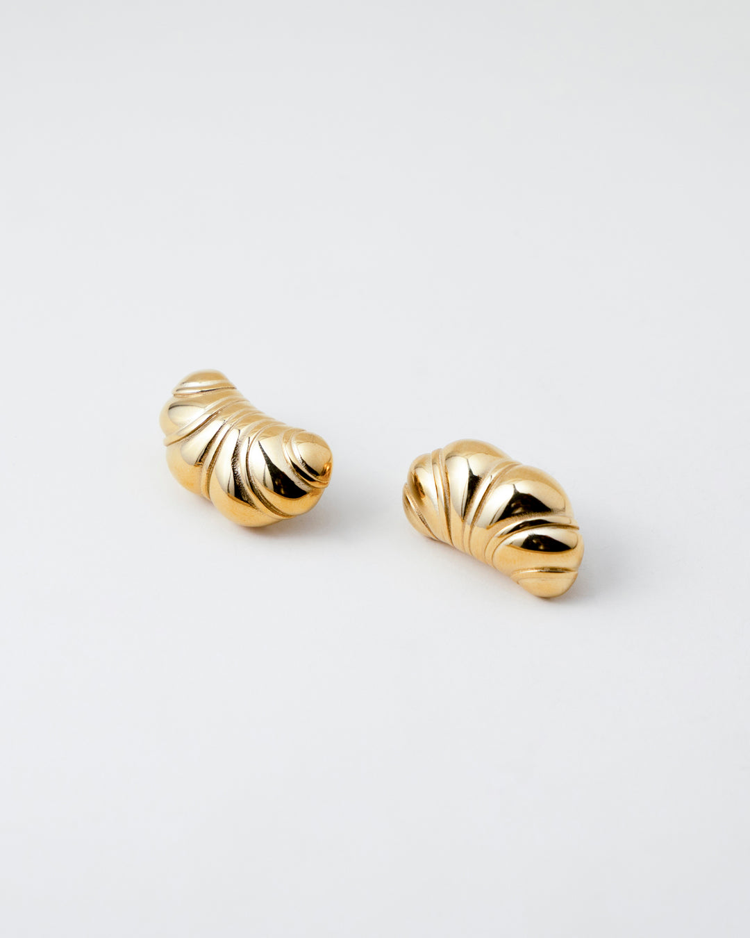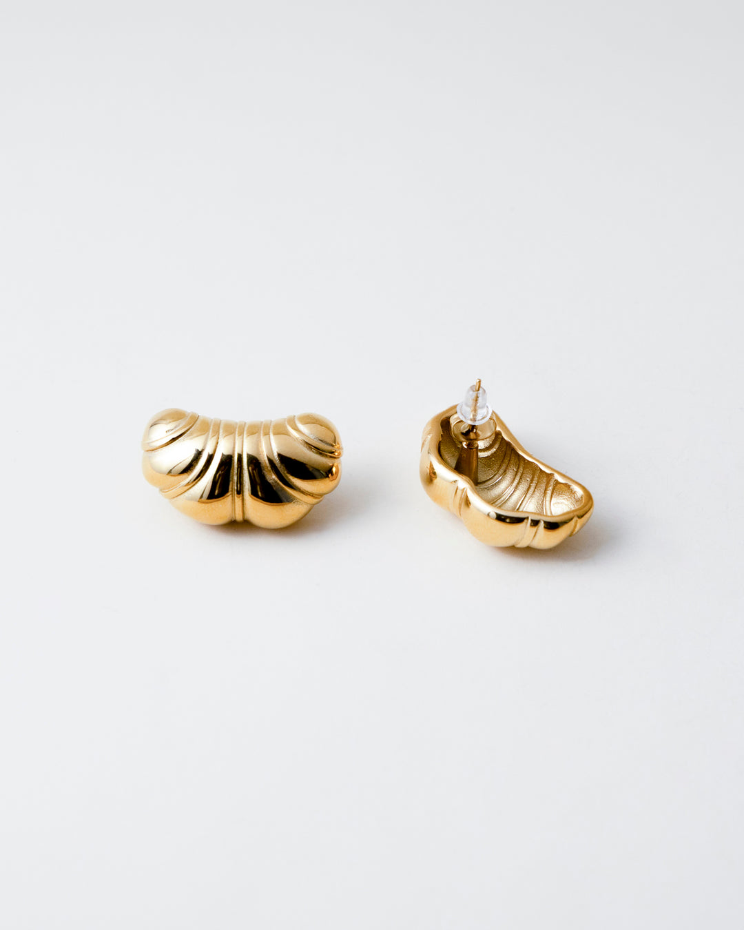These puffed gold studs curve like a croissant, cast in high-shine gold for a quiet, luxurious finish. With their softly pleated shell form, they feel part Parisian café, part Renaissance relic; perfect for the days you want your earrings to do the talking. Pair with a tucked shirt and messy bun or go full maximalist. They're your go-to when a stud feels too small and a hoop too loud.