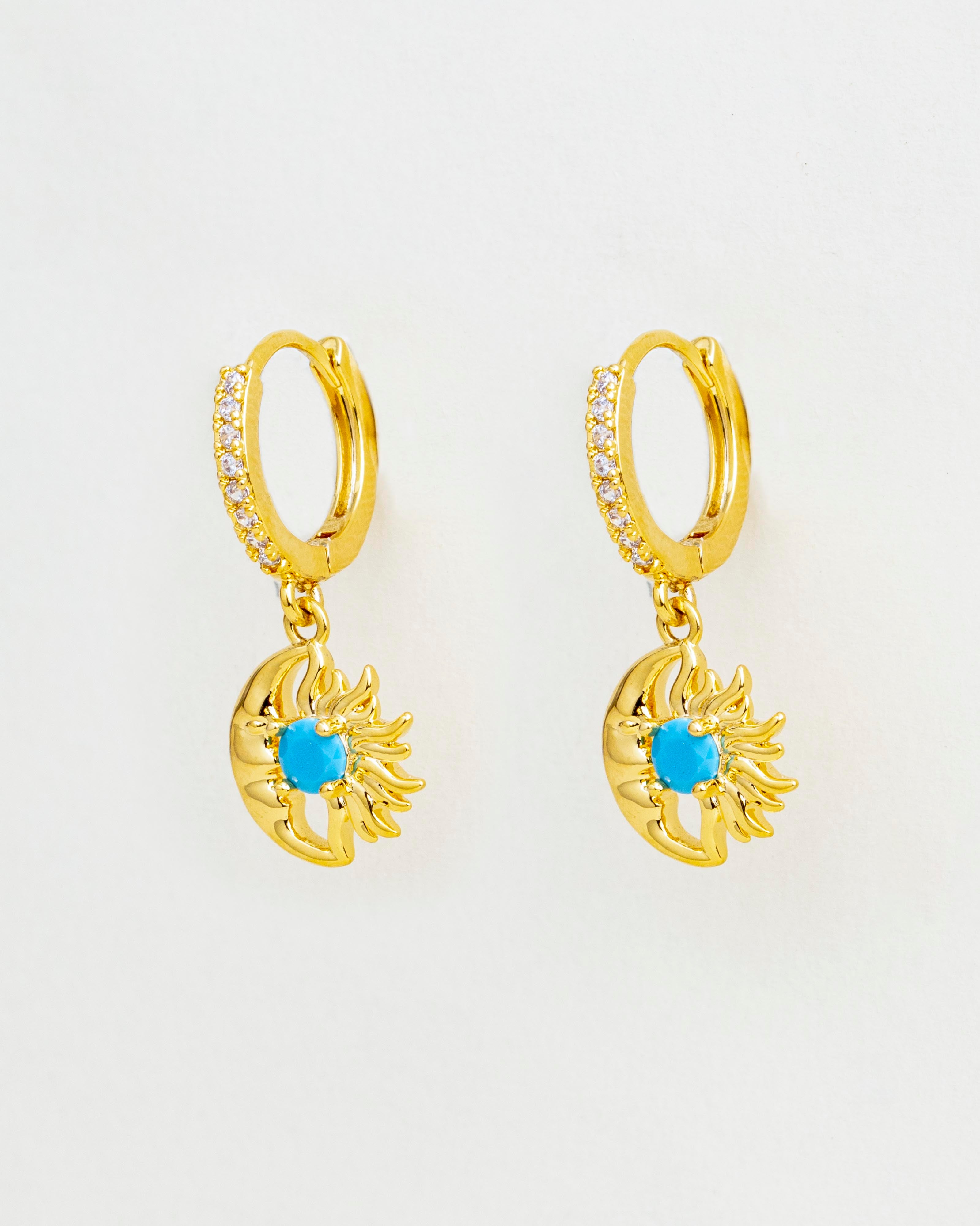 Embrace the celestial balance of day and night with these radiant gold-tone hoops. Featuring a sun-and-moon charm centered by a vivid turquoise stone, they symbolize harmony and duality. The pavé detailing on the hoops adds a touch of sparkle, making them perfect for layering or standing out solo. Wear them as a reminder that every sunrise follows a sunset.