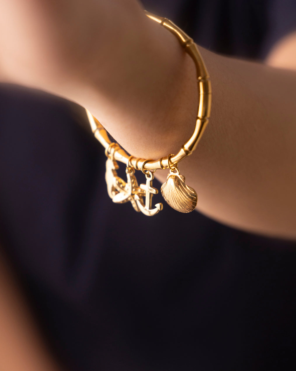 The Marisol Bangle brings coastal charm to your everyday with a trio of ocean-inspired accents - a glistening shell, a steady anchor, and a playful dolphin. Crafted in a bamboo-textured gold finish, it embodies the spirit of wanderlust and the ease of resort living, made wearable for everyday adornment.