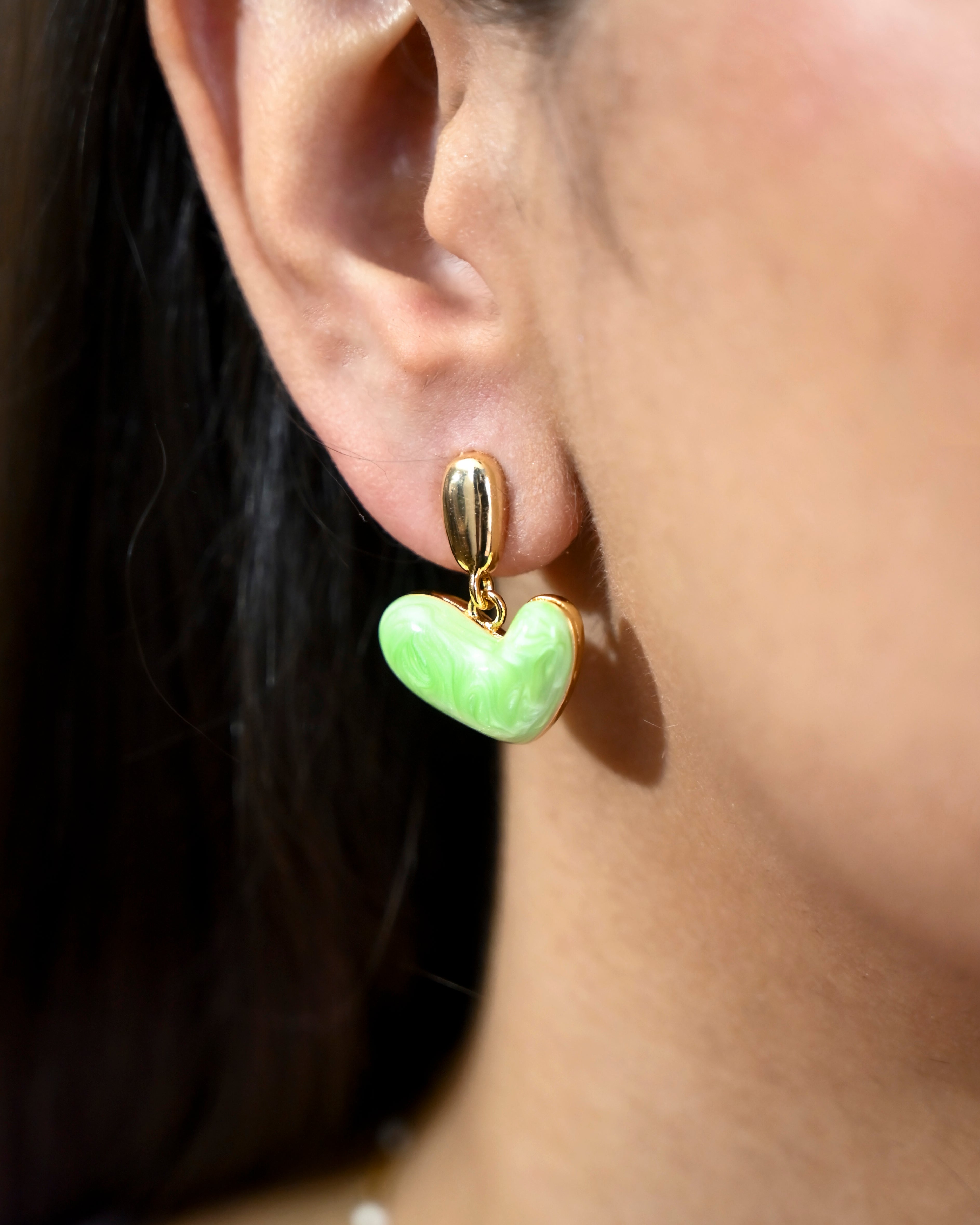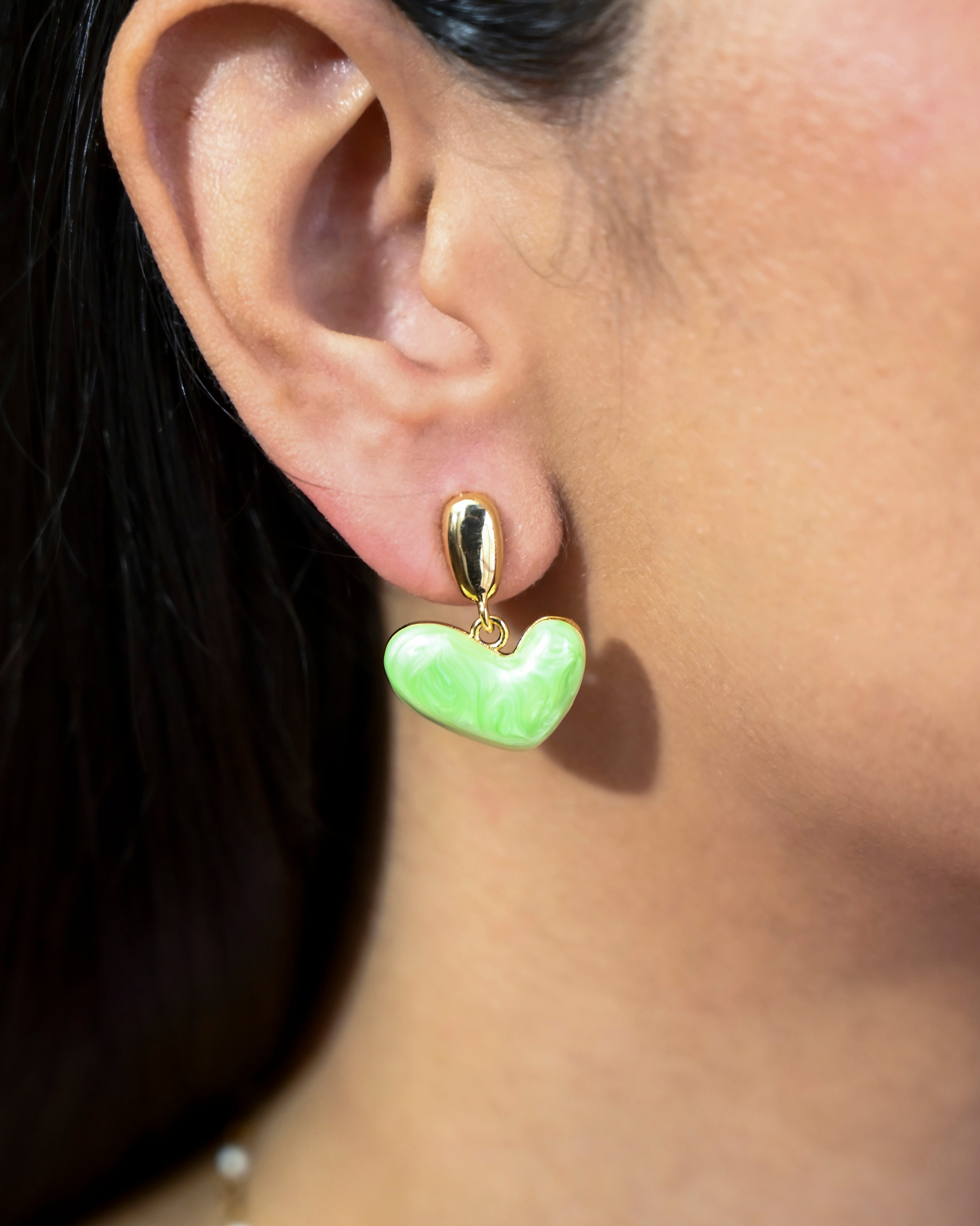 Glossy gold studs paired with a swirled green heart - playful, offbeat, and full of character. For days when you're feeling fresh, or want to fake it.