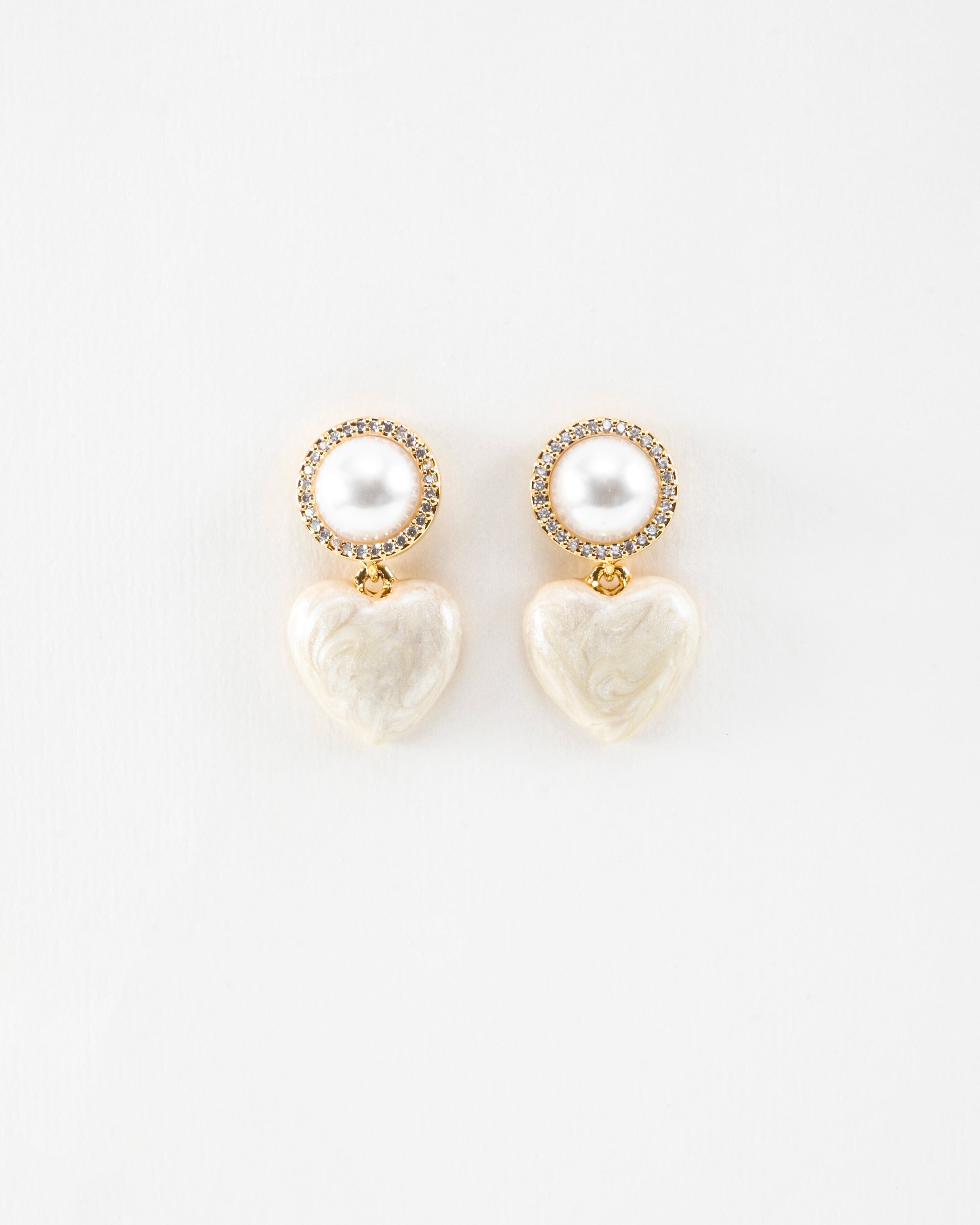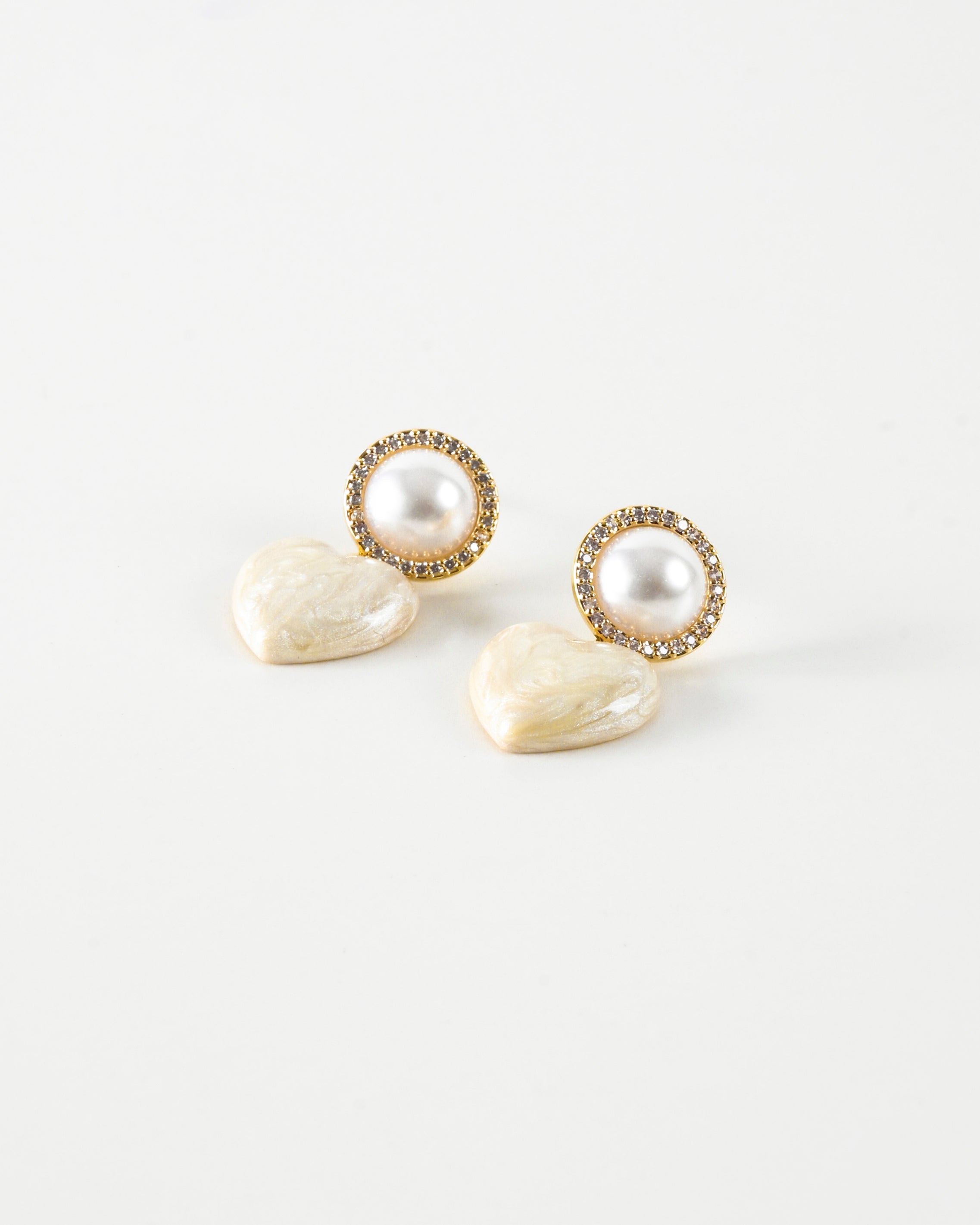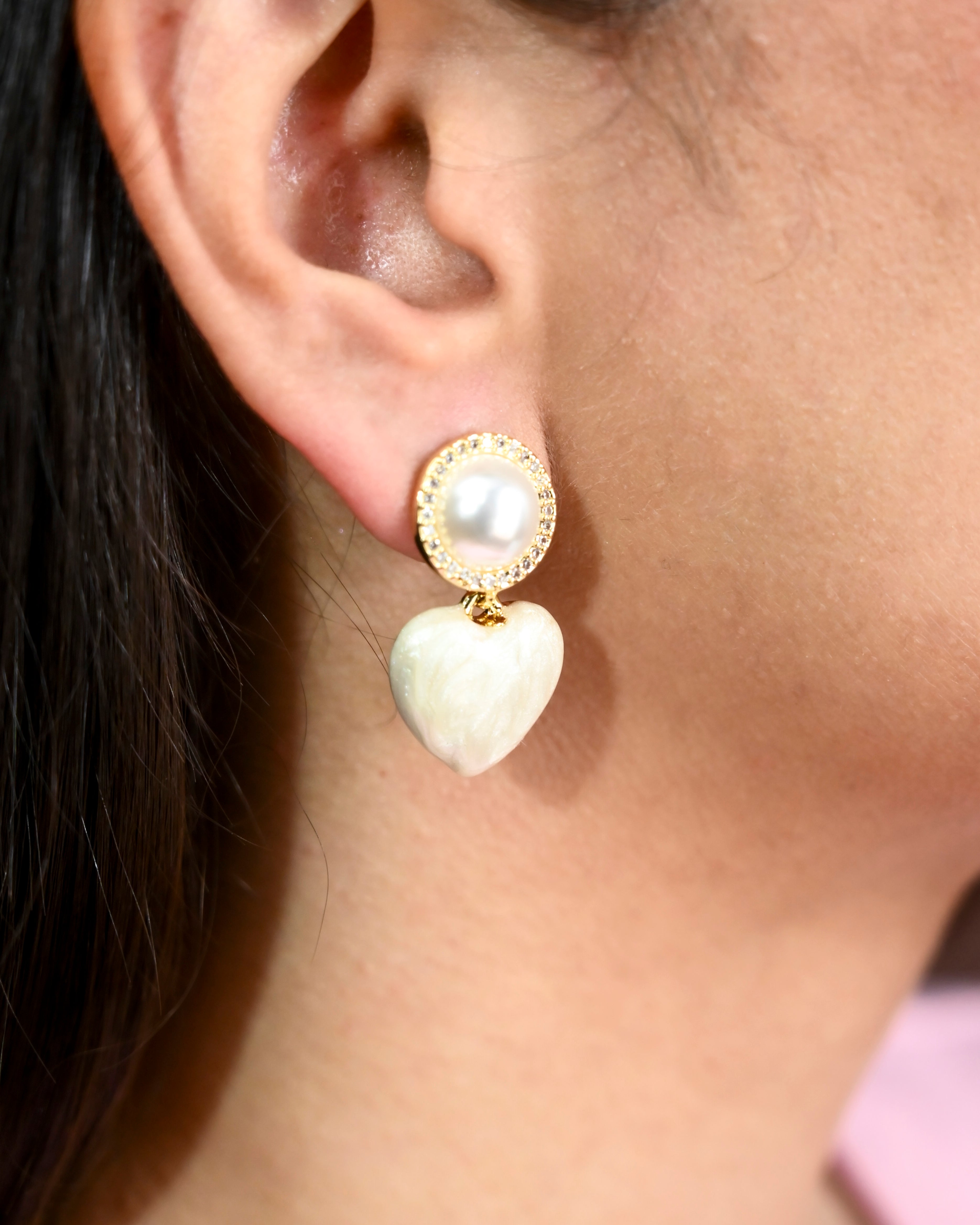 A pearl-framed stud anchors a cloudy white heart below - soft, milky, and gently luminous. Like a keepsake passed through generations.