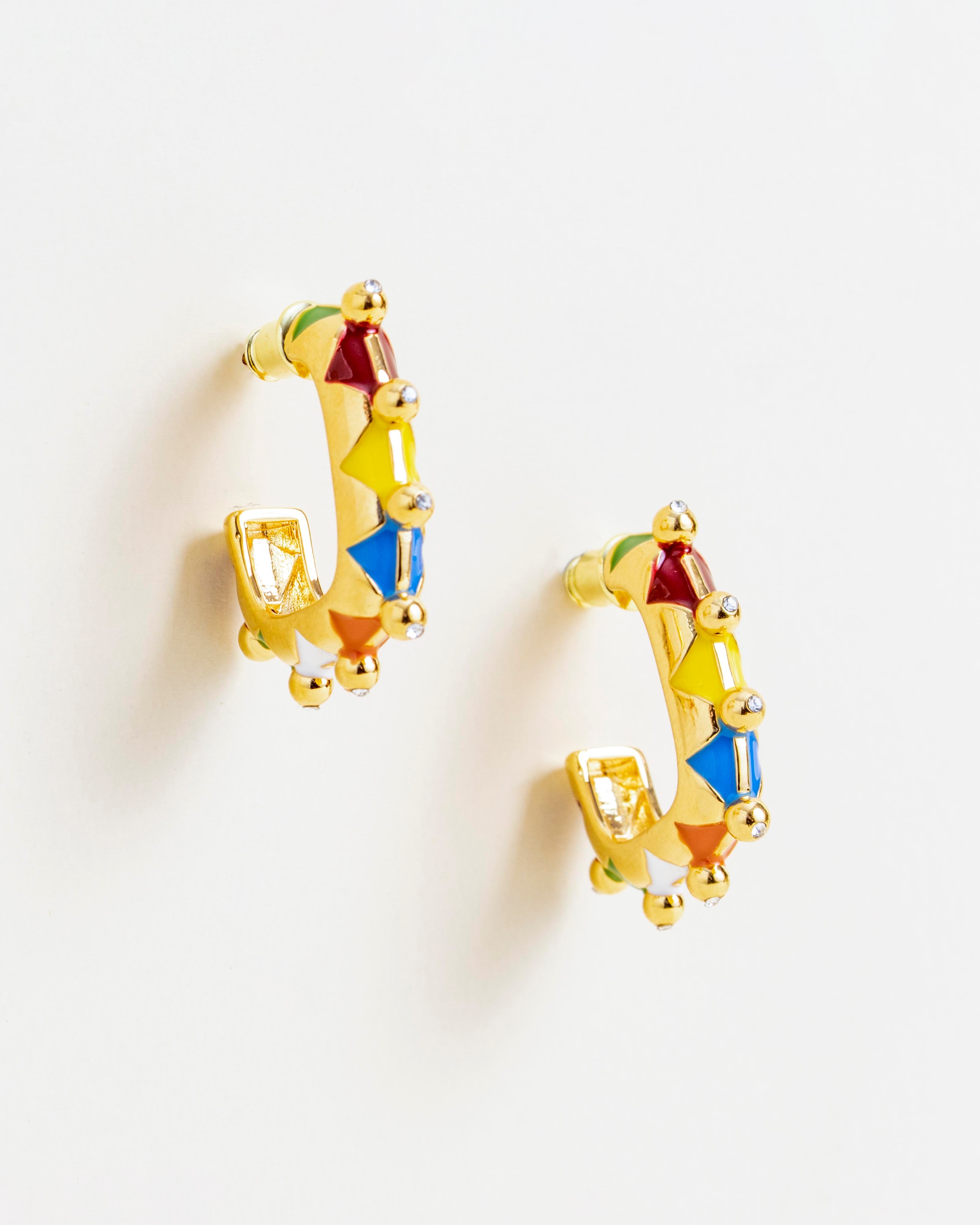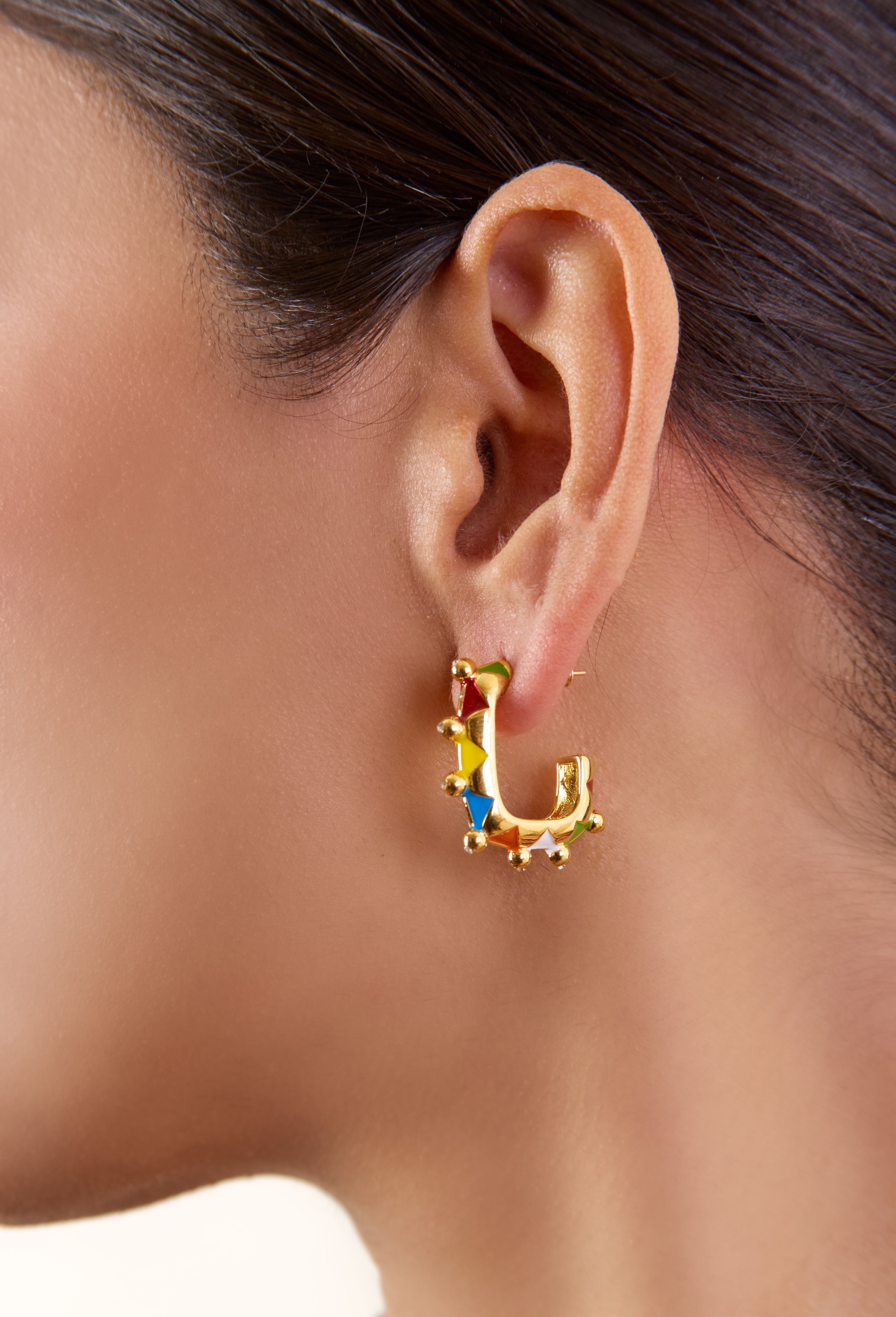These vibrant geometric hoops are where bold meets playful—gold-toned with pops of colorful enamel and delicate bead accents, they’re a little retro, a little modern, and a lot of fun. Whether you're elevating a casual brunch look or making a statement on a night out, these earrings move with you, adding just the right touch of artistic edge.
