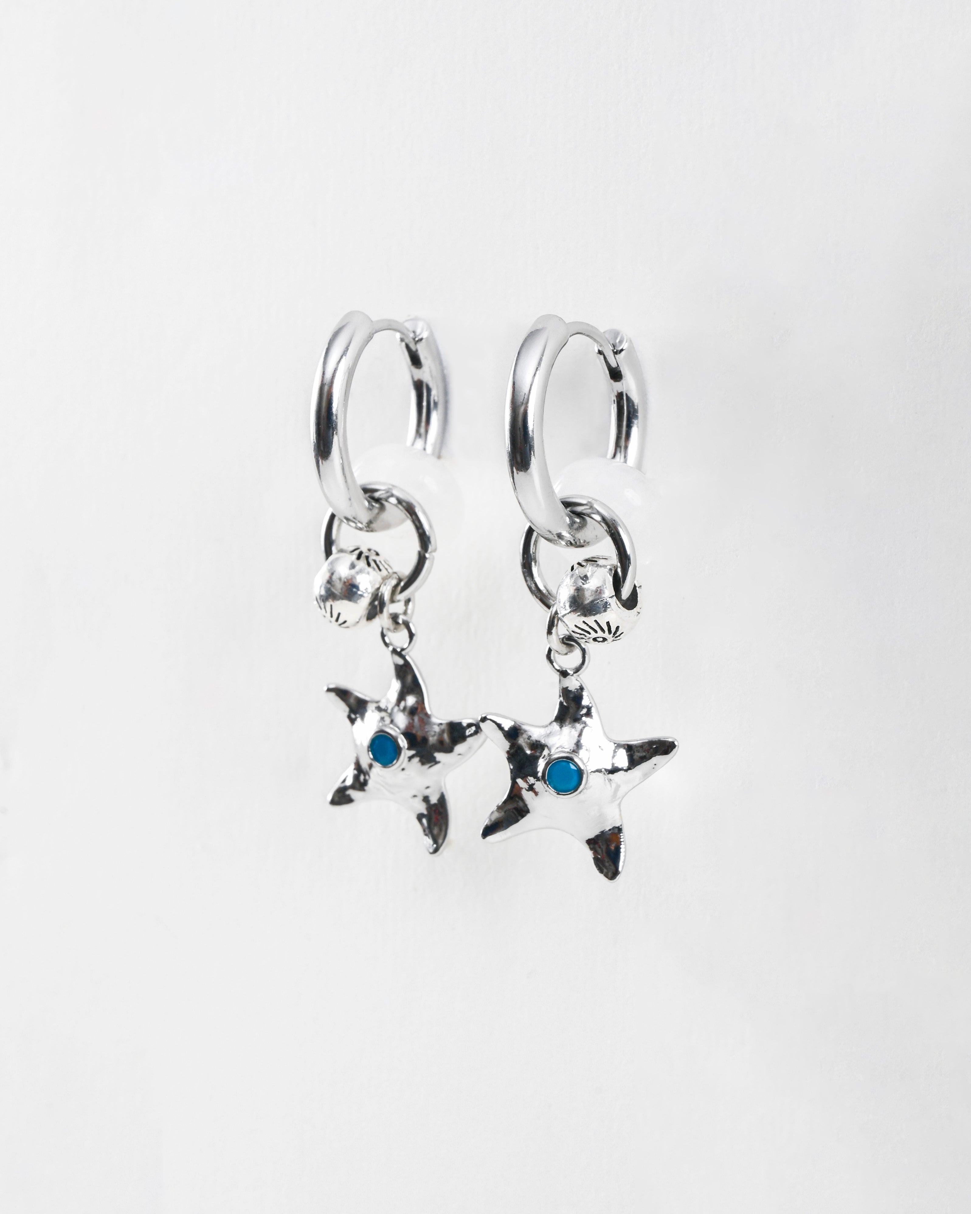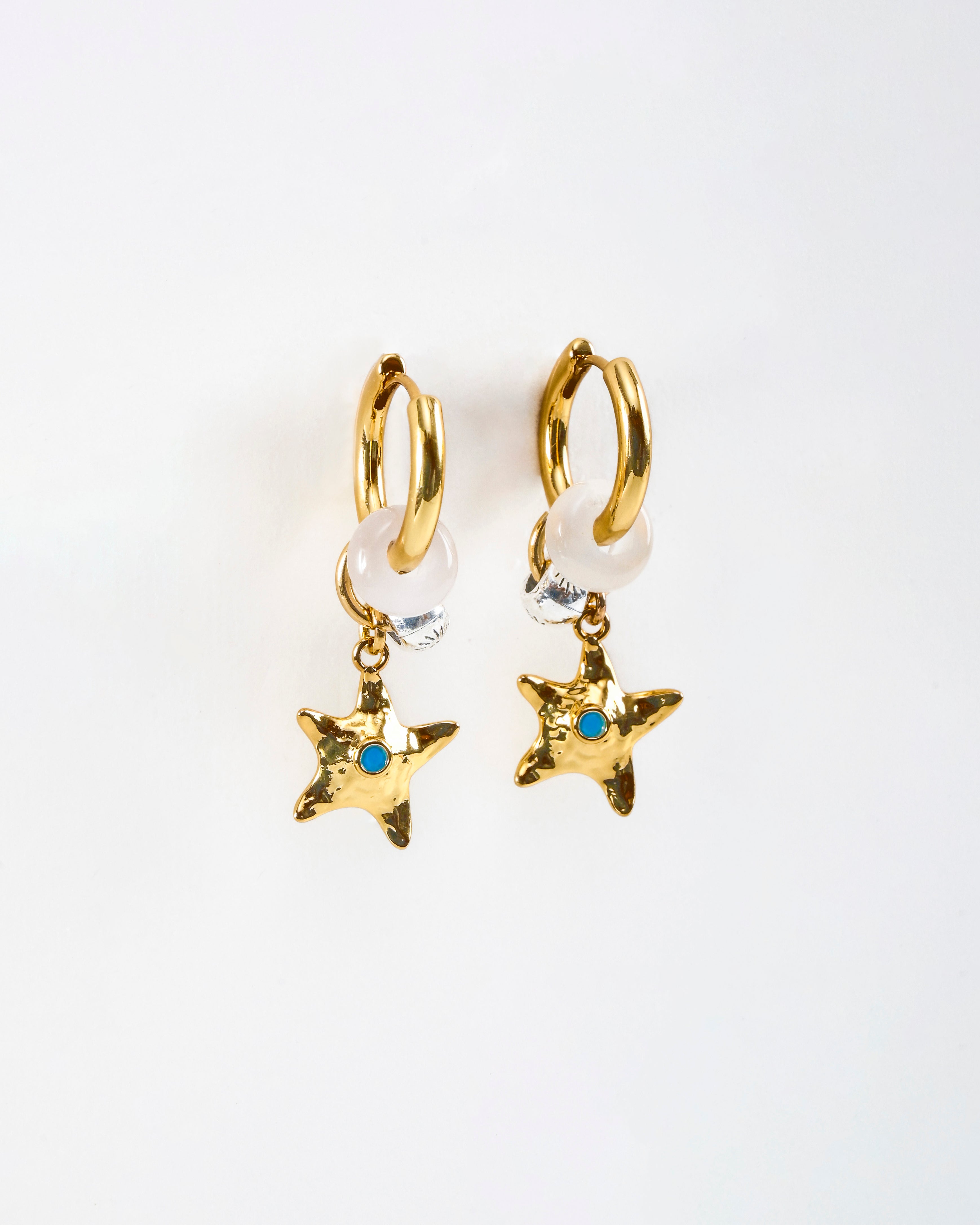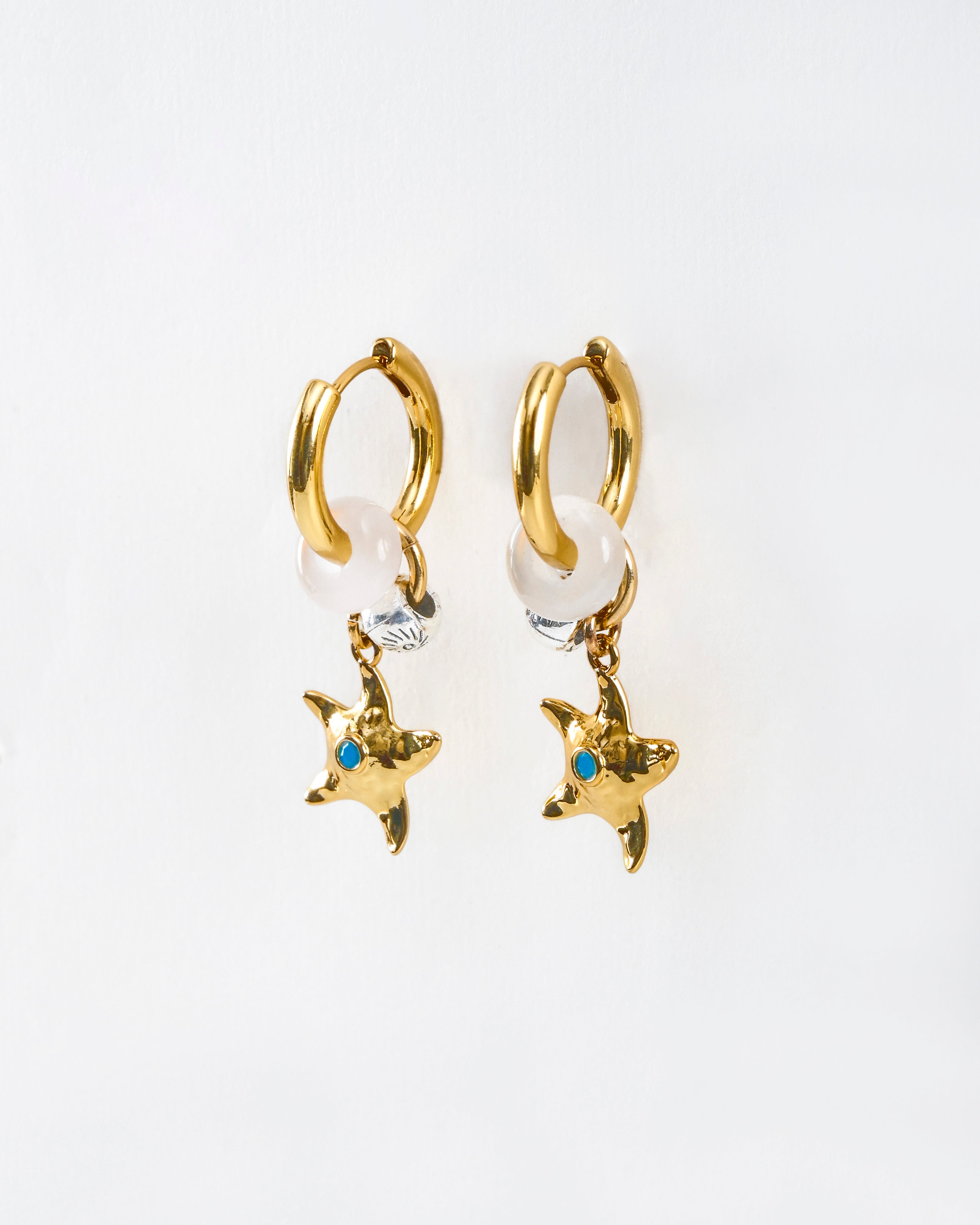 Ethereal yet grounding, the Isla Hoops draw from celestial tides and star-kissed shores. A hand-hammered star charm drops gently from misty moonstone, echoing the stillness of night skies and oceanic rhythms. At the centre, a glint of turquoise brings balance and intuition—your anchor in motion. Available in two luminous finishes: Warm Gold and Cool Silver.