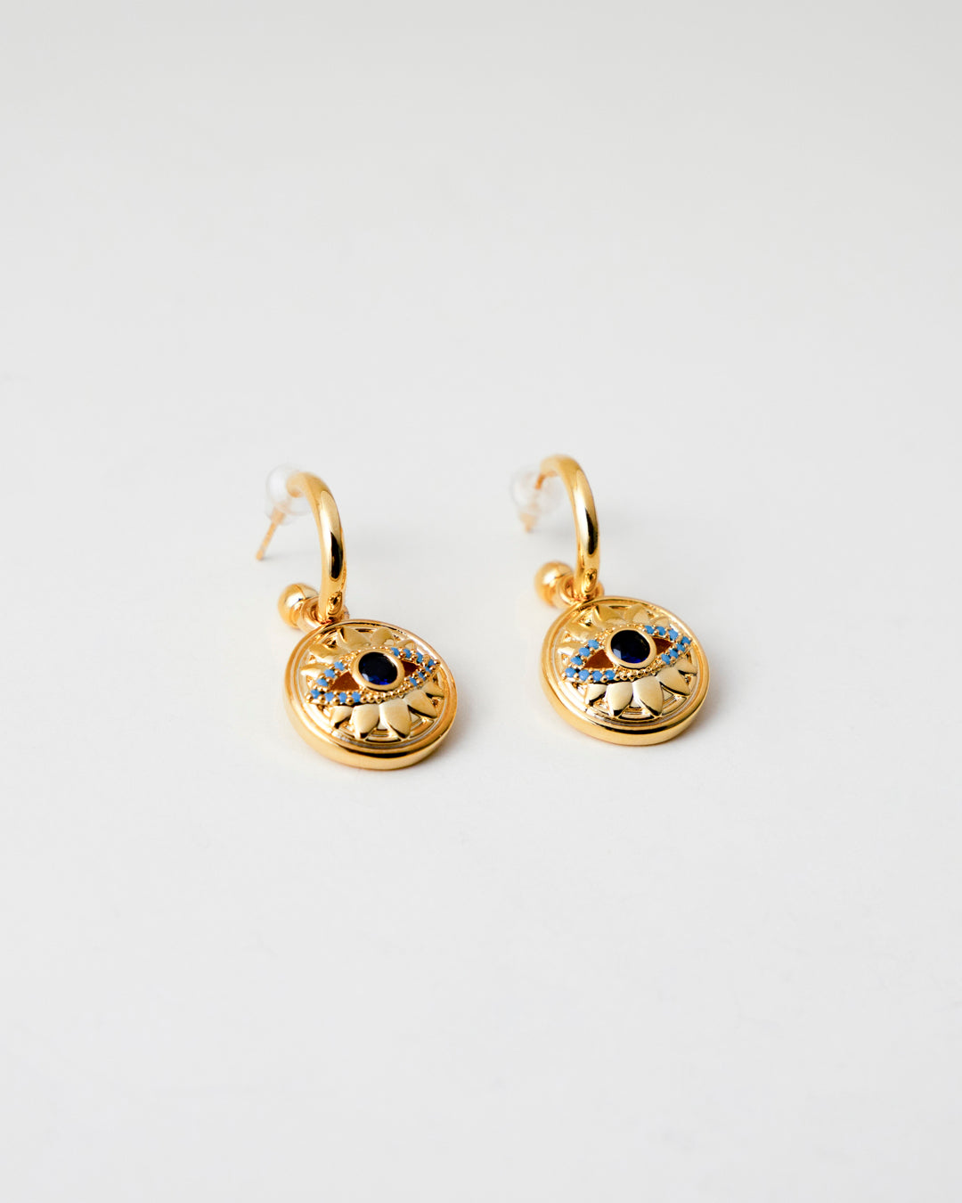 The Noor Disk Hoops feature a radiant medallion carved with a sunlit eye; a symbol of inner knowing and quiet protection. Accented with cerulean stones and deep midnight enamel, these earrings are inspired by ancient talismans believed to ward off ill will and guide your gaze inward. Wear them as your own orbit of calm - gilded, grounded, and glowing with divine light.