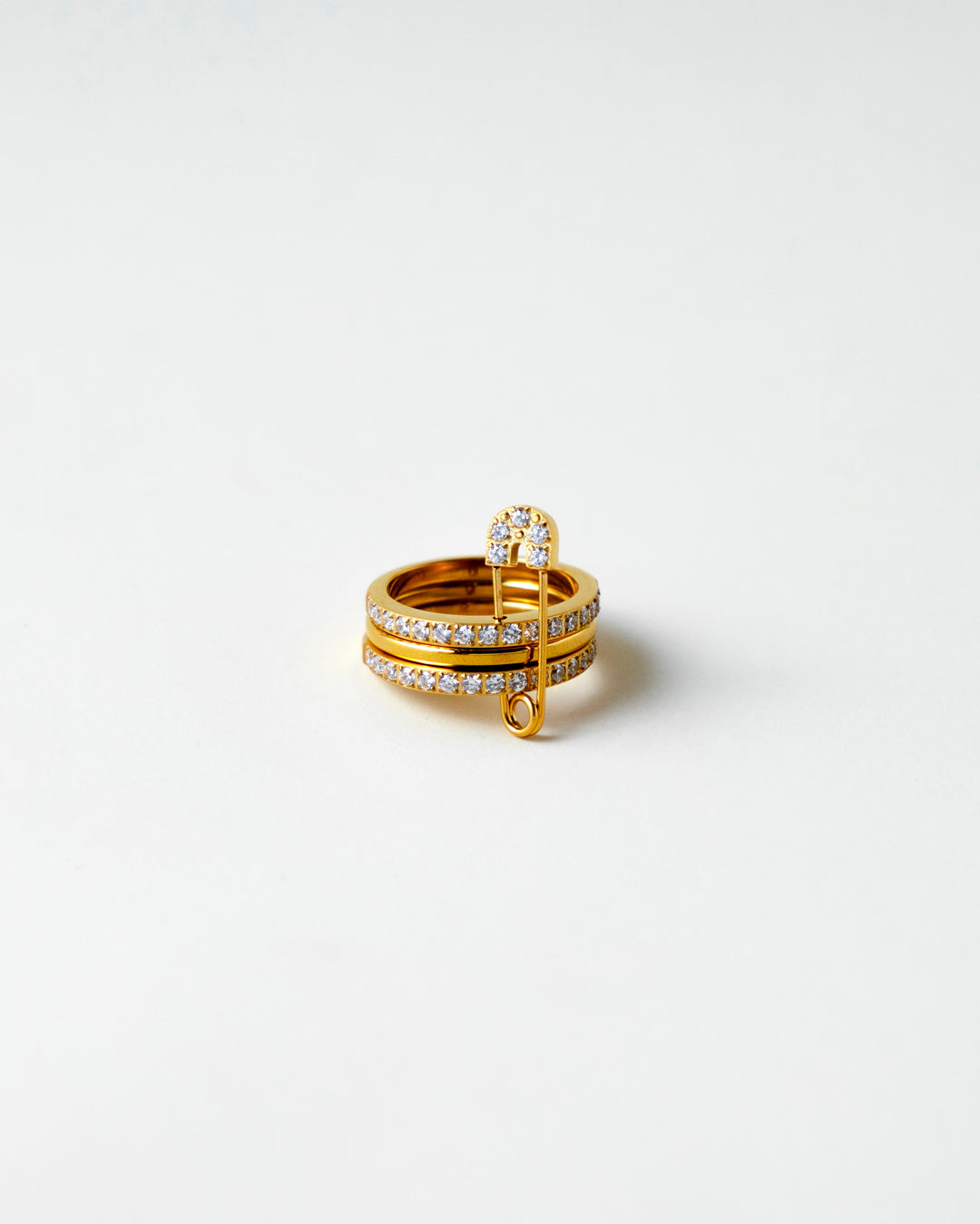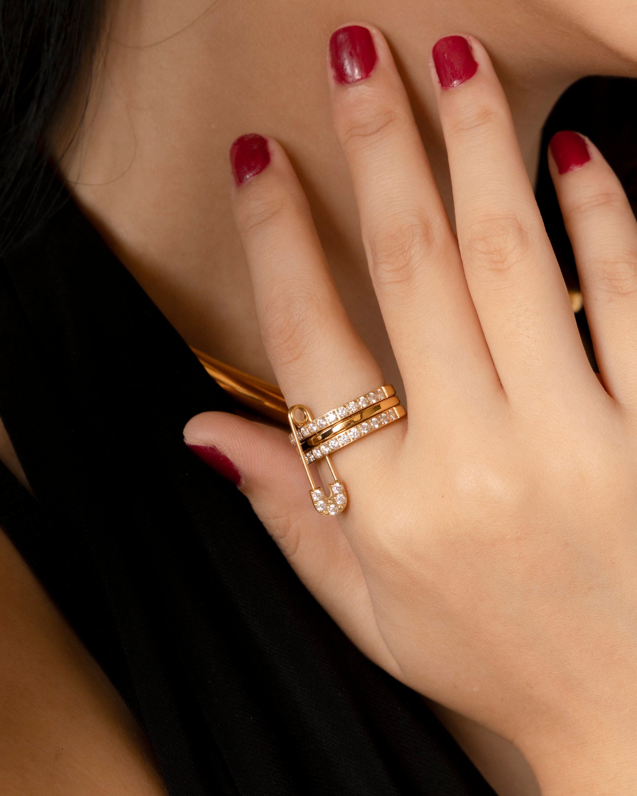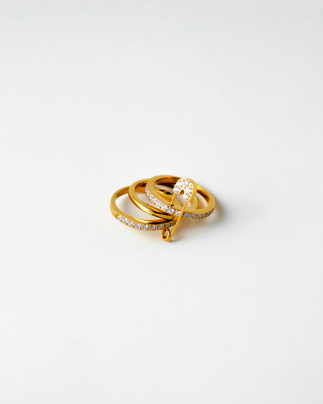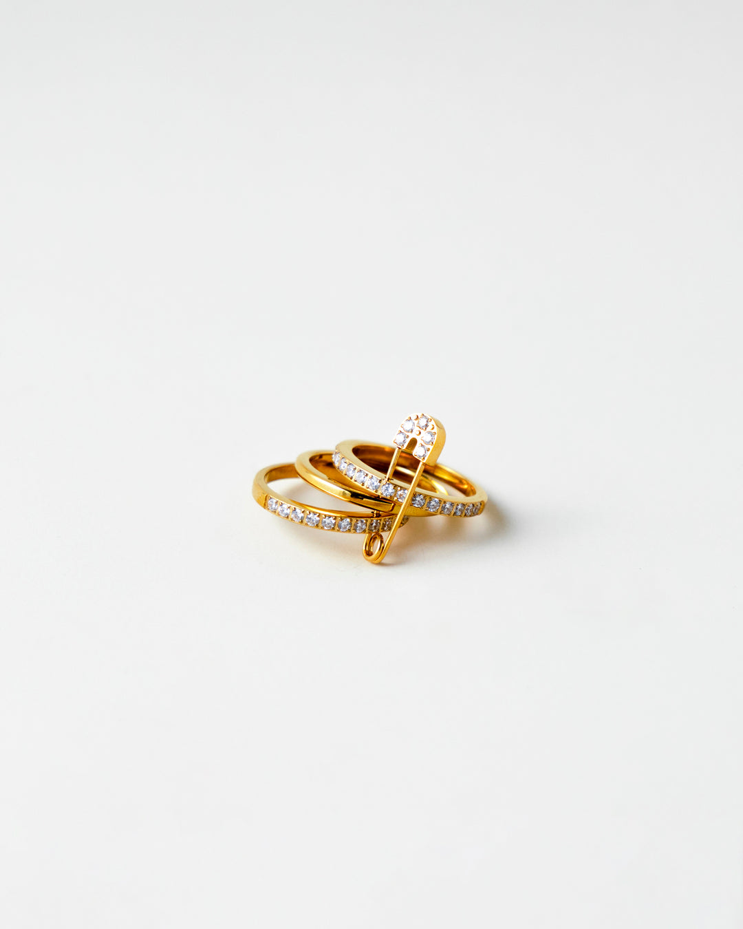 the Norah Stack brings together three polished bands and a pavé-set safety pin motif. Crafted in stainless steel and plated with 18K gold, each band is edged with crystals that catch the light at every angle. The safety pin detail adds a touch of irreverence, offsetting the classic sparkle.