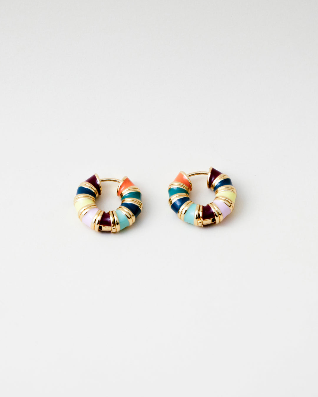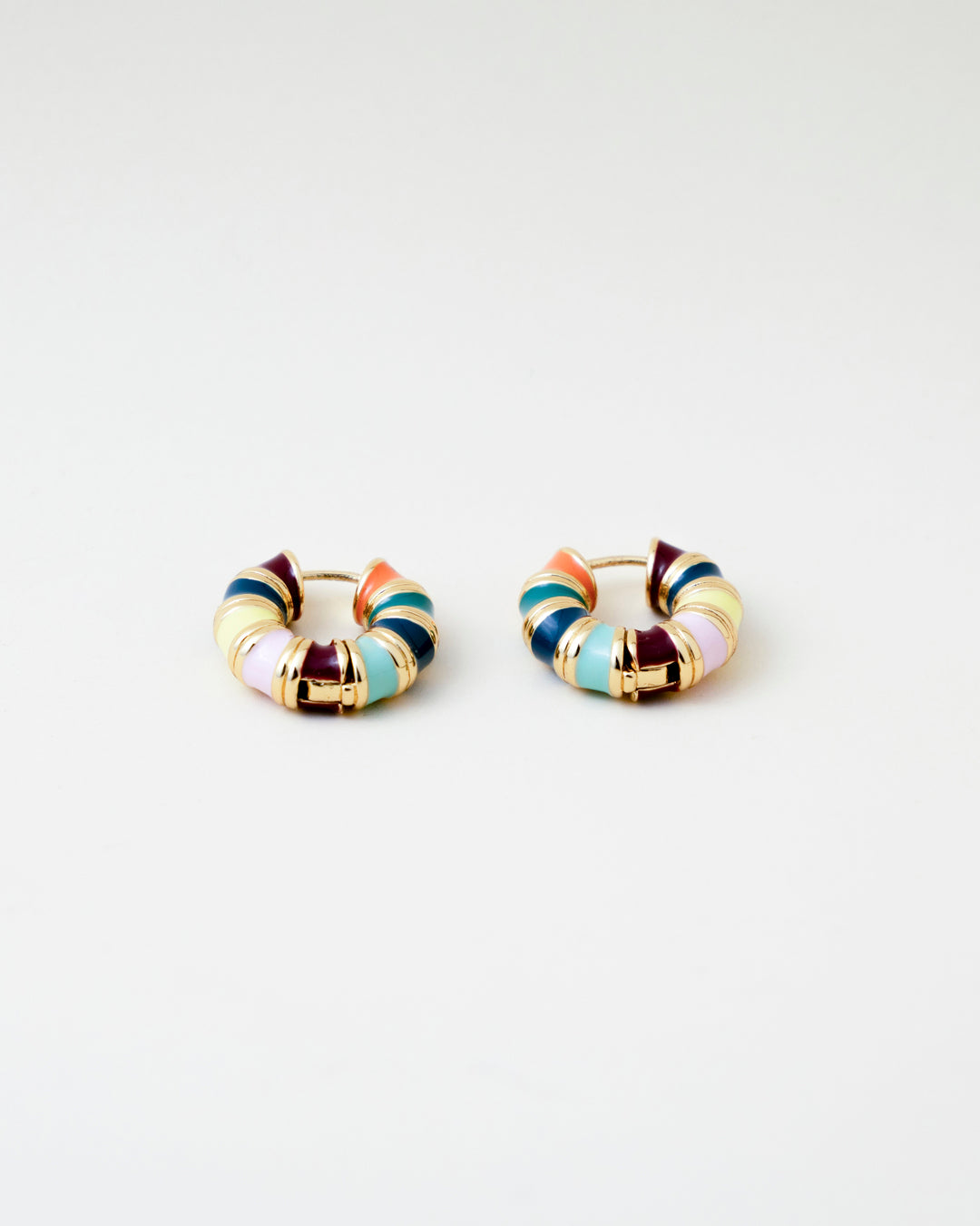A sugar rush for your ears. The Paloma Hoops are a burst of pastel brights wrapped in glossy enamel and gold-tone ridges — like a summer day scooped into stripes. With shades that echo sorbet skies, citrus spritz, and lavender haze, these chunky mini hoops are made for strolls, clinking glasses, and smiling without reason. Playful. Retro. Always in season.