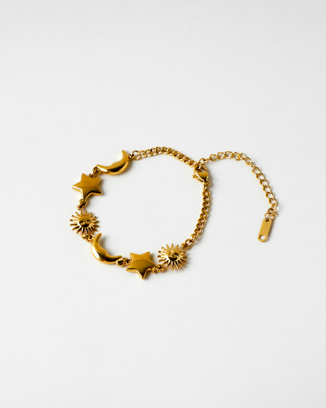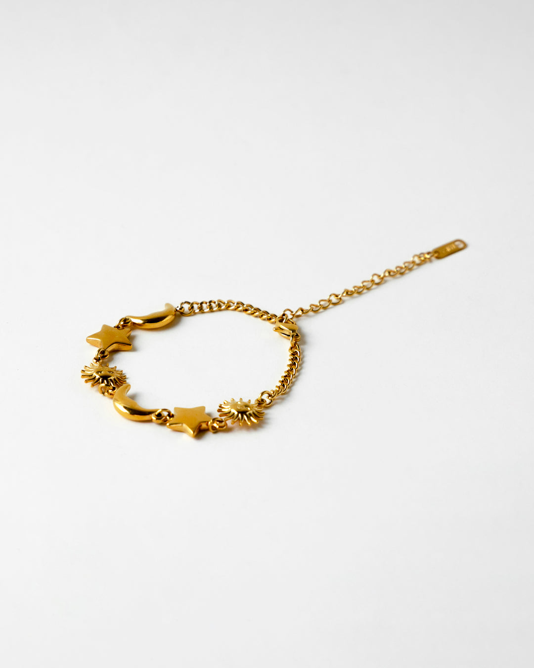 Each charm - crescent moons etched with ancient faces, bold stars, and a blazing sun - calls on different parts of your inner cosmos. Together, they echo the all-encompassing presence of a force that is stillness and storm, presence and void. It features an adjustable chain with a lobster clasp, is lightweight for daily wear making it perfect for spiritual minimalists and cosmic maximalists alike