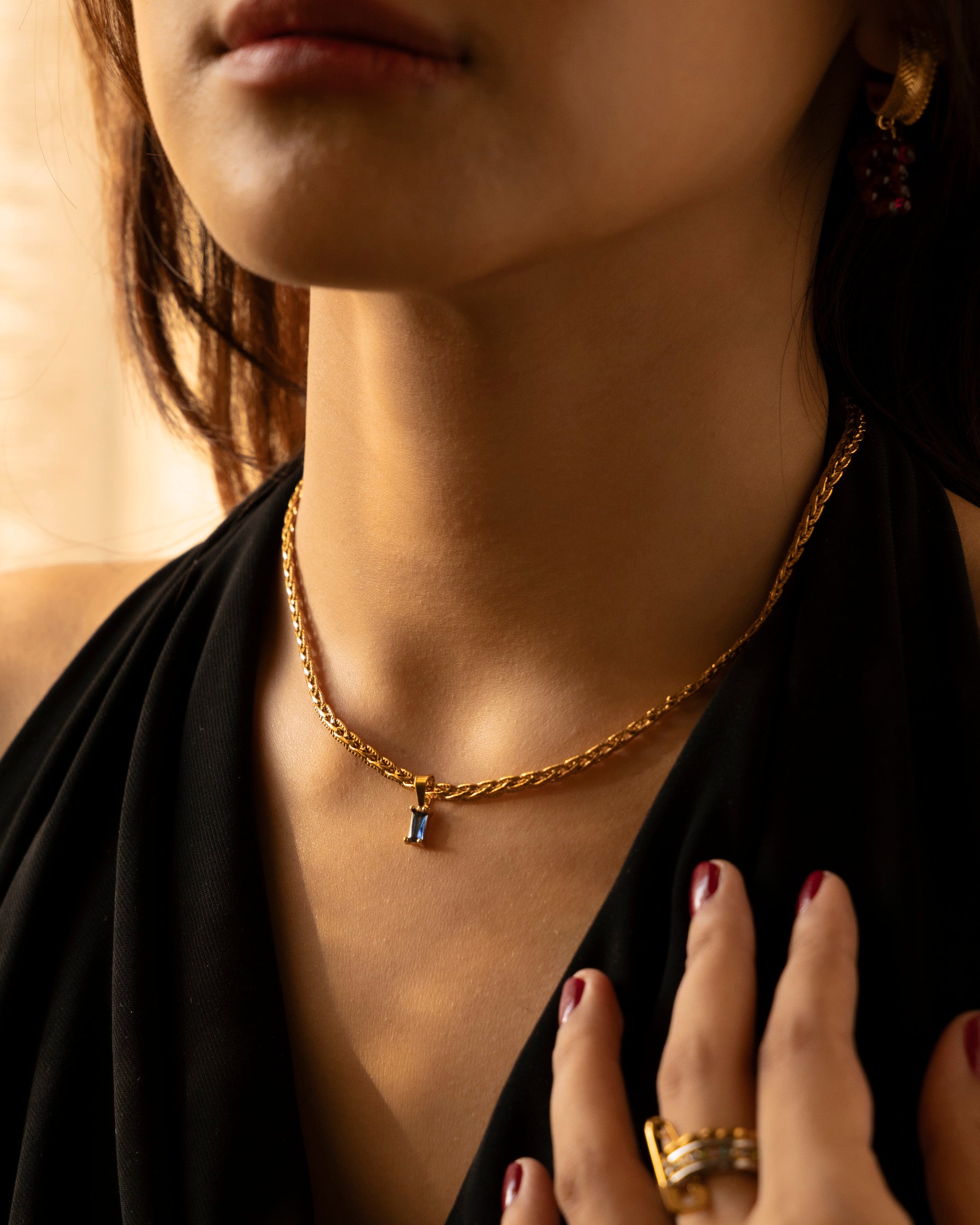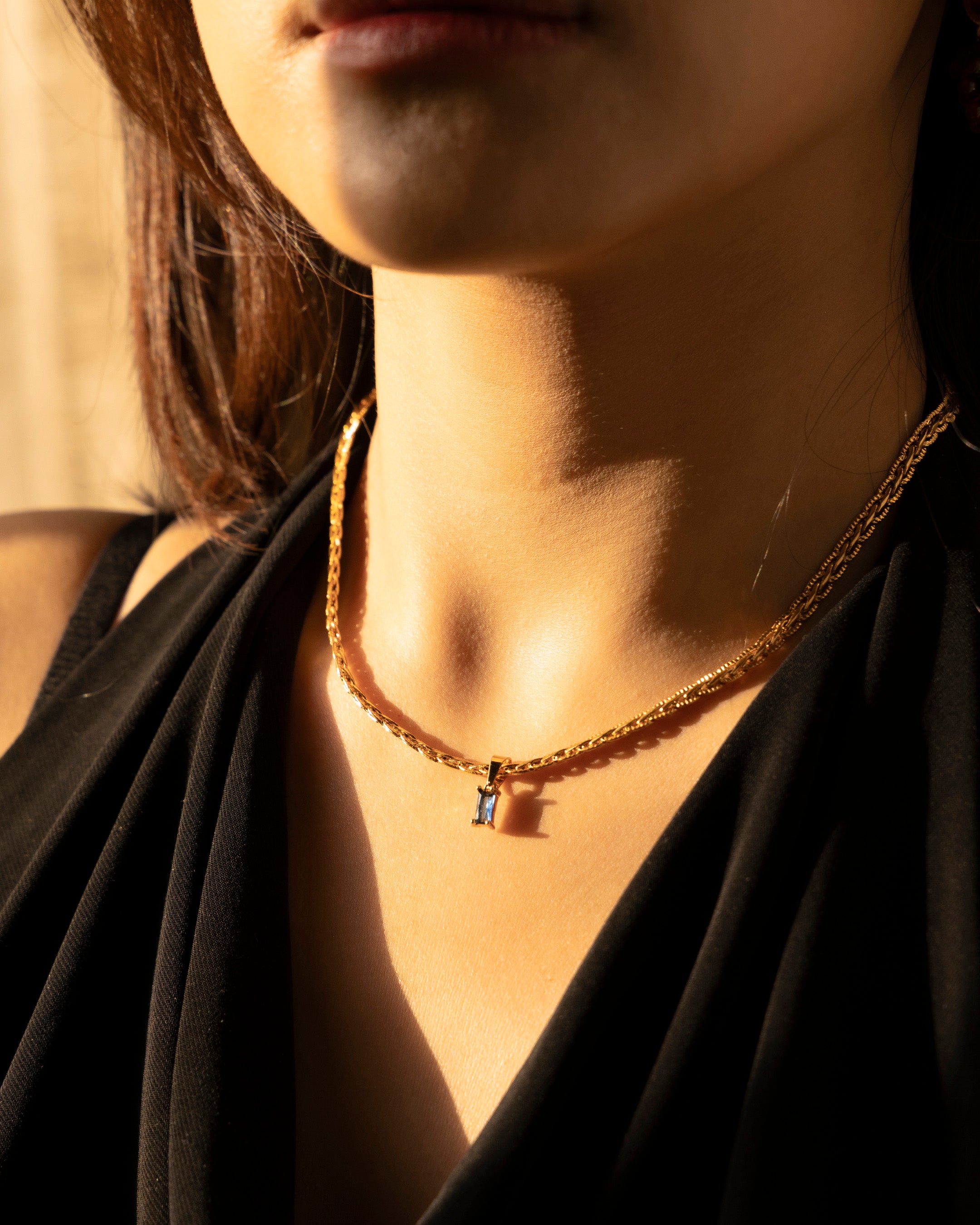 Clean lines meet saturated elegance - the Roma Pendant adds a striking drop of colour to your neckline. Featuring a baguette-cut charm in red, blue, or crystal, this one’s made for layering but strong enough to stand alone.