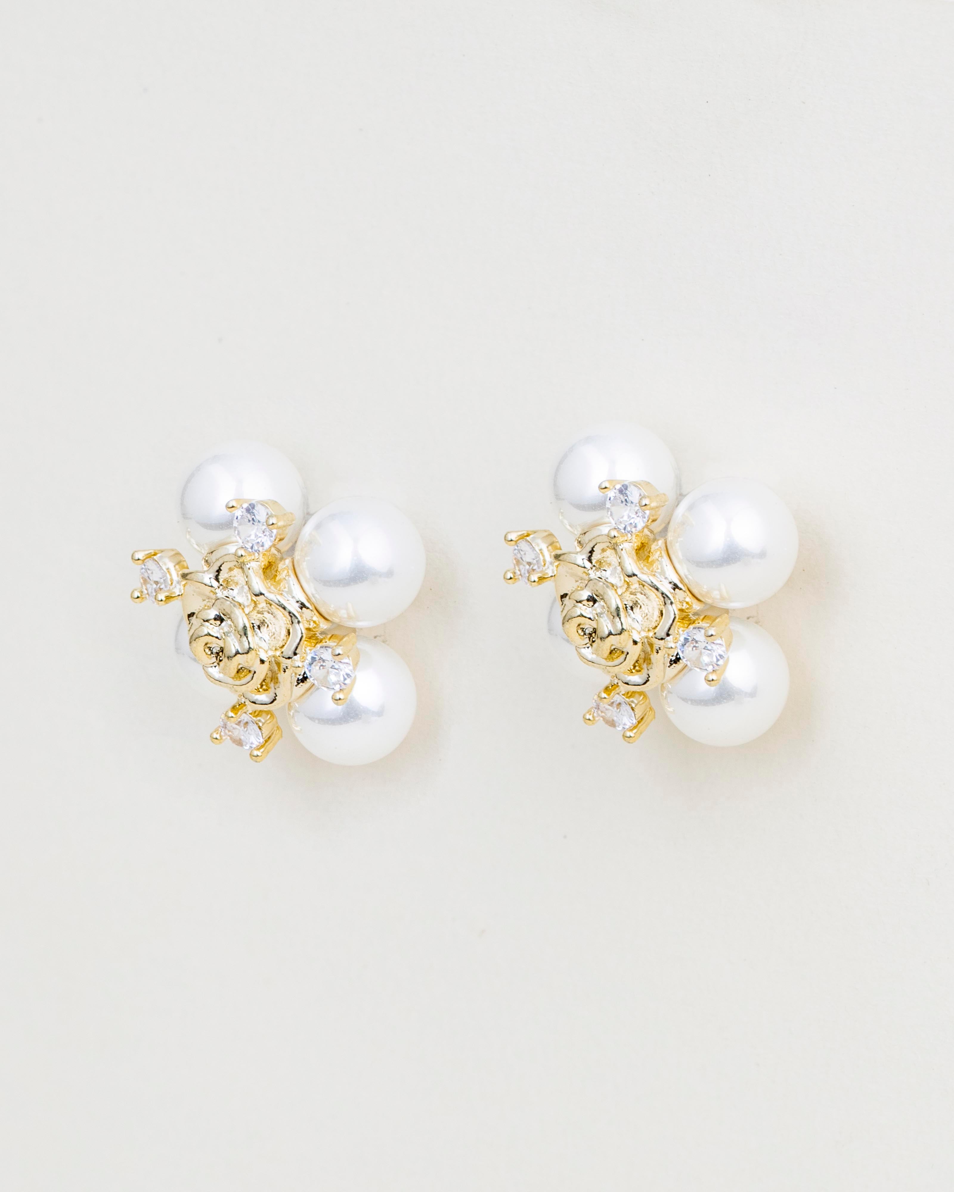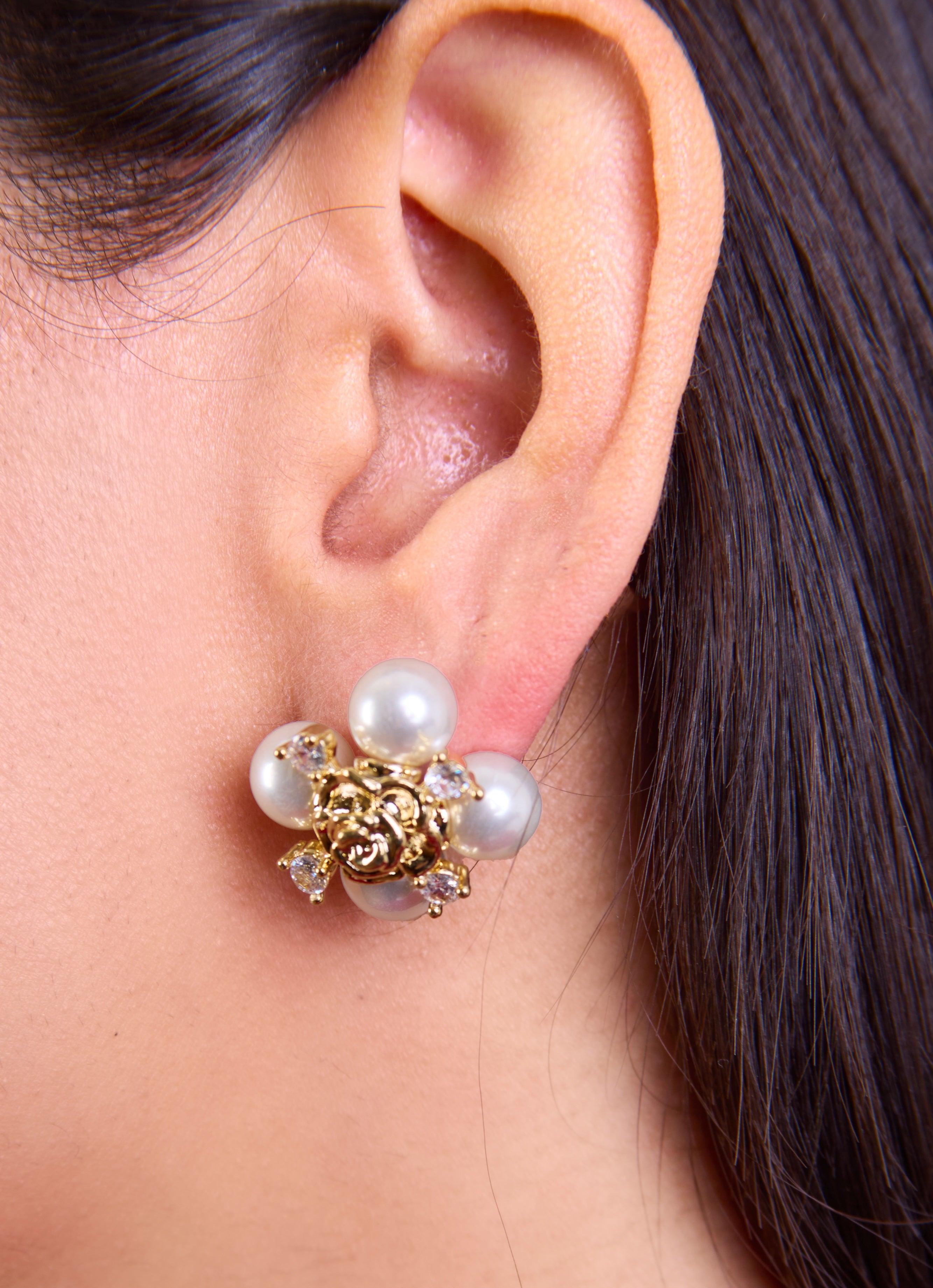 These rose motif pearl studs feature a sculpted gold rose at the center, encircled by pearls and small crystals. The mix of textures—smooth pearls, faceted stones, and the detailed metalwork—adds depth and contrast.