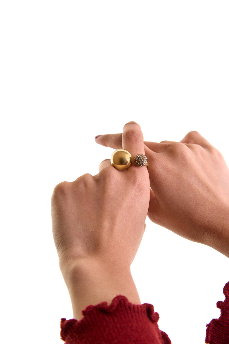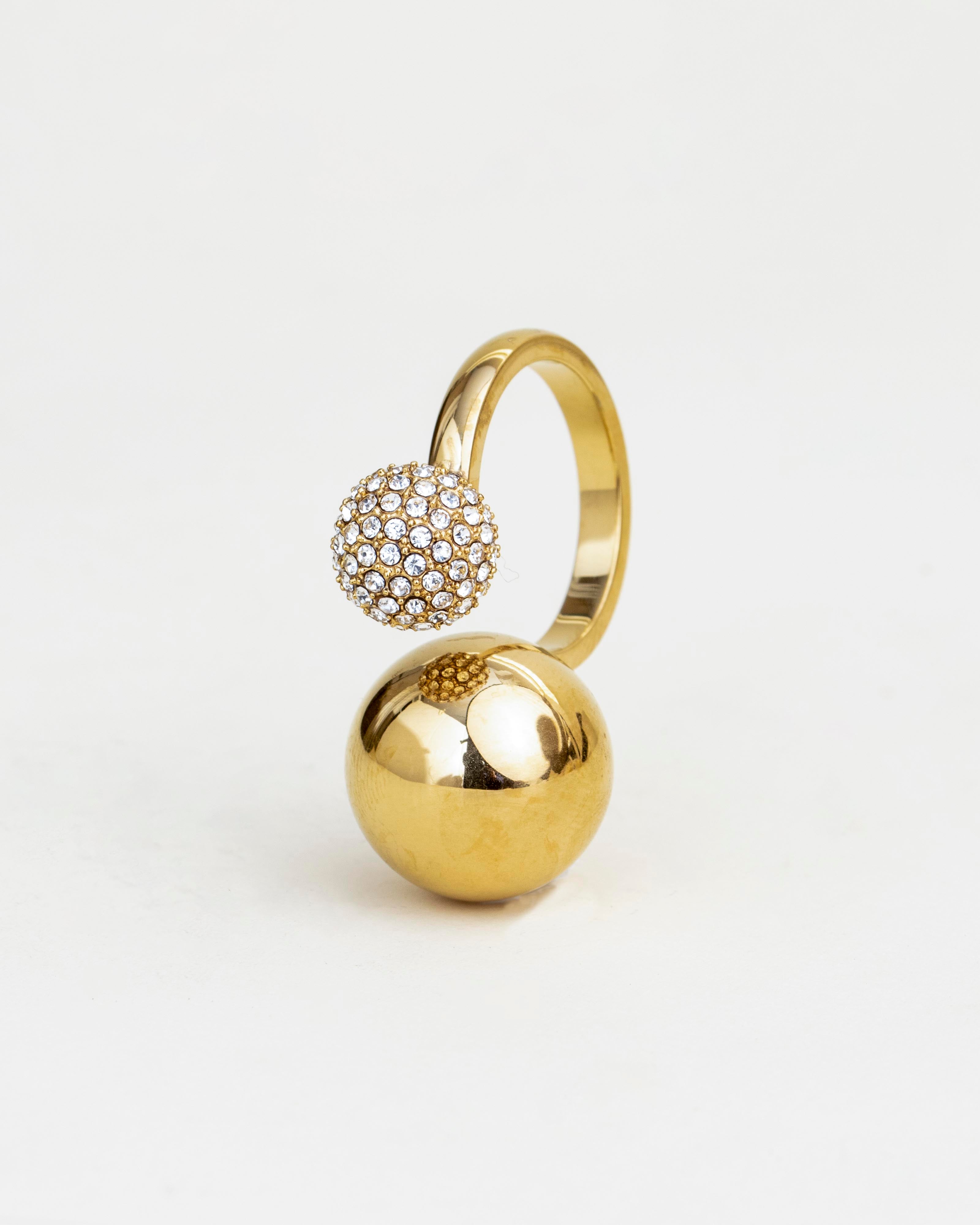 A celestial balance of contrasts—one sphere polished to a mirror-like gleam, the other dusted in pavé brilliance. Seraphina is a quiet statement, catching the light (and attention) in all the right ways.