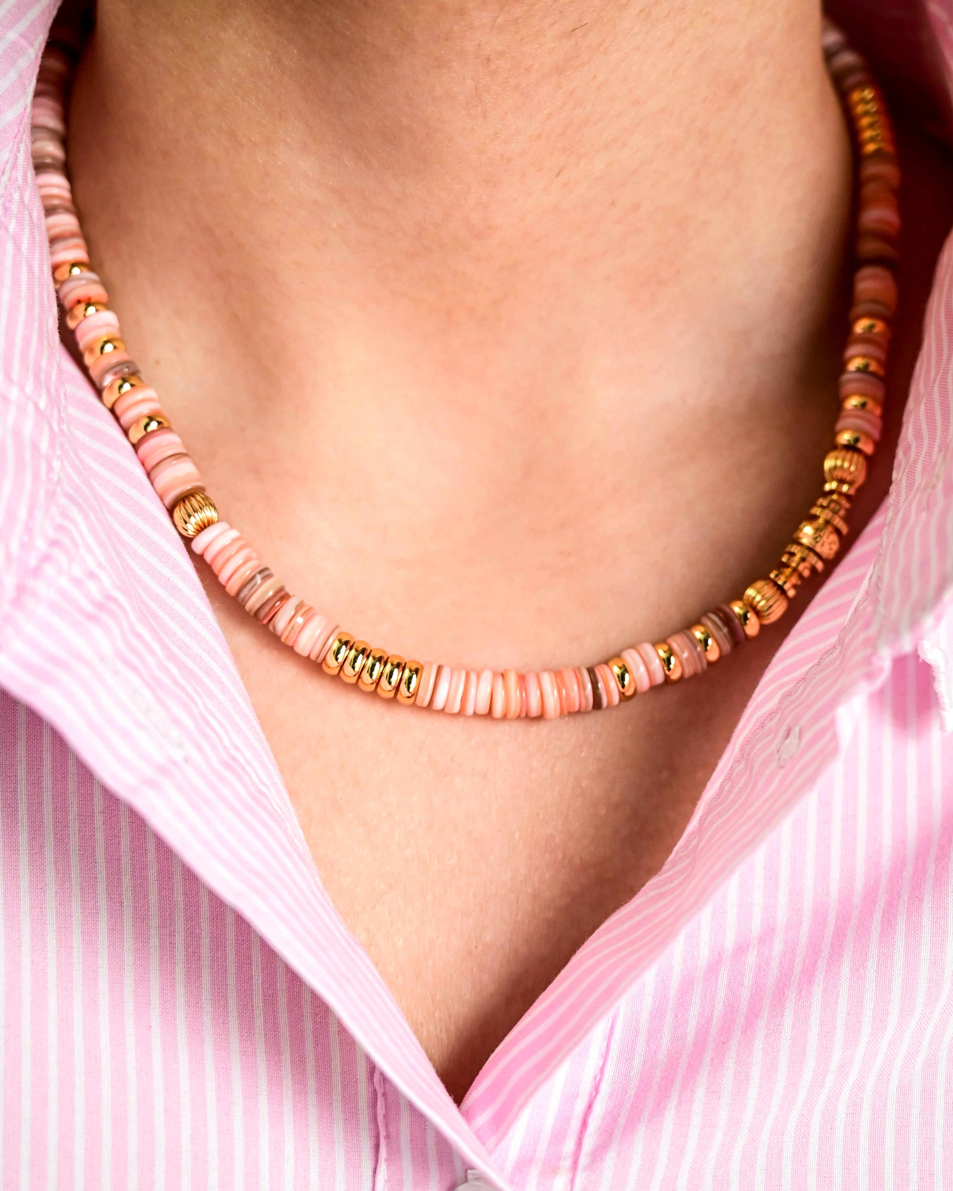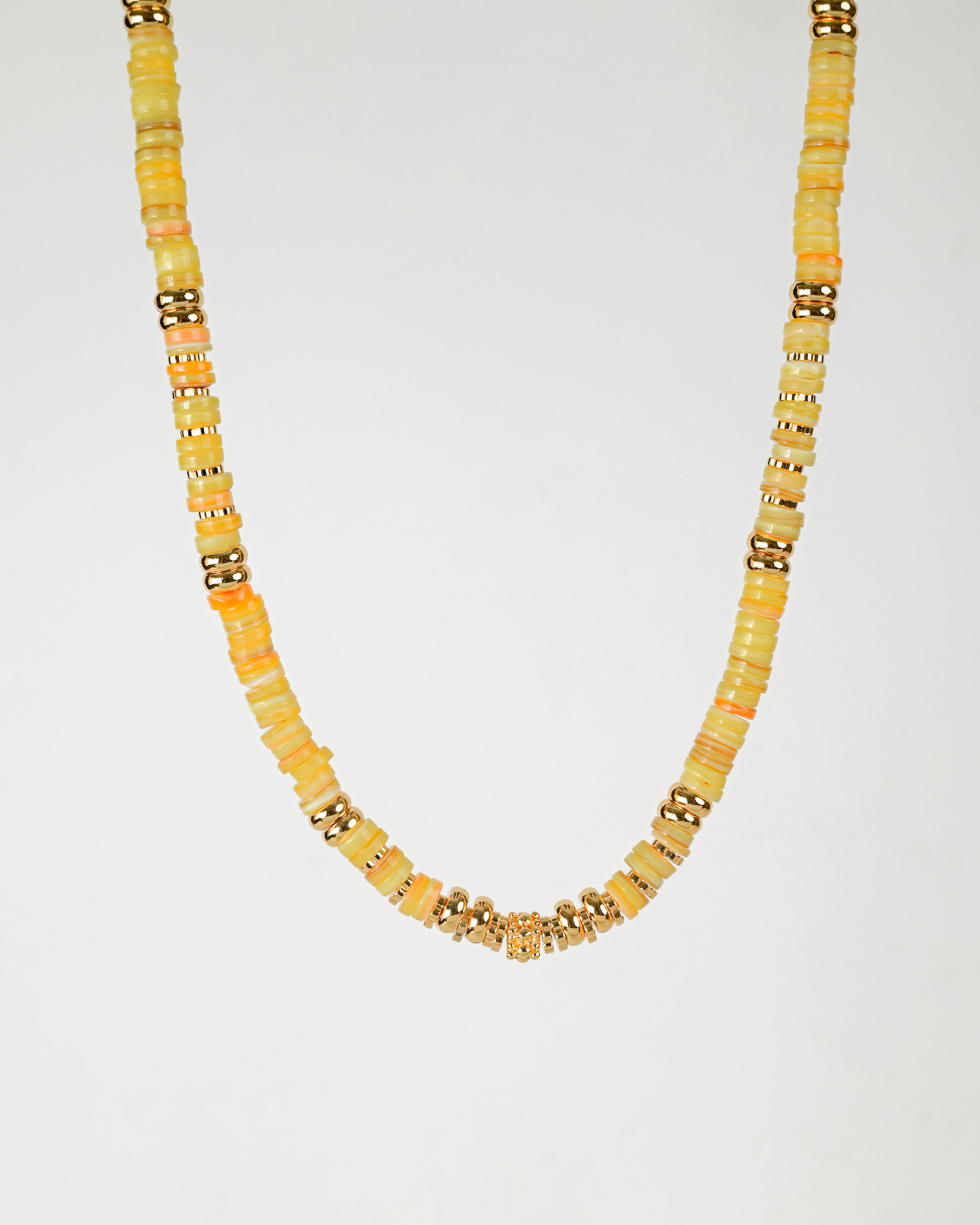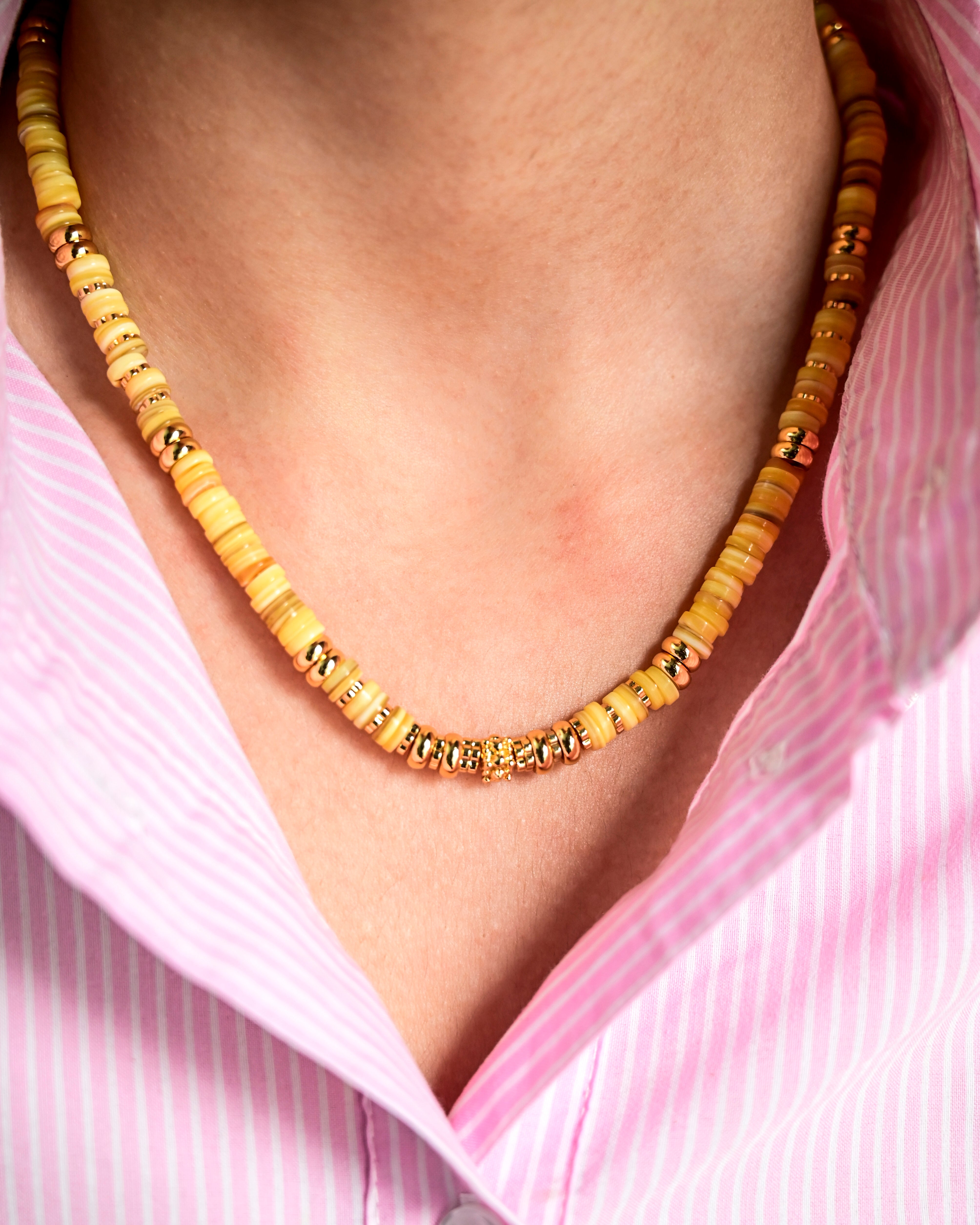Easy, breezy, and quietly luxe. The Soft Serve necklaces are made with disc-shaped resin beads and gold accents, finished with a textured centrepiece that adds just the right touch of polish. Designed to sit close to the neck, they’re perfect for stacking or standing solo. Available in two delectable colourways: Guava Pink and Mango Yellow.