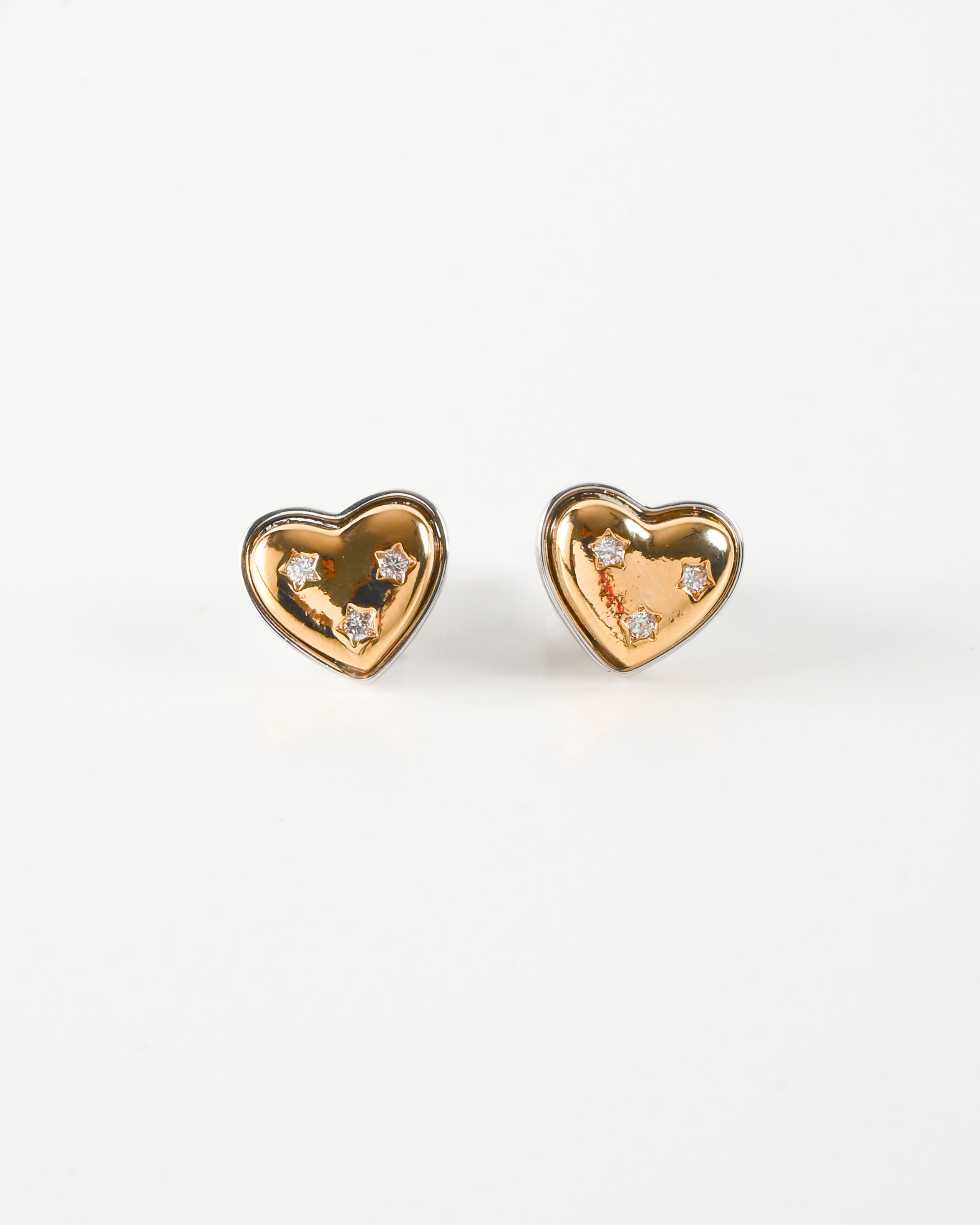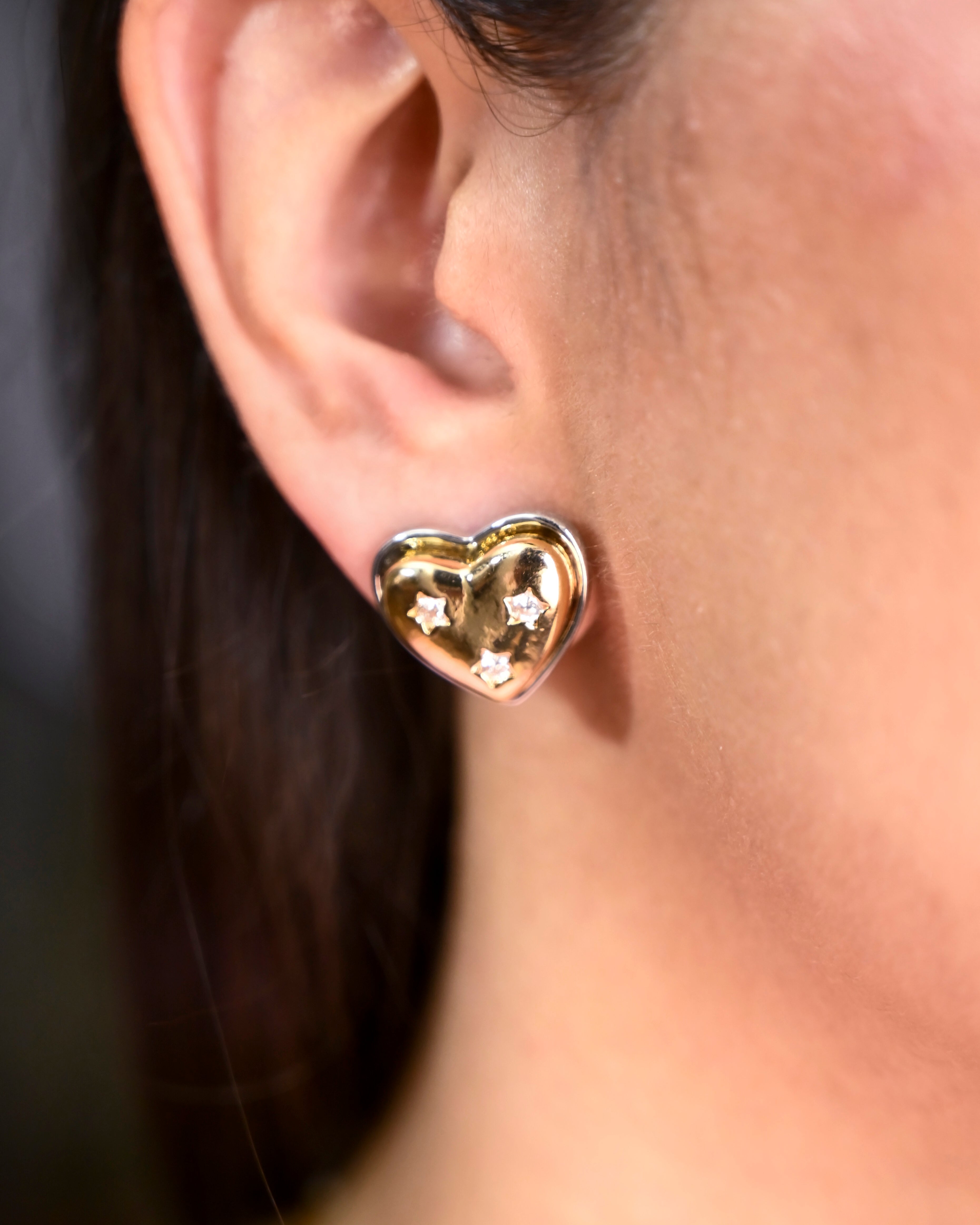 Glossy gold hearts framed in silver, set with tiny star-like crystals. A quiet glint of playfulness - wearable with everything, forgettable to none.