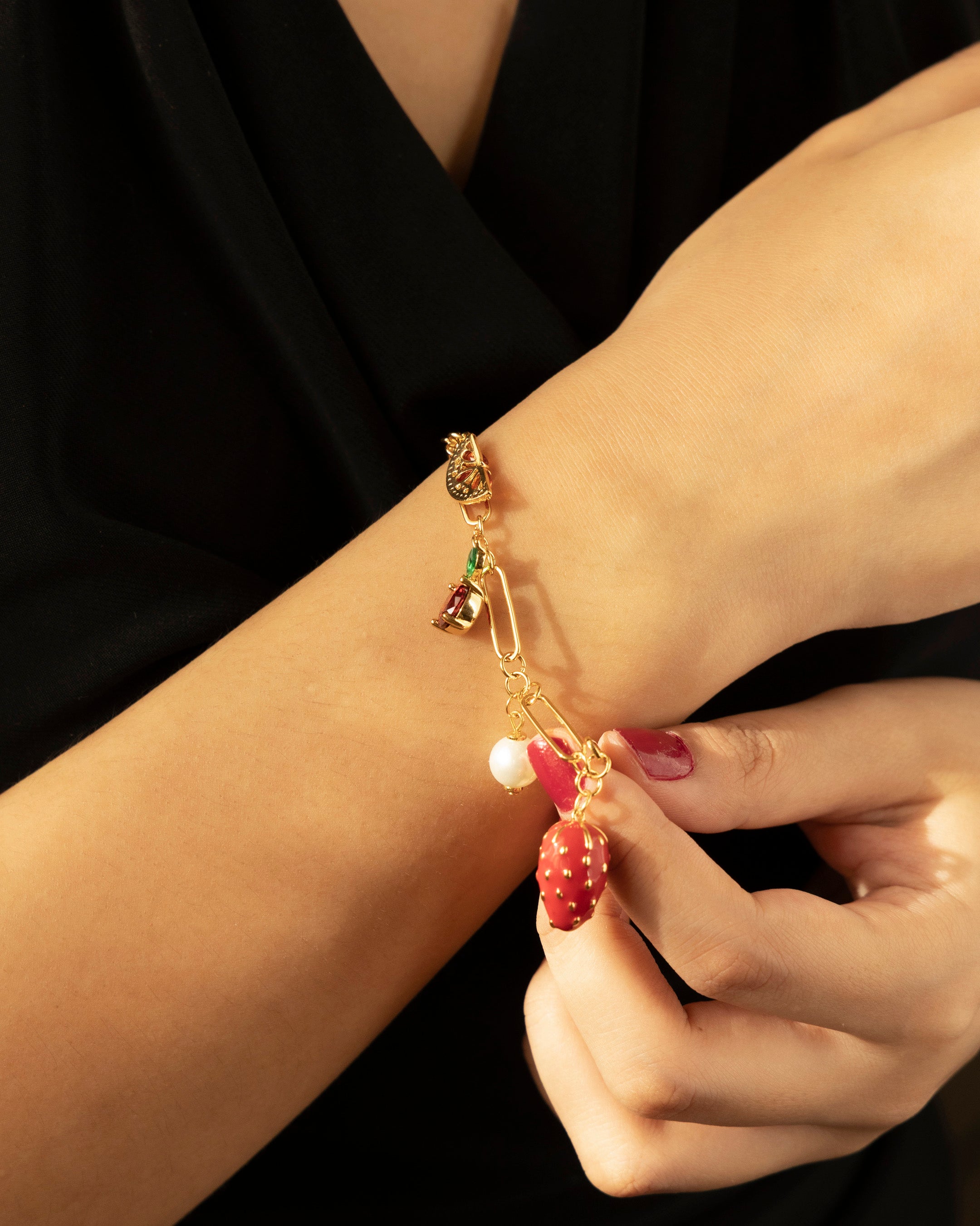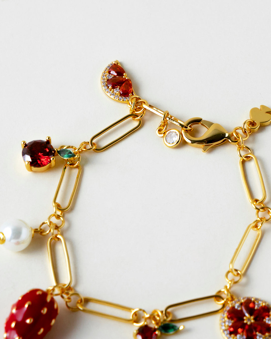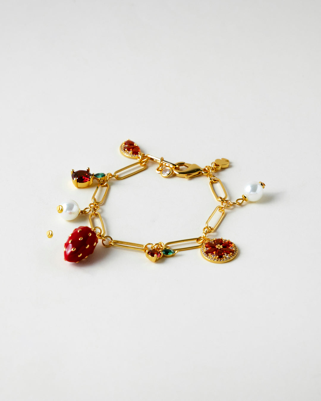 Delicate gold paperclip links hold an ensemble of charms that swing with every move — a vibrant strawberry, dainty florals, twinkling stones, and pearls that add just the right amount of gloss. Lightweight yet full of whimsy, it’s a sweet treat for those who live in colour.