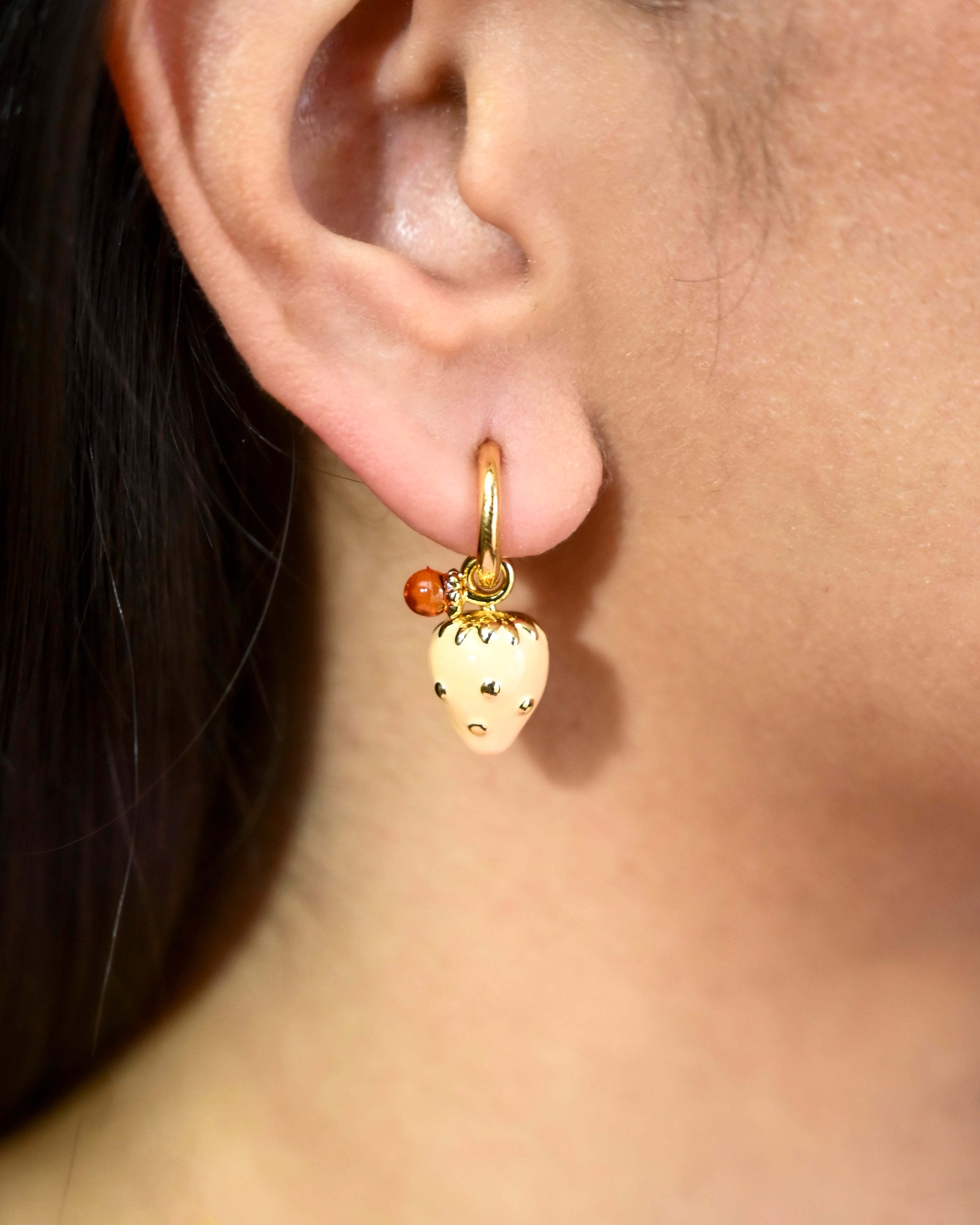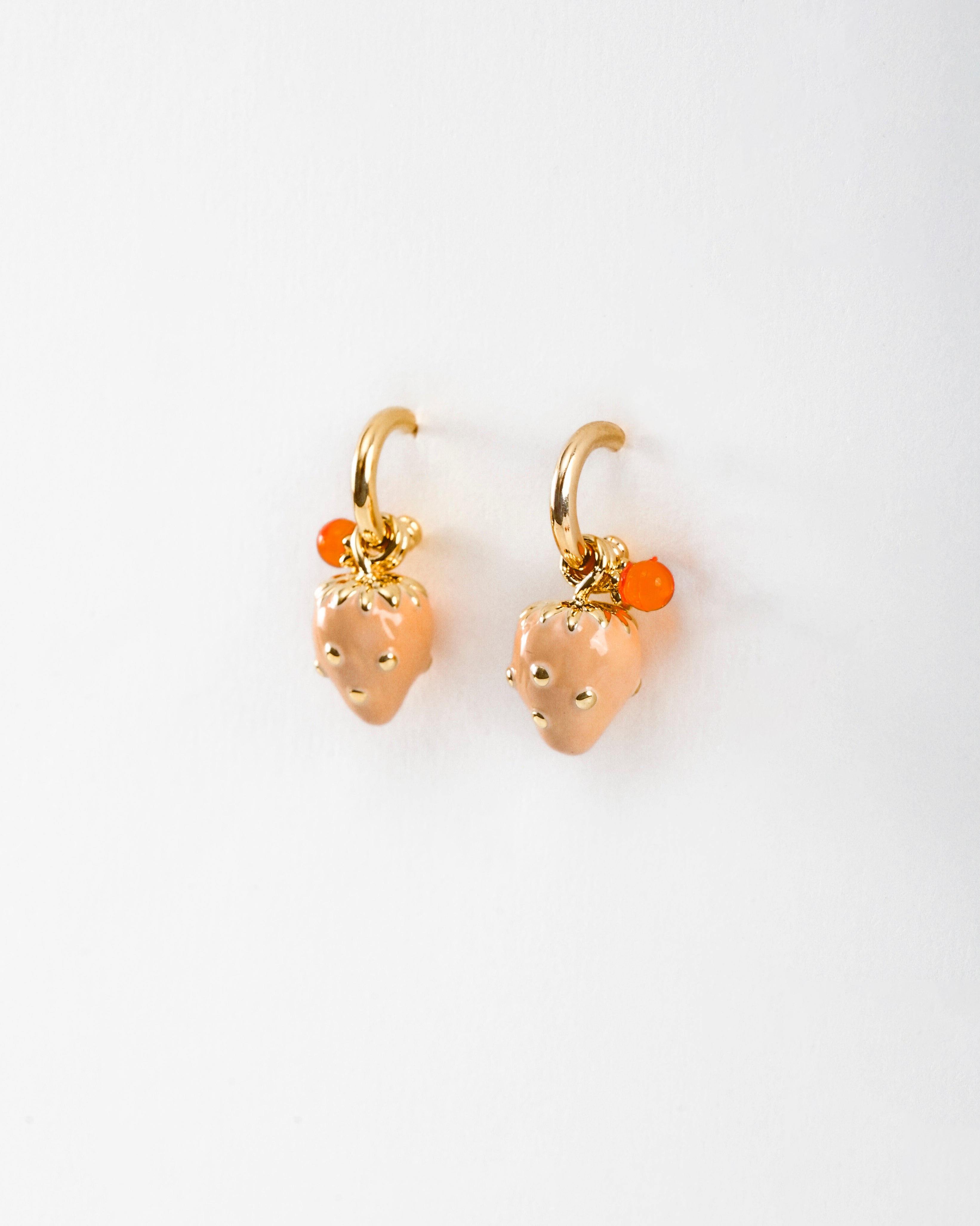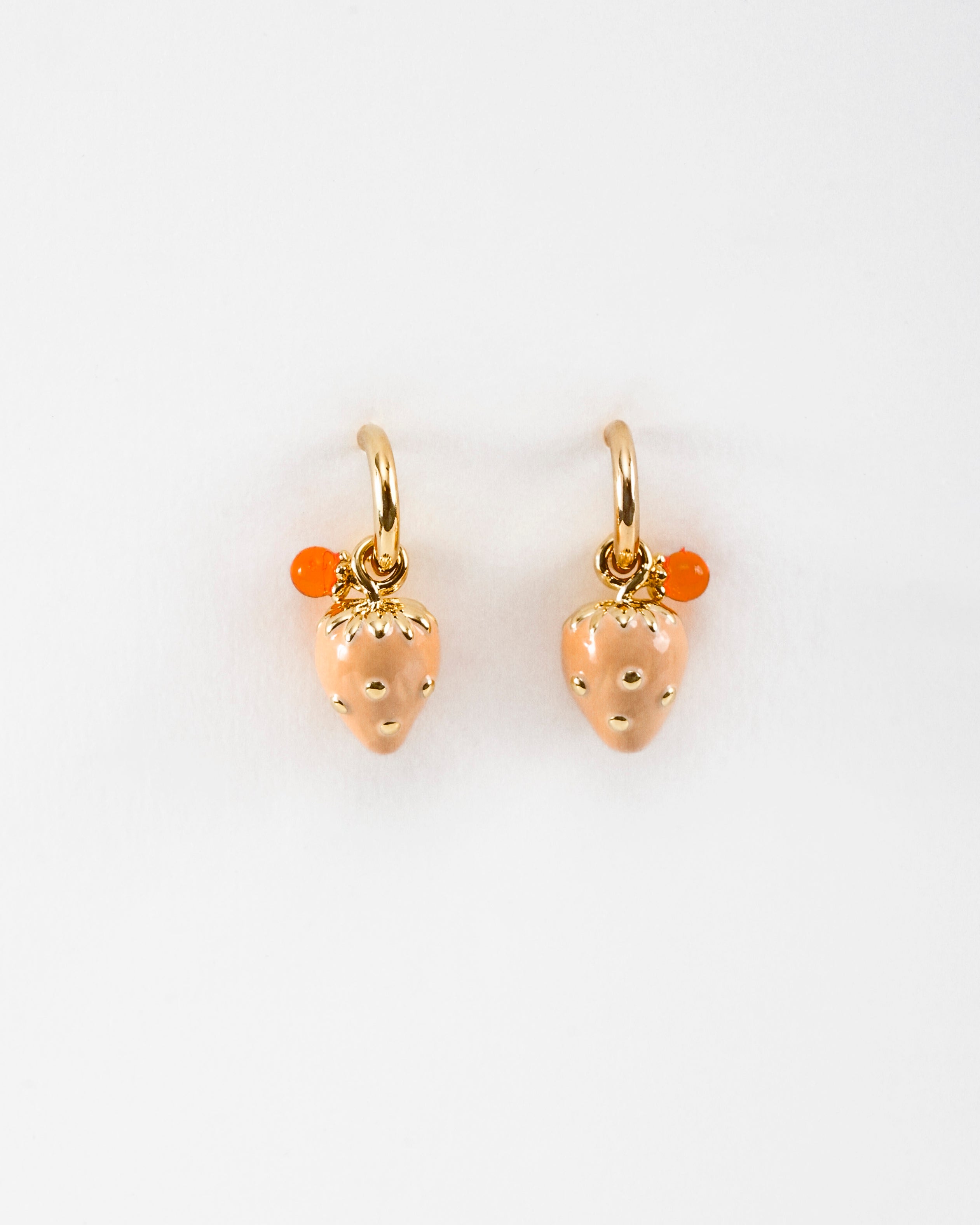 Juicy, cheeky, and just the right touch of kitsch, this blush-toned strawberry charm with gold dot detailing is a playful ode to sun-drenched afternoons and sweet indulgences. Hung on a dainty gold-toned hoop with a pop of tangerine crystal, it’s a wearable wink to your inner flirt.
