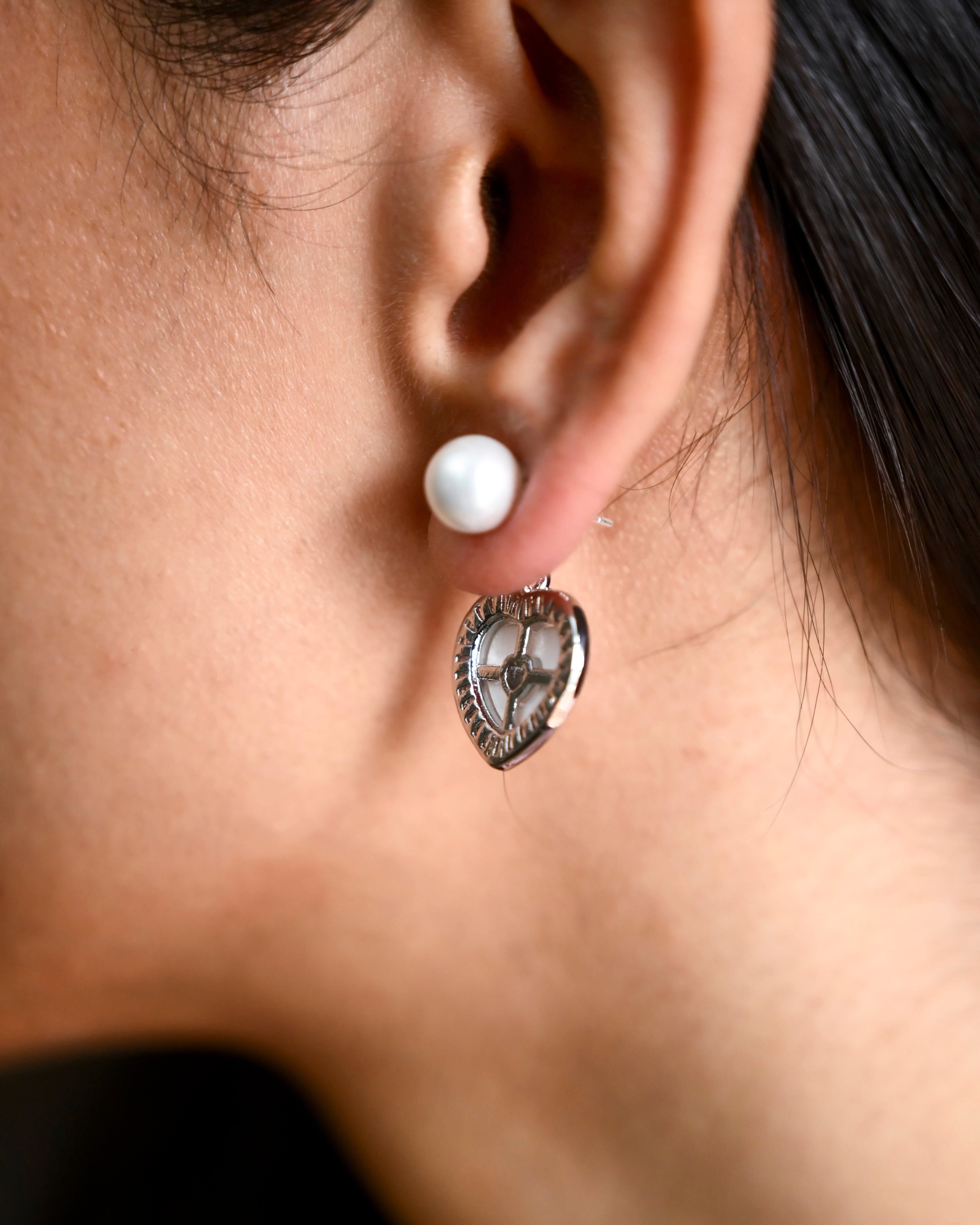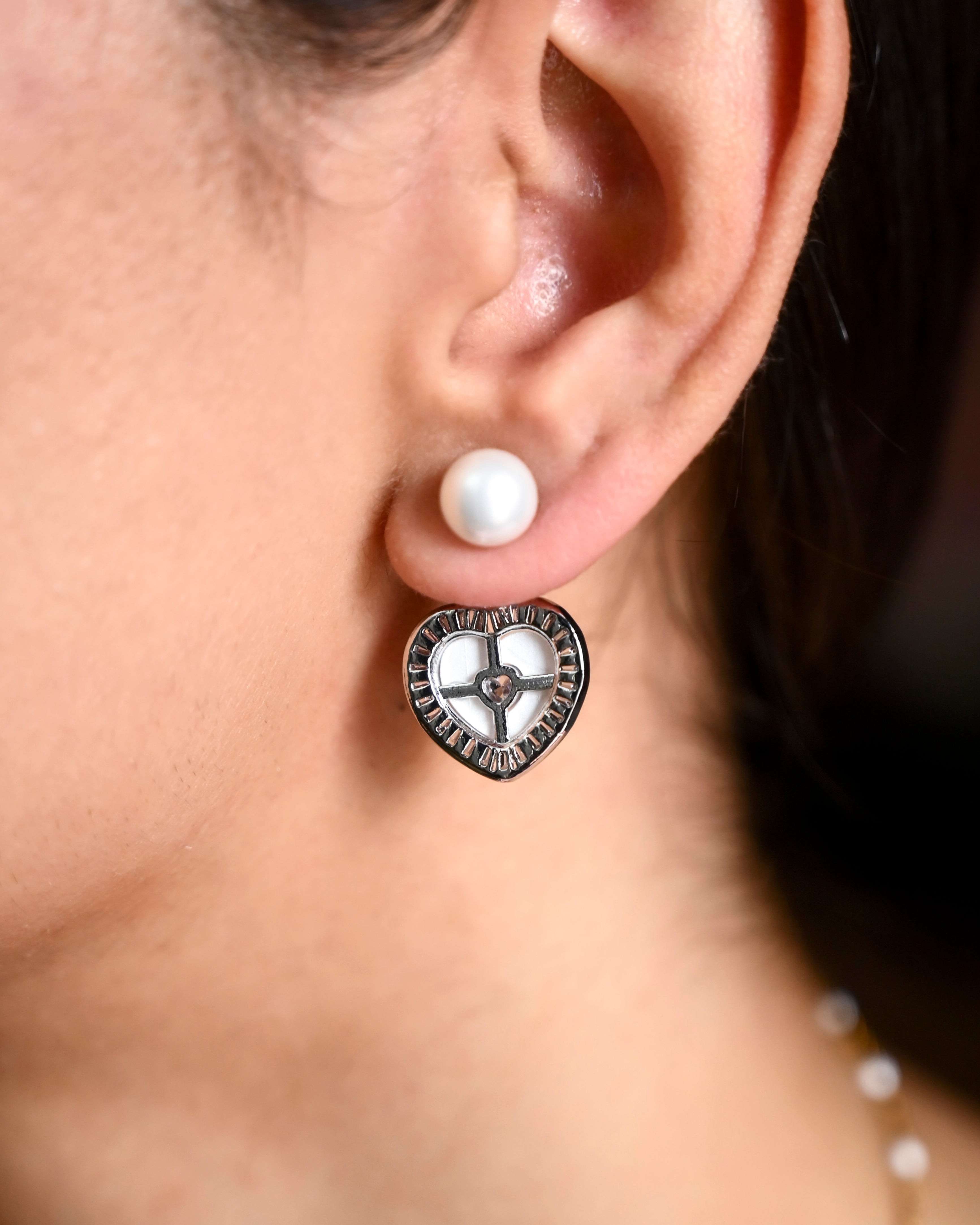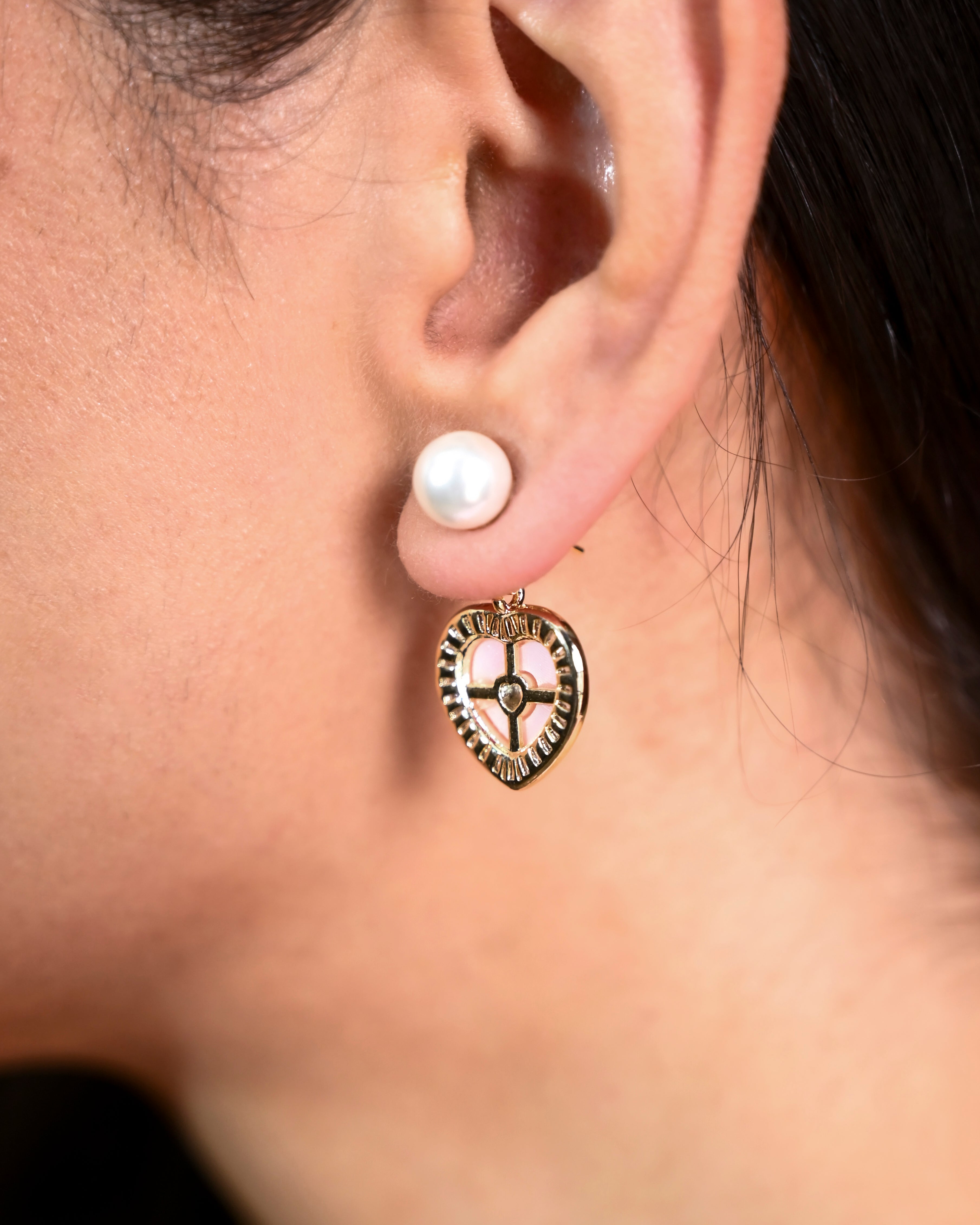 A pearl-topped stud with a swinging heart, framed in baguette crystals and finished in soft enamel. Available in blush pink or icy white; a little girlish, a little grown.