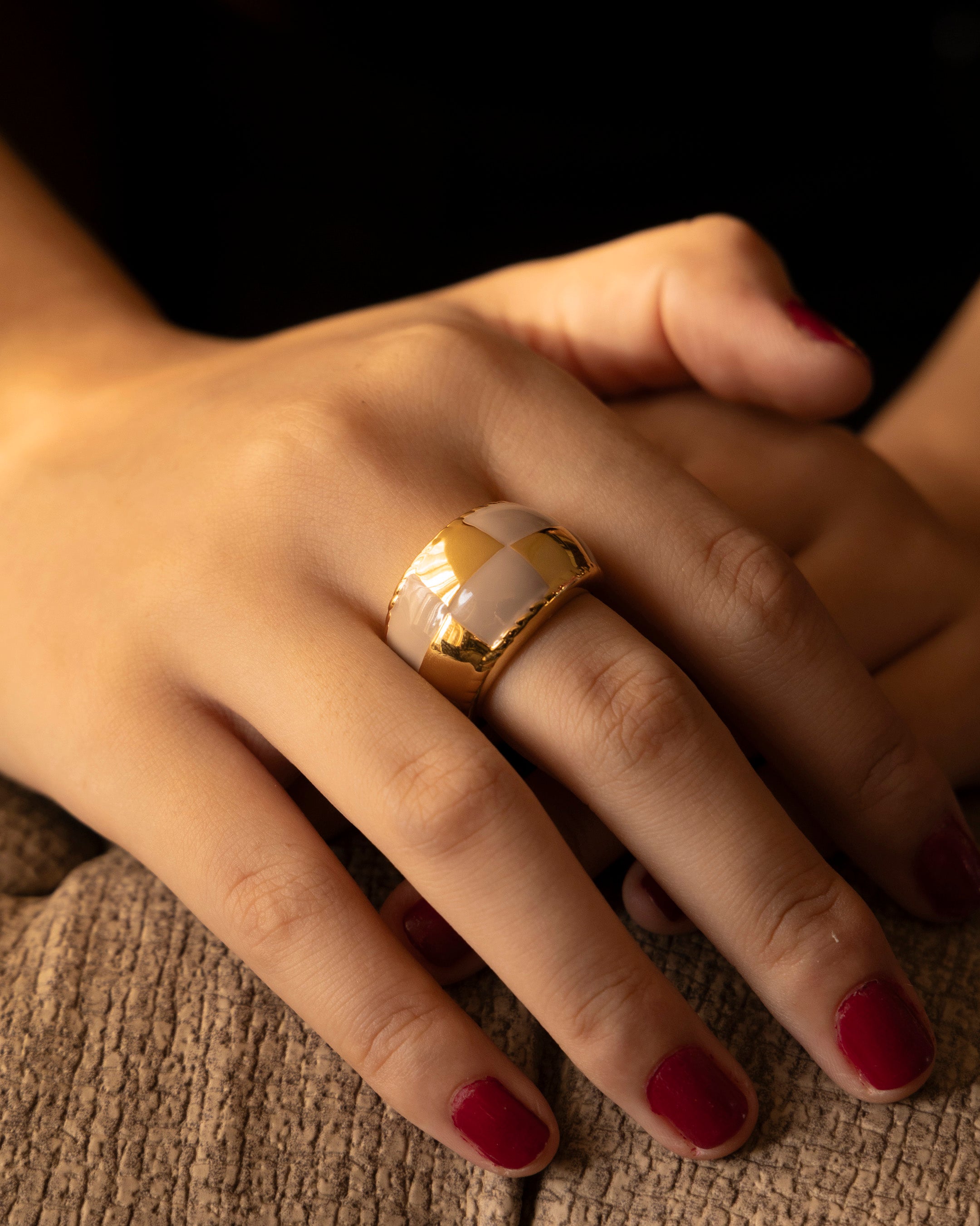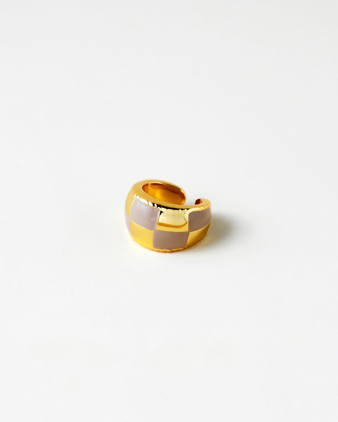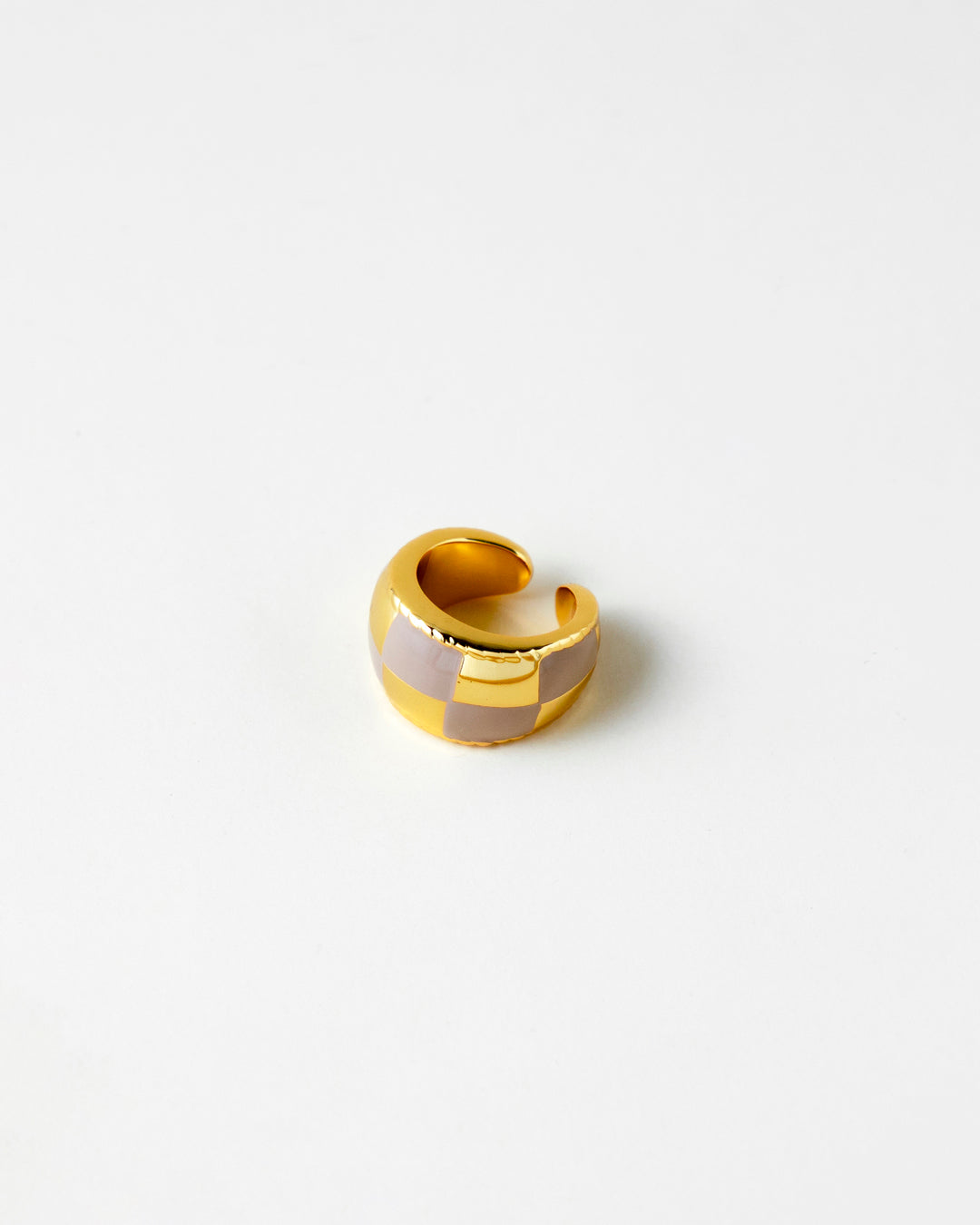A little chunky, a little quiet - The Eva Ring is where softness meets structure. With muted blush enamel in a checker-tile layout against polished gold, this piece brings a certain hush to statement dressing. Think sculptural and sleek, but never loud. For the woman who wears stillness like silk. Wear it with: layered neutrals, fresh nails, and unspoken confidence.