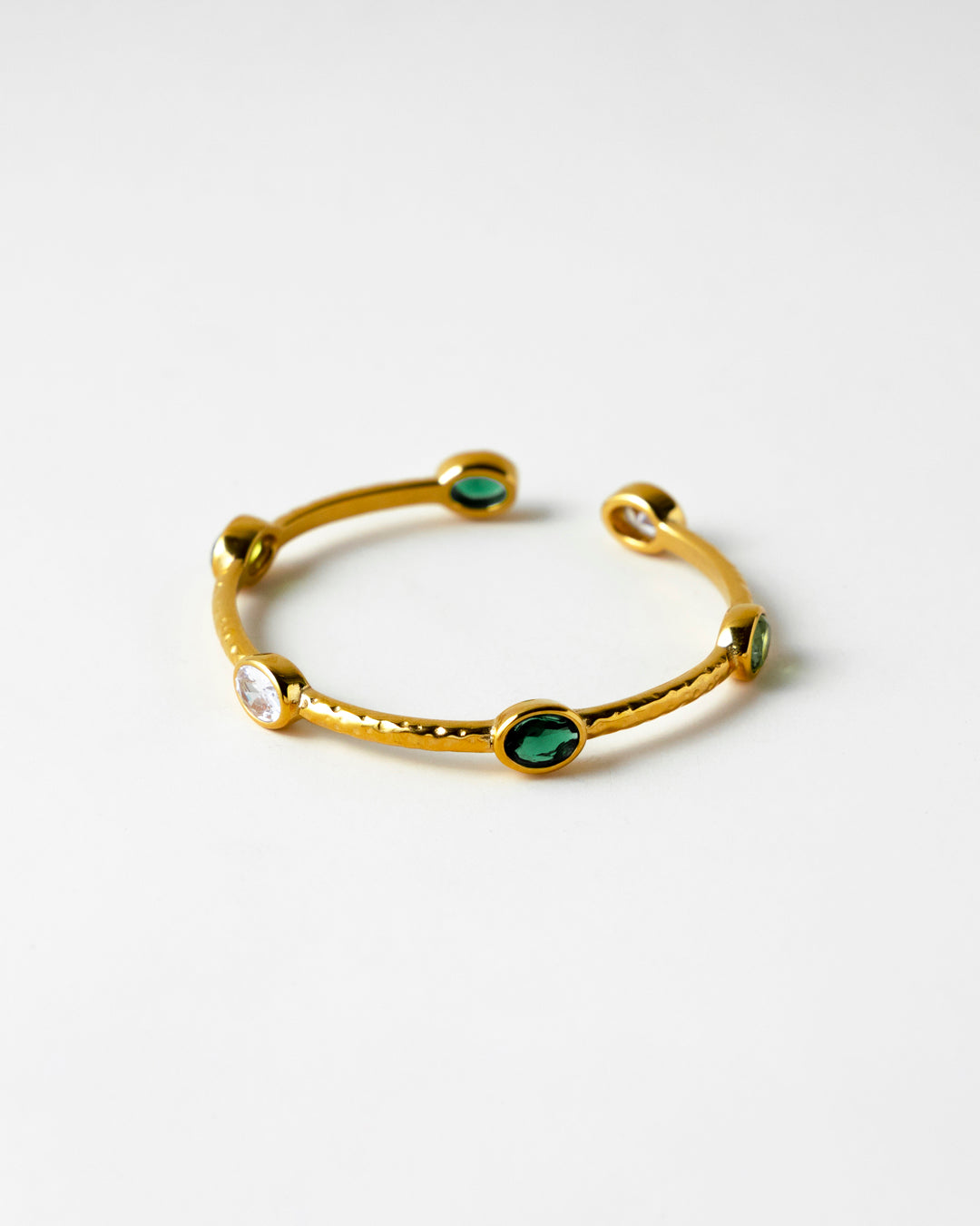 A relic from a forgotten realm - The Nomad Cuff feels like something unearthed from an ancient prophecy. Etched with hammered texture and inlaid with alternating emerald and crystal stones, it carries whispers of protection, insight, and divine timing. Crafted in molten-look gold with a hand-forged finish, the cuff wraps the wrist in a quiet kind of power. Five bezel-set stones encircle the piece - a symbolic nod to the five senses, five elements, or five questions only you can answer.