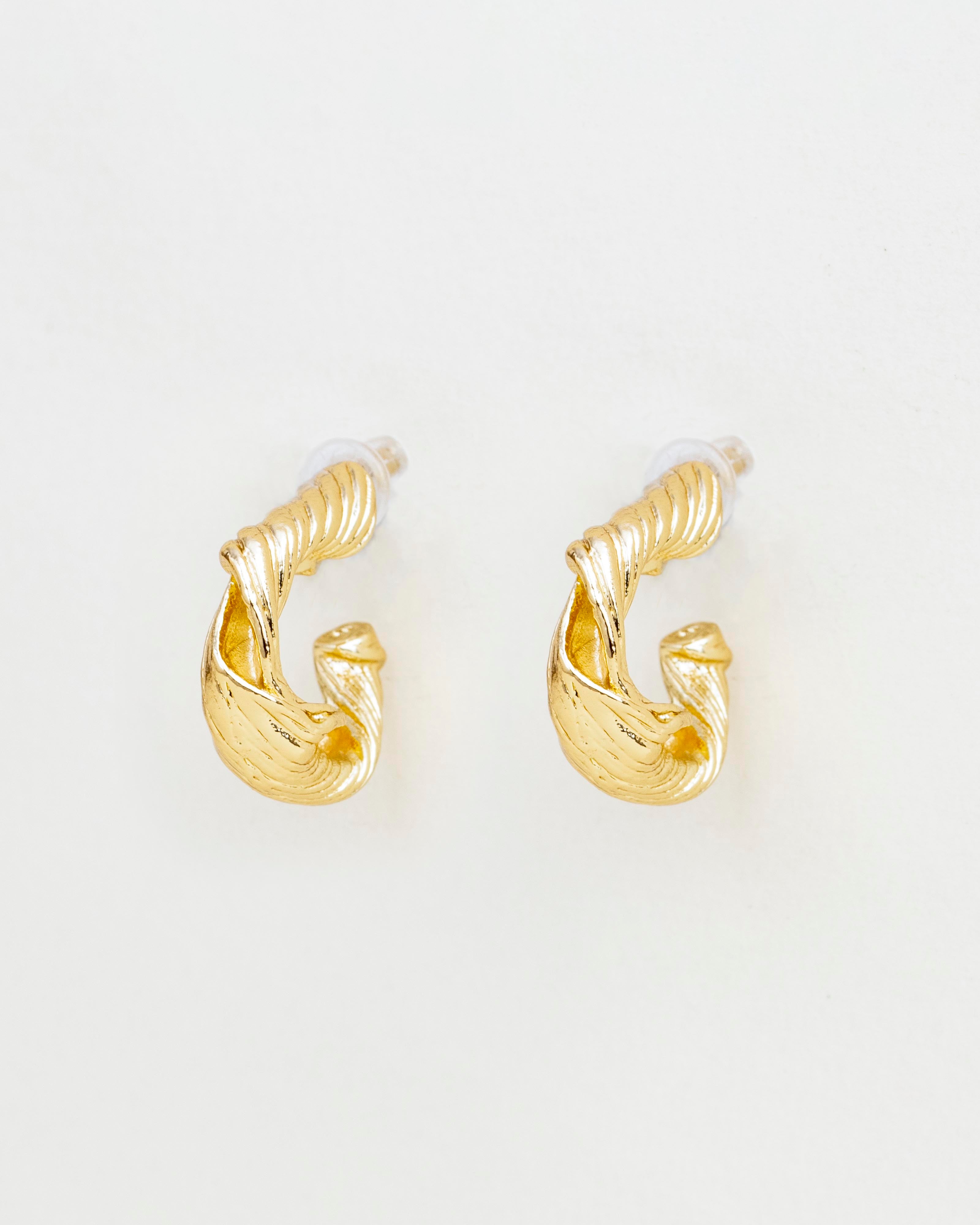 These lightweight, ripple-like hoops feature twisted detailing reminiscent of a gentle stream. Effortlessly versatile, they add a touch of texture to your look while maintaining a classic, timeless feel. Pair them with delicate huggies for a curated ear stack that balances boldness and subtlety.