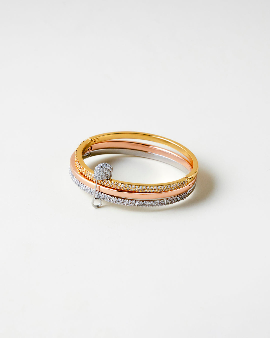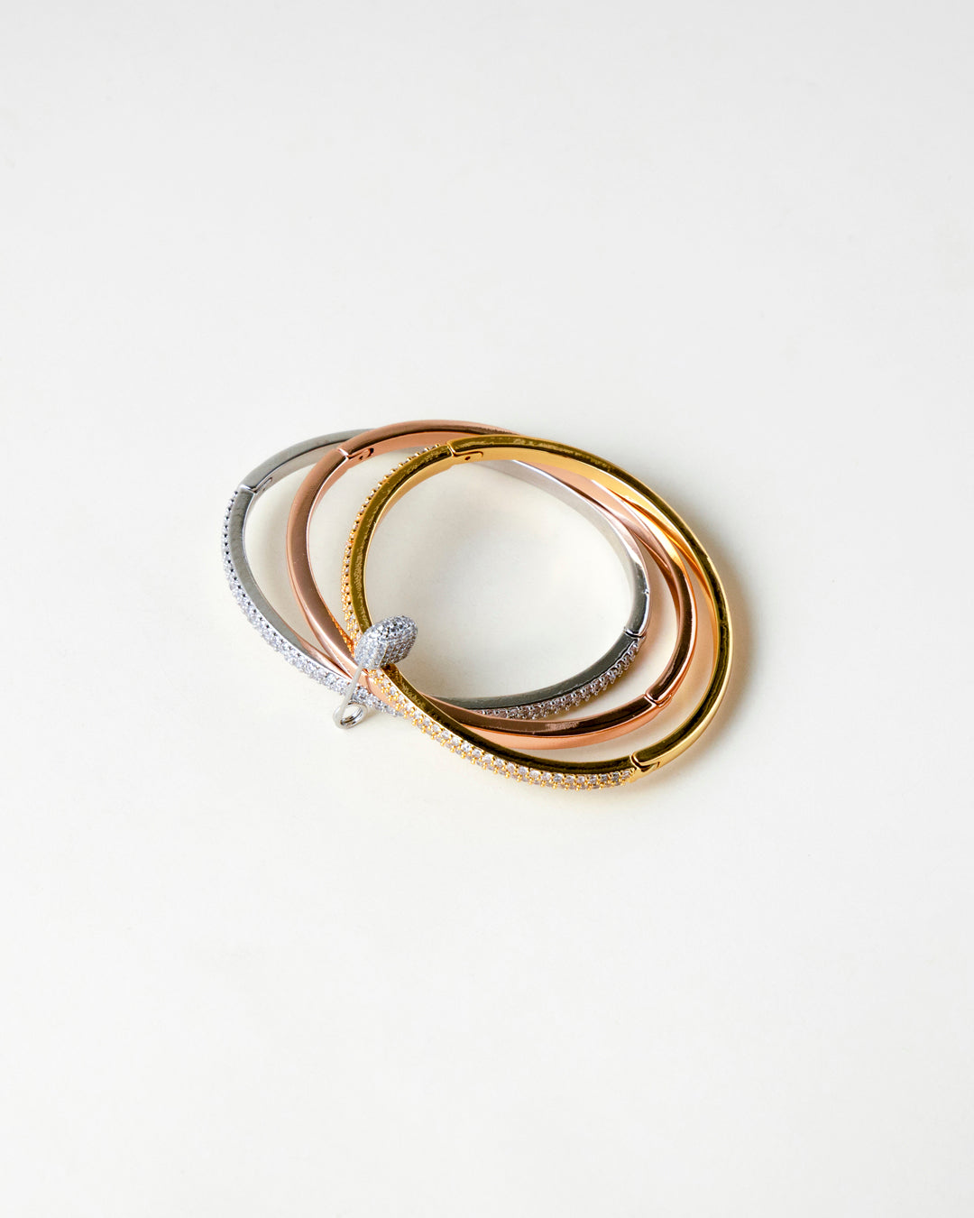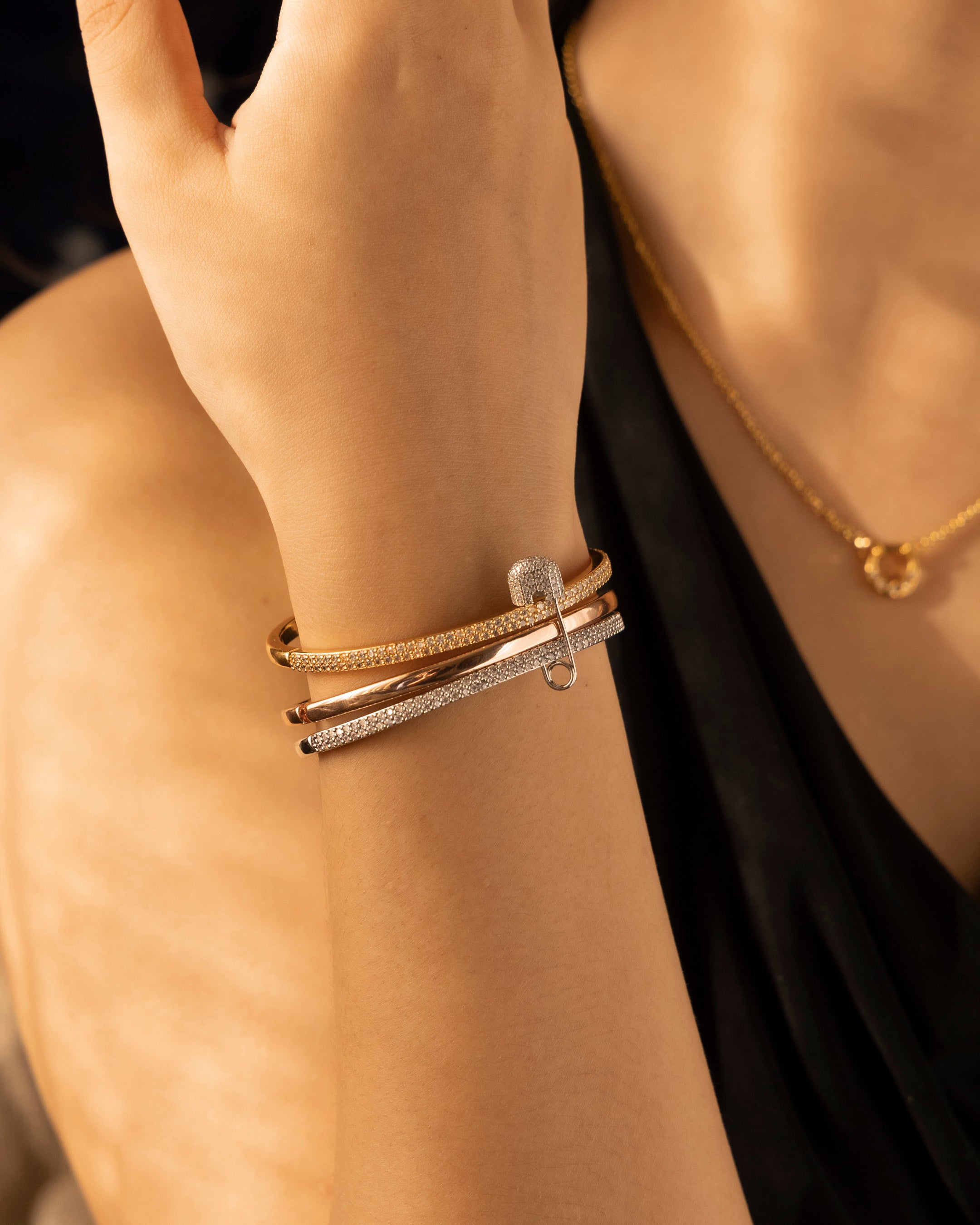 A subtle kind of symphony, the Triad Bangle Stack brings together three interlocked bangles in a polished, rose-gold finish, each with its own unique texture and glint. One is smooth and minimal, the second is dusted with shimmering micro-engraved detail, and the third offers a matte gleam that catches the light in hushed waves. Together, they create movement, harmony, and a rhythm that shifts with you through the day.